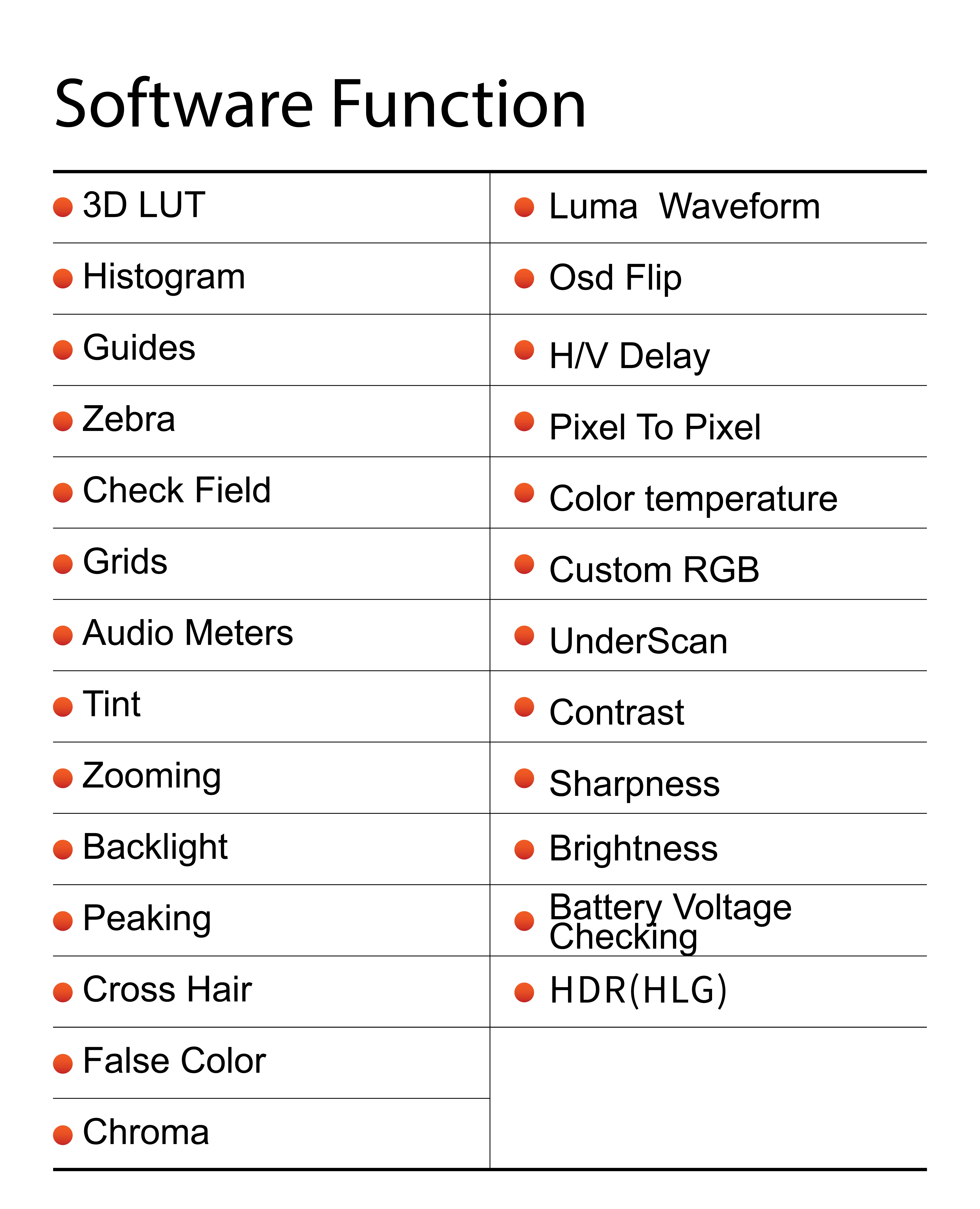 3D LUT, Histogram, Aspect, New Peaking, DSLR Scaling, zoming, Audio Post, False Color, Pixel to Pixel...