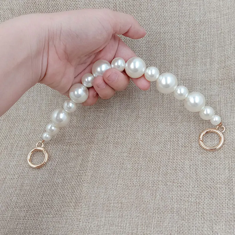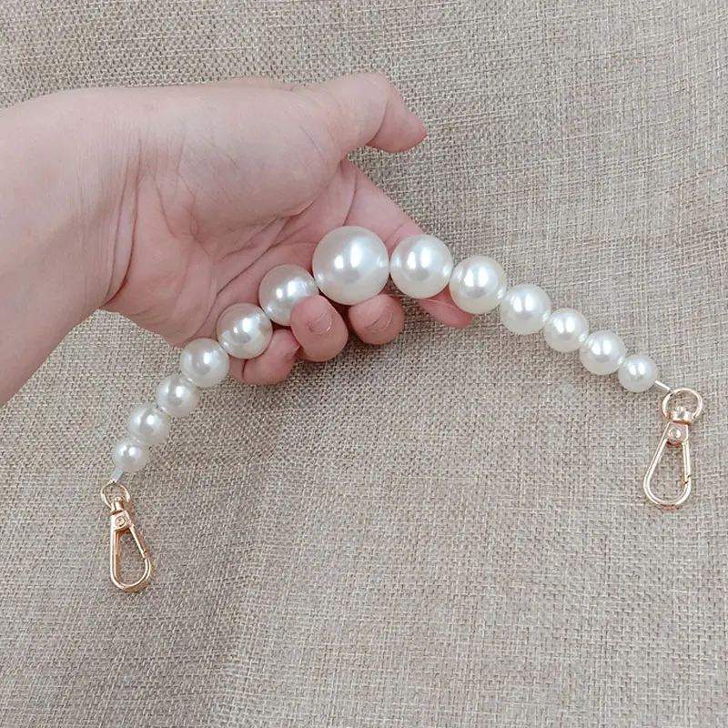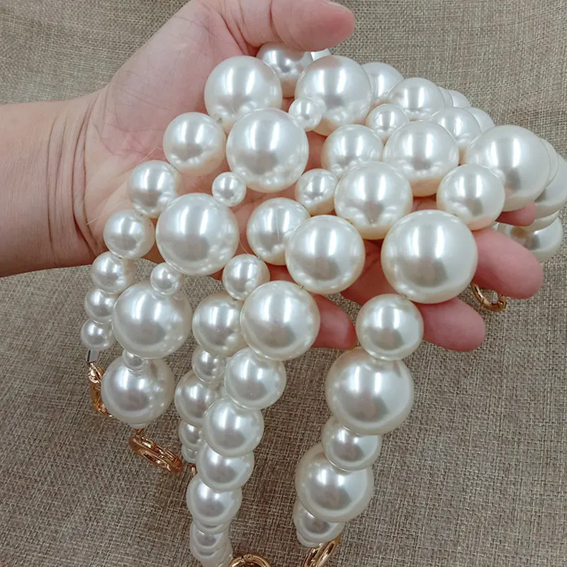 Имитация жемчуга постепенный смешанный бисер цепи могут быть подобраны со многими типами сумок, и он также может быть использован как мобильный телефон ремешок. Есть два типа катушек, золото и серебро.