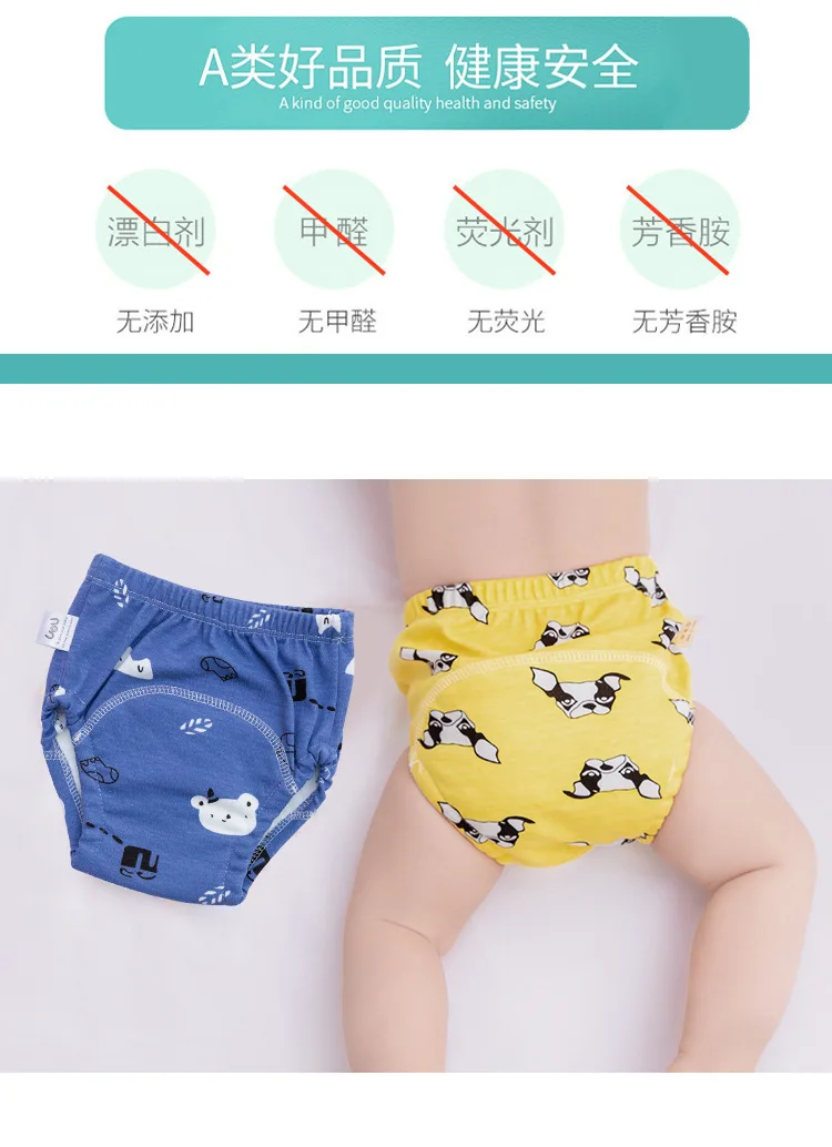 Штаны для учебыСпециально разработаны для обучения ребенка мочиться. Штаны для учебы отличаются от обычного нижнего белья. Промежность имеет толстый абсорбирующий и водонепроницаемый дизайн,Который может хранить часть объема мочи,Моча переливается при большом количестве мочи. Так что ребенок не будет мочиться на одежде, на земле. Везде только мокрая промежность, и ребенок будет чувствовать себя некомфортно, если промежность влажная. Спустя долгое время малыш будет знать, что снимает штаны, говорит маме, что ему нужно пописать, и постепенно научится писать самостоятельно.