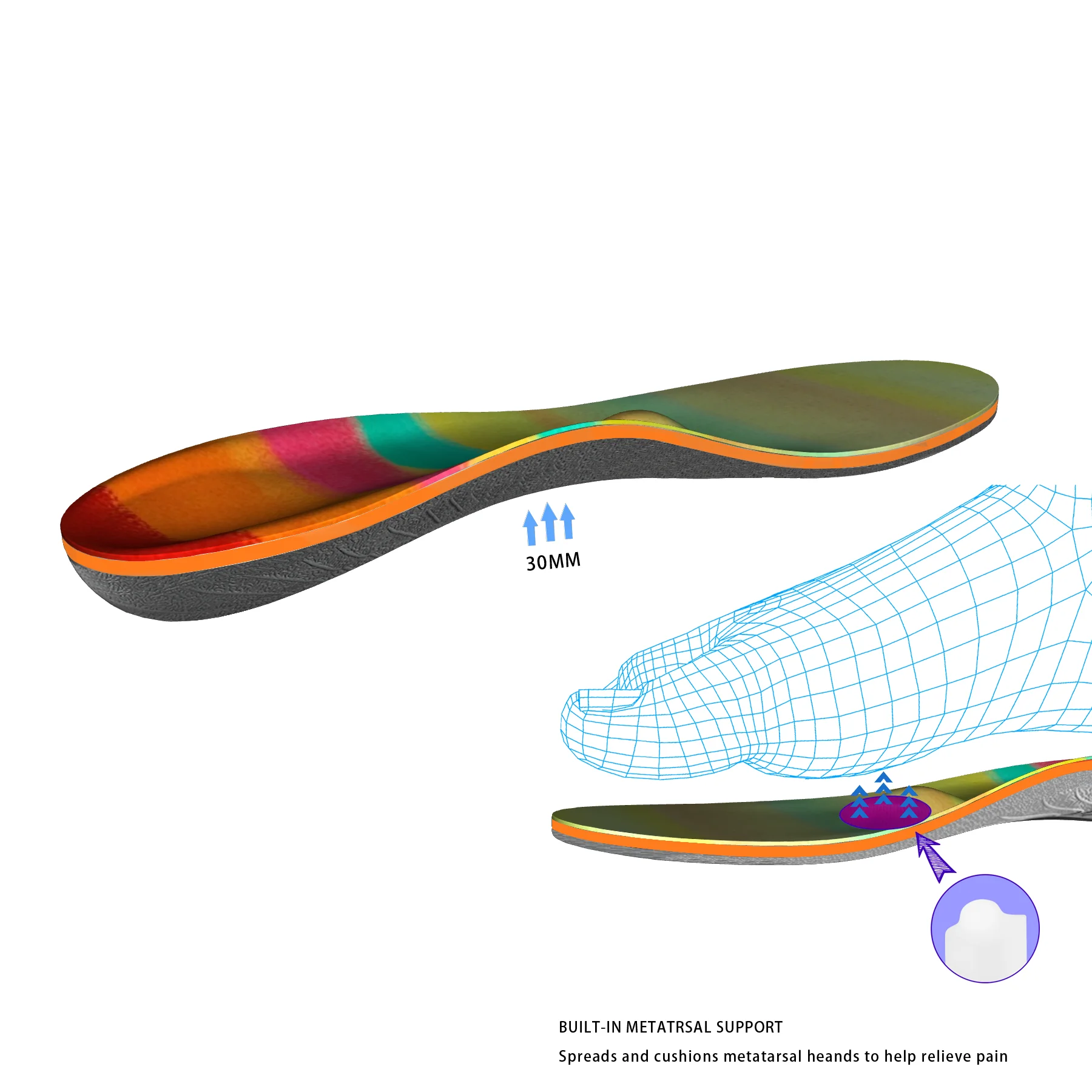 Метатарзальный опора подушки имеют функцию массажа. Они могут чувствовать себя неровными, когда вы их надеваете. Ваши ноги могут чувствовать себя некомфортно, но они могут уменьшить давление и усталость ваших ног. Высота дужки стопы составляет 30 мм, что обеспечивает поддержку свода и комфорт для пациентов с подошвенным фасциитом и болью в пятке и повышает стабильность.