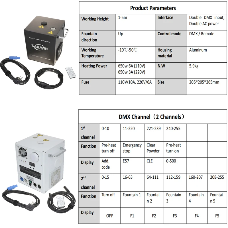 DMX SPARK холодная машина:https:/youtu.be/05bb8wFLkB8https:/youtu.be/DxqOQIeXHQshttps:/youtu.be/DxqOQIeXHQsЗначение канала DMX000 до 007 и 017 до 063-нет функцииОт 008 до 016-остановка нагрева064-128-низкий выход129-196-Средний выходОт 197 до 255-Max выходУпаковочный лист: