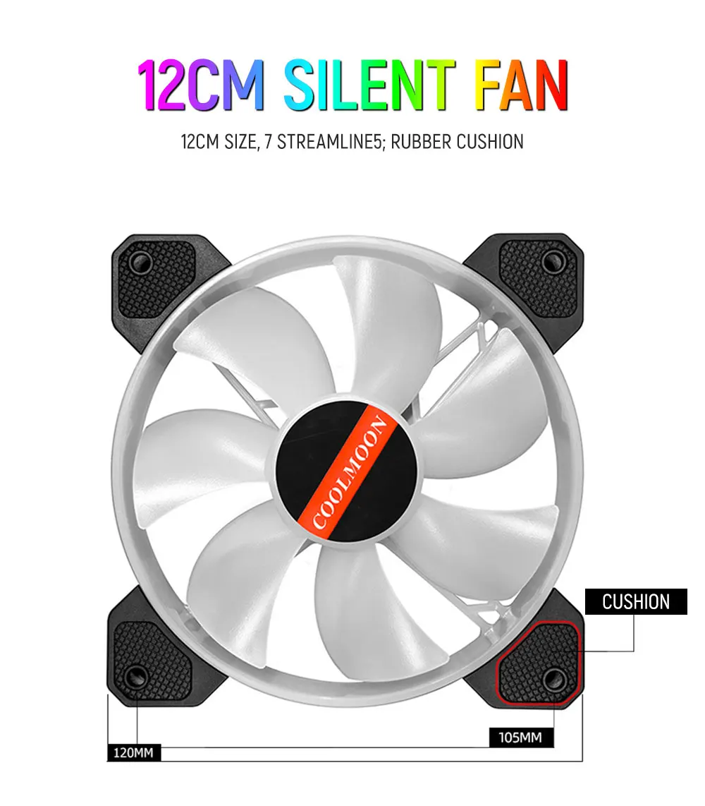 1. Этот вентилятор имеет дизайн размером 12 см, 7 обтекаемых лопастей, большой объем воздуха и давление, стабильный поток воздуха и эффективное рассеивание тепла. 2. Четыре угла оснащены резиновыми амортизирующими прокладками для уменьшения резонанса между вентилятором и корпусом и эффективного снижения шума. 3. Гидравлический подшипник, обратная гидравлическая цепь, более длительный срок службы, тише и прочнее. 4. Высококачественная рама вентилятора, полнокадровый светящийся дизайн, прозрачный и несветильник вой эффект, очень круто.