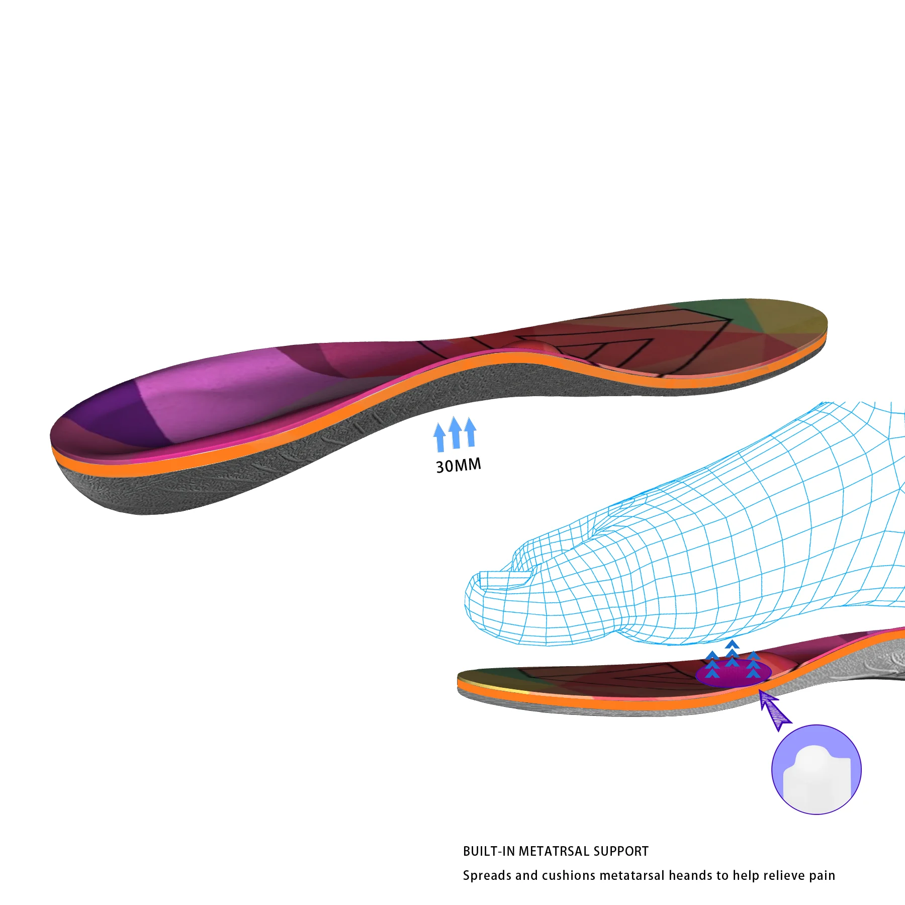Метатарзальный опора подушки имеют функцию массажа. Они могут чувствовать себя неровными, когда вы их надеваете. Ваши ноги могут чувствовать себя некомфортно, но они могут уменьшить давление и усталость ваших ног. Высота дужки стопы составляет 30 мм, что обеспечивает поддержку свода и комфорт для пациентов с подошвенным фасциитом и болью в пятке и повышает стабильность.