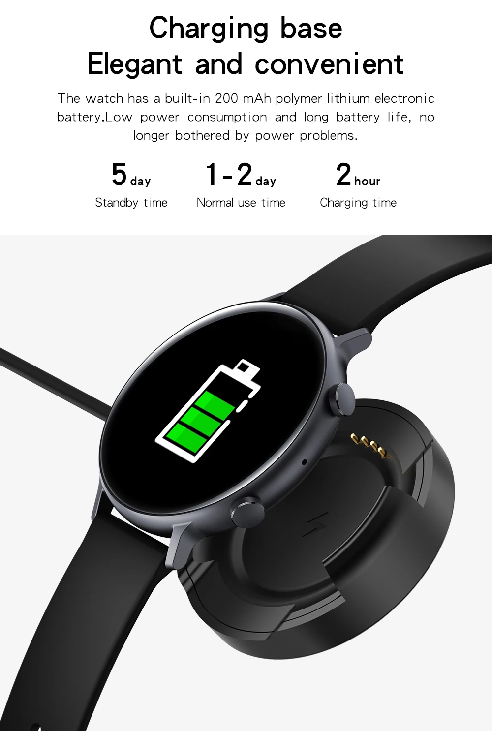 Часы имеют встроенный полимерный литиевый электронный аккумулятор емкостью 200 мАч, низкое энергопотребление и длительный срок службы батареи, нет
