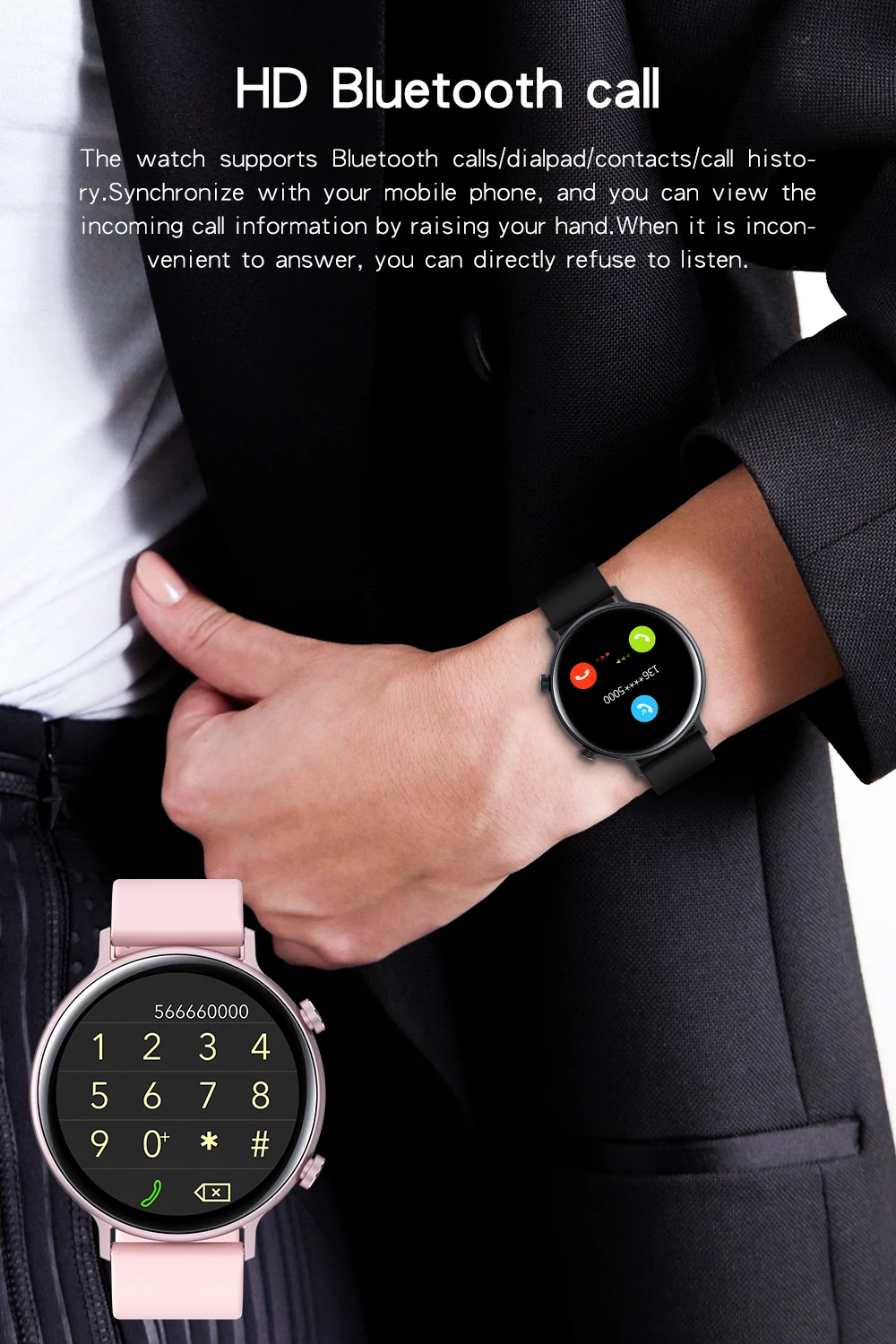 Часы поддерживают BT телефонные звонки/диалекты/контакты/синхронизацию всех histo ry с вашим мобильный телефон, и вы можете просматривать информацию о входящем вызове, подняв руку. Если вы ответите на это, вы можете напрямую отказаться от прослушивания