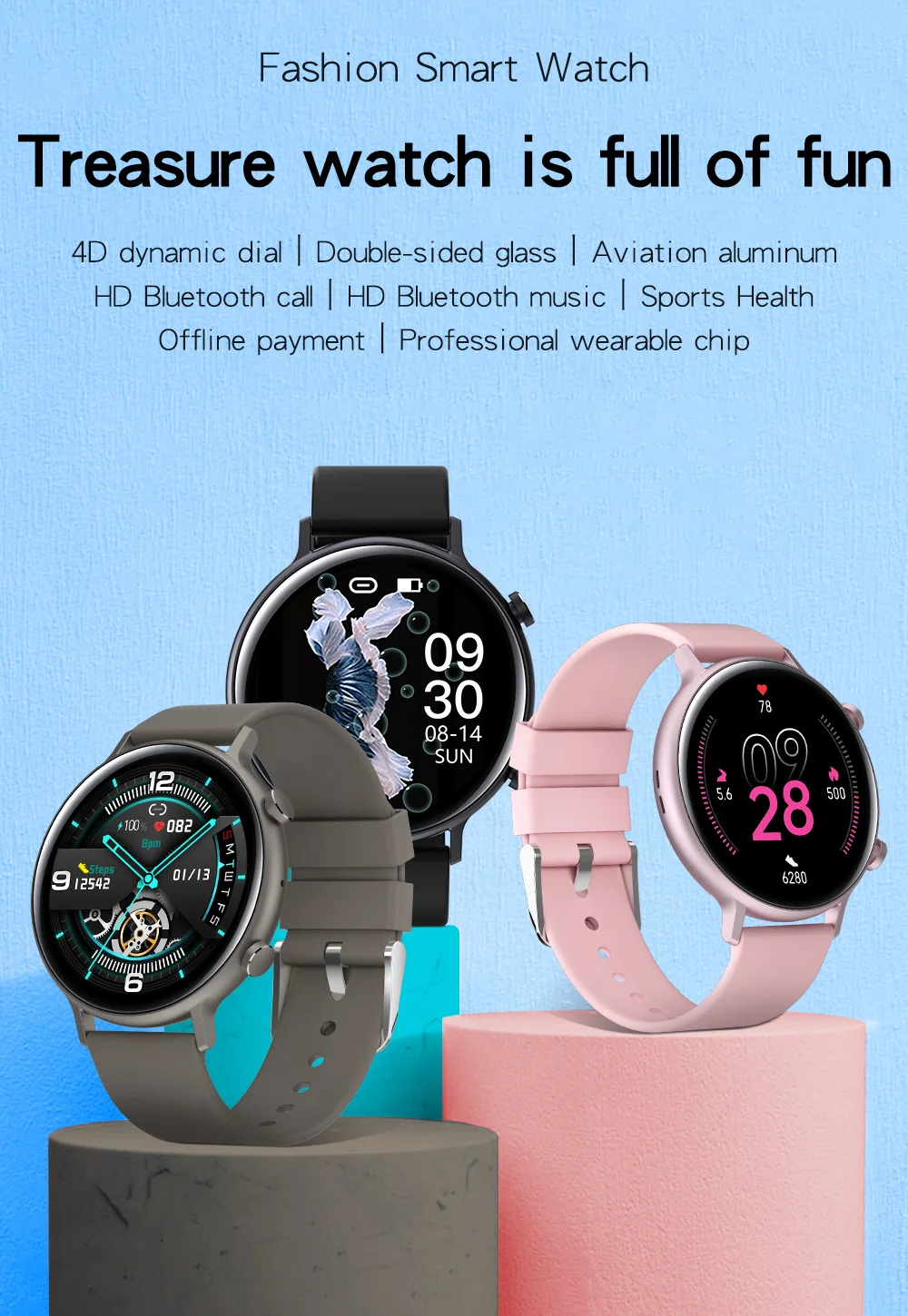 1,28 дюймов полноцветный угол обзора, разрешение 240*240 HD. Оснащен 2. 5D изогнутым стеклянным покрытием и 3D сферическим стеклянным нижним покрытием и корпусом из авиационного алюминиевого сплава. Настоящие материалы. Четкий и деликатный эффект дисплея, briliant цвета. Ремешок и уши корпуса обтекаются в целом, и indi viduality не предполагает