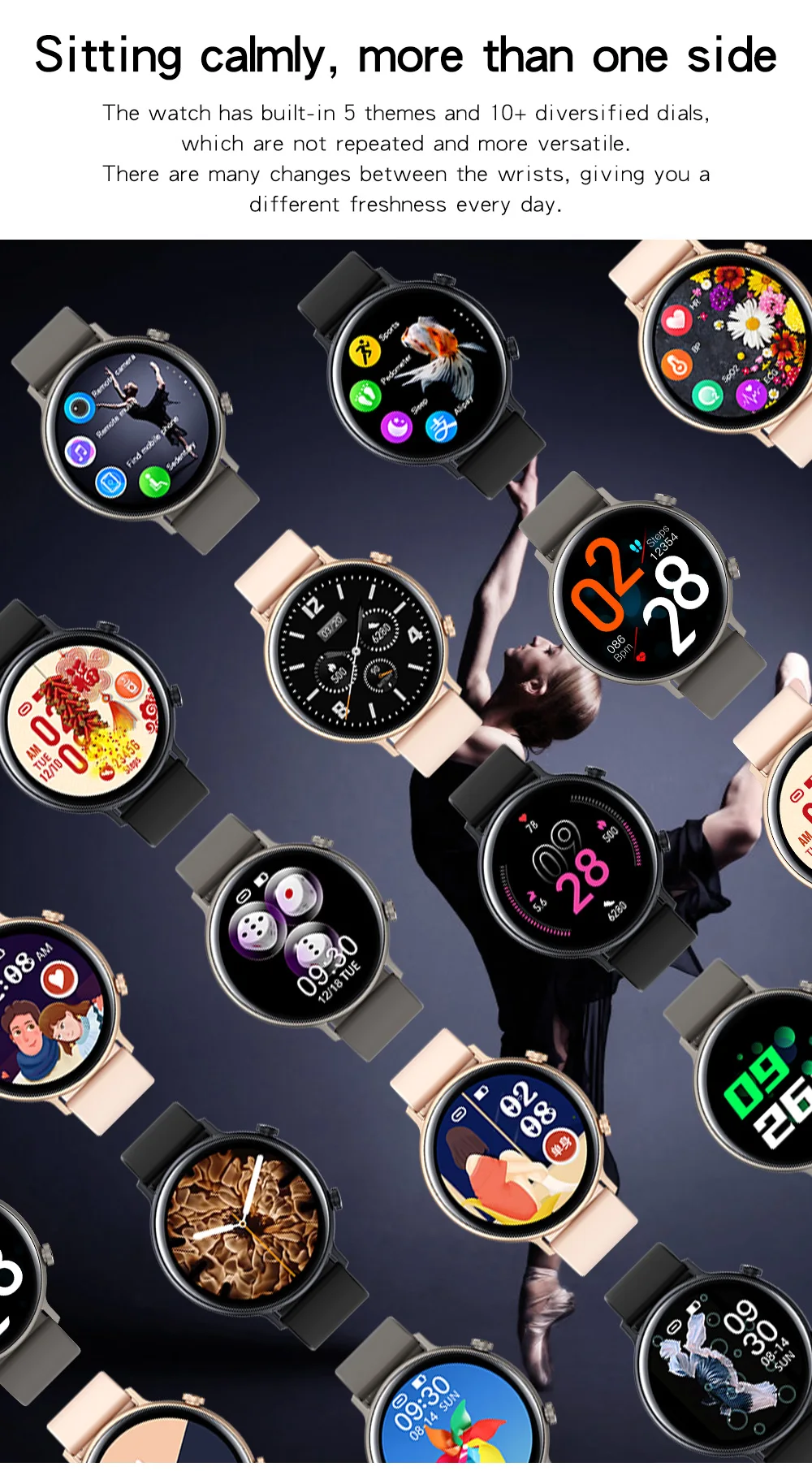 Часы встроены в 5 тем и 10 + разнообразных циферблатов, которые не повторяются и более универсальны.
