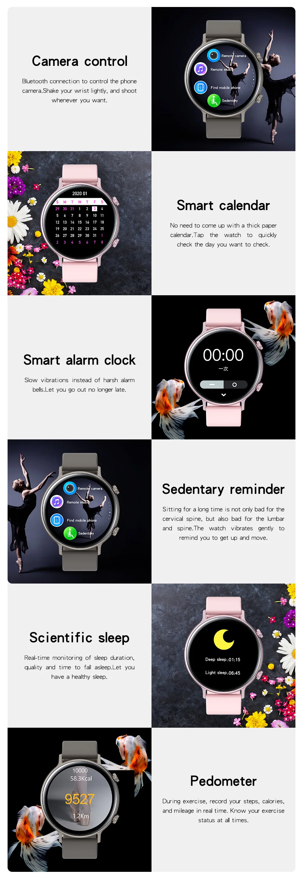 BT-совместимые телефонные звонки, BT-совместимая музыка, 4D динамические часы лица, синхронизация уведомлений, будильник, секундомер, режим DND, поднимите запястье, чтобы разбудить часы, найти мой телефон, пульт дистанционного управления камерой, календарь и т. Д.