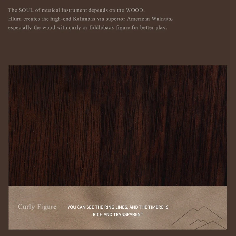 Душа музыкального инструмента исходит из дерева. В тигровой расцветки, деревянные американского натурального черного ореха выбирается в качестве материала. Текстура естественная и деликатная, а структура однородная, что делает тон богаче и высокий уровень поддержки дольше.