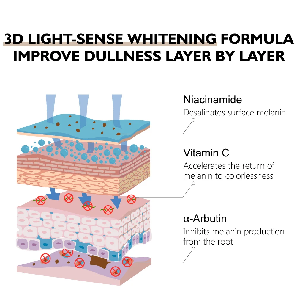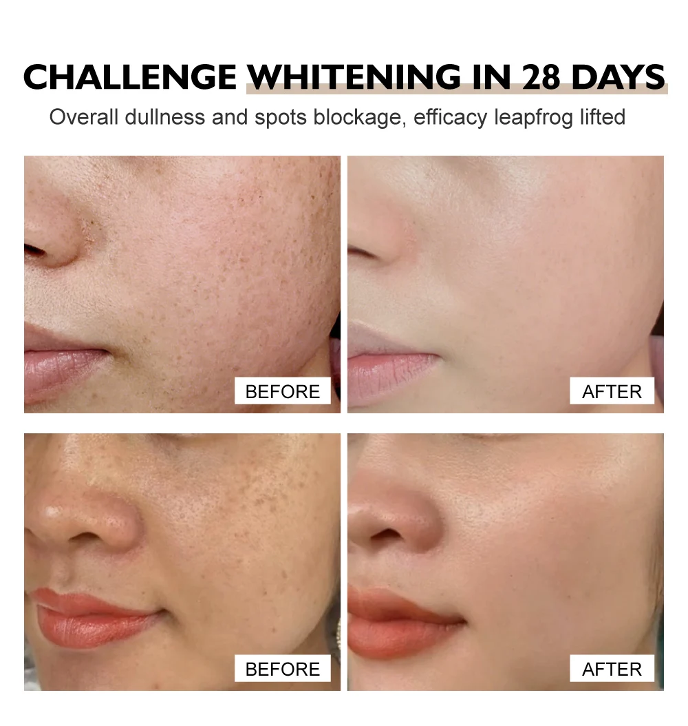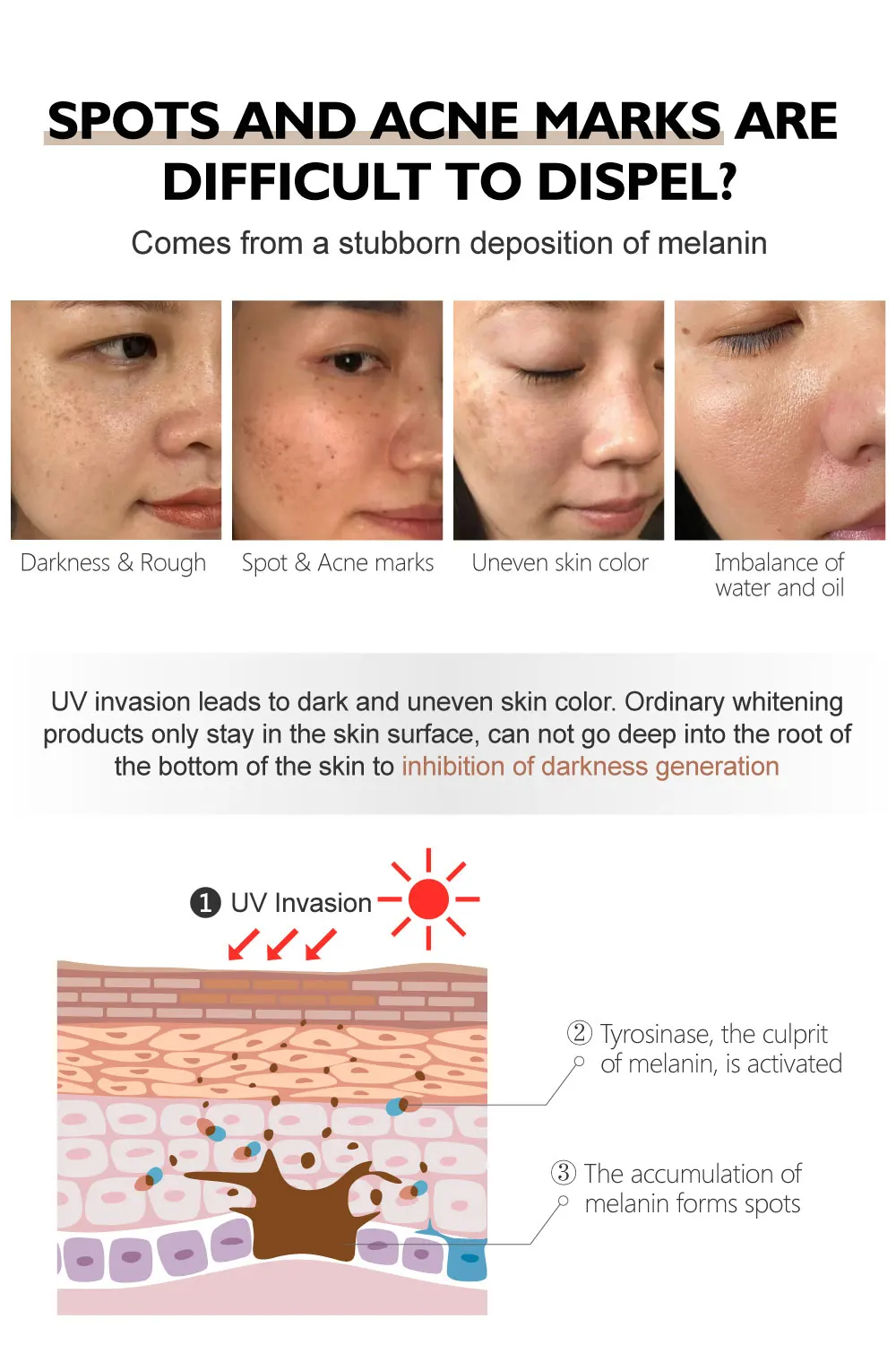 УФ-излучение приводит к темному и неровному цвету кожи. Обычные отбеливающие продукты остаются только на поверхности кожи, не могут углубиться в корень нижней части кожи, чтобы подавить образование тьмы