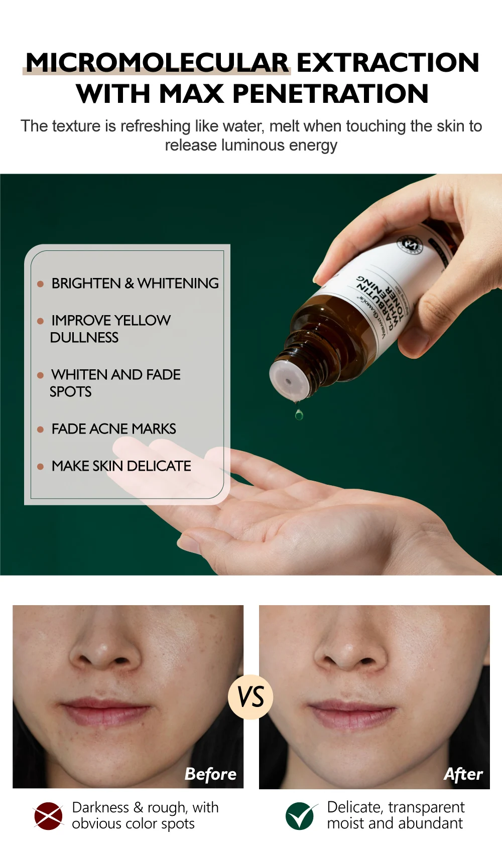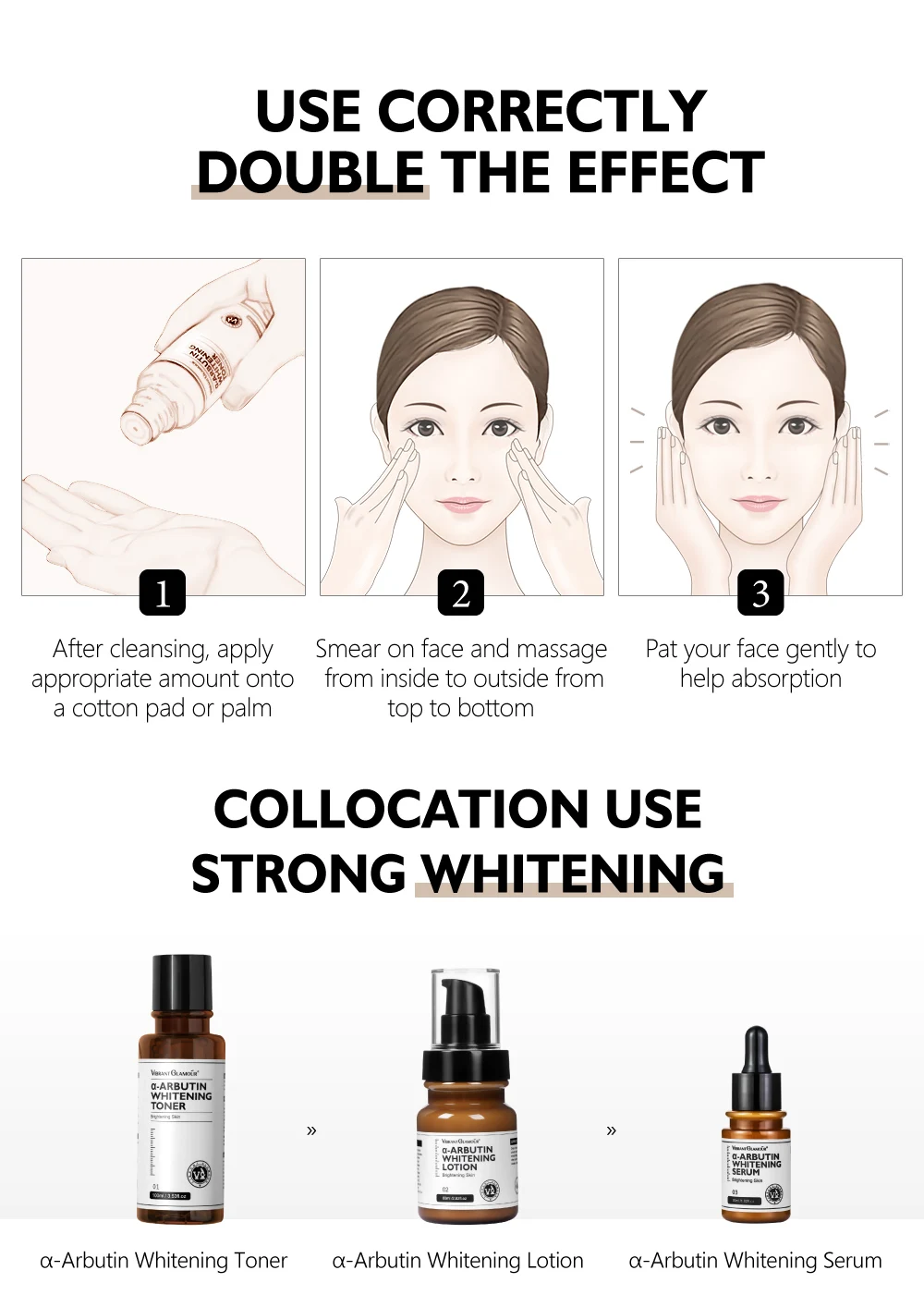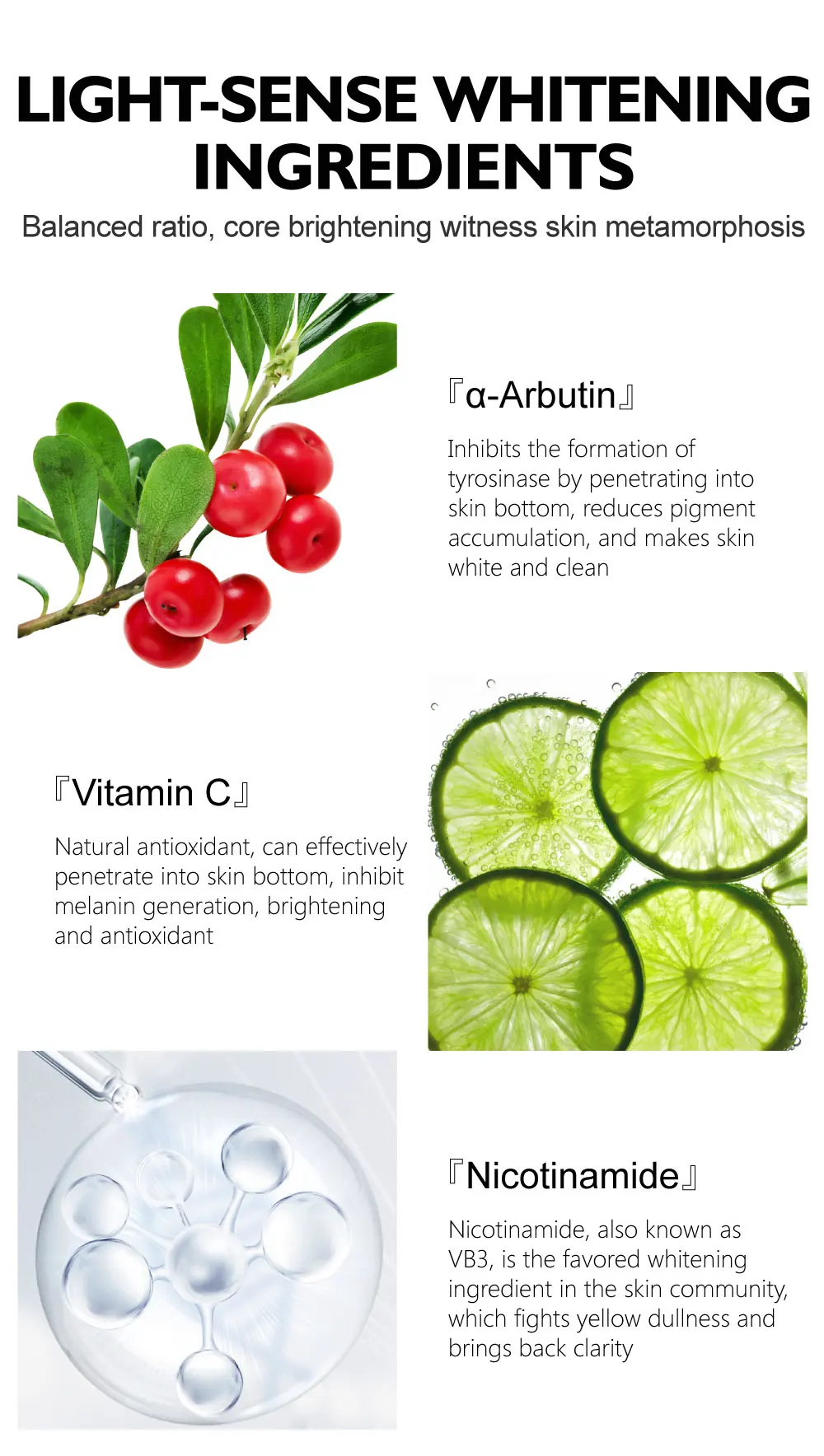 УФ-излучение приводит к темному и неровному цвету кожи. Обычные отбеливающие продукты остаются только на поверхности кожи, не могут углубиться в корень нижней части кожи, чтобы подавить образование тьмы