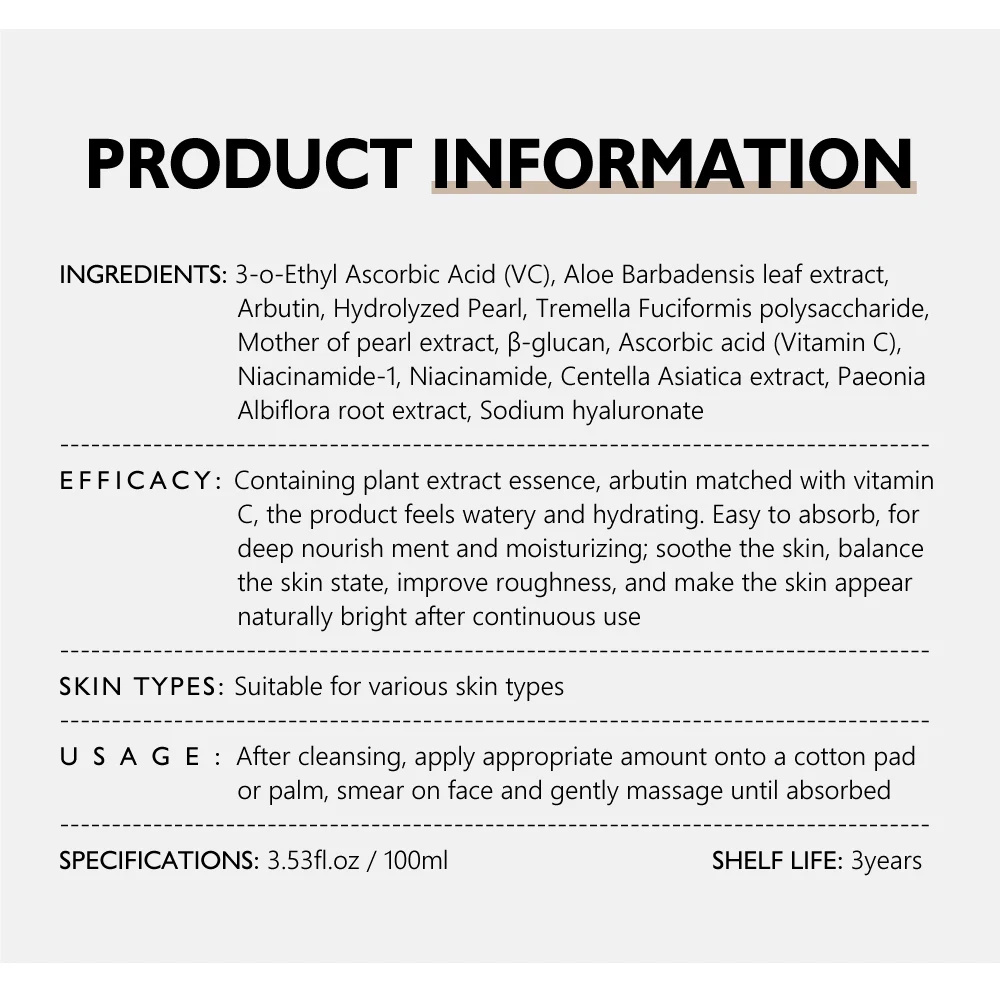 Эффективность: содержащий экстракт растения эссенция, арбутин, сочетаемый с витаминc C, продукт ощущается водянистым и увлажняющим. Легко впитывается, для глубокого питания и увлажнения; Успокаивает кожу, балансирует состояние кожи, улучшает шероховатость, и делает кожу естественным ярким после непрерывного использования