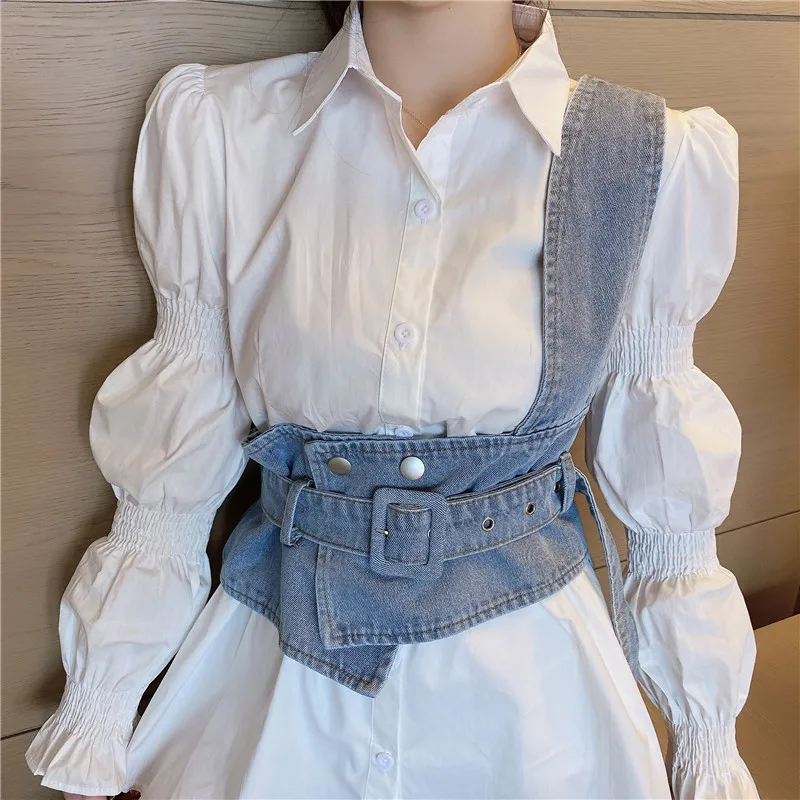 Женское мини-платье с пышными рукавами, однобортное платье-рубашка с джинсовым асимметричным ковбойским жилетом, комплект из двух предметов, спортивный костюм Z999