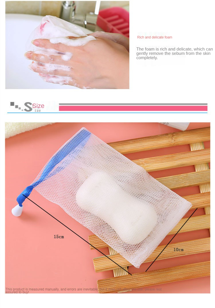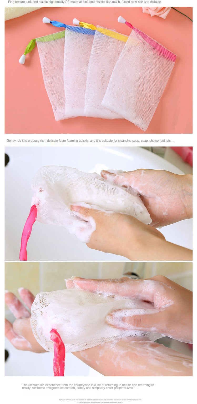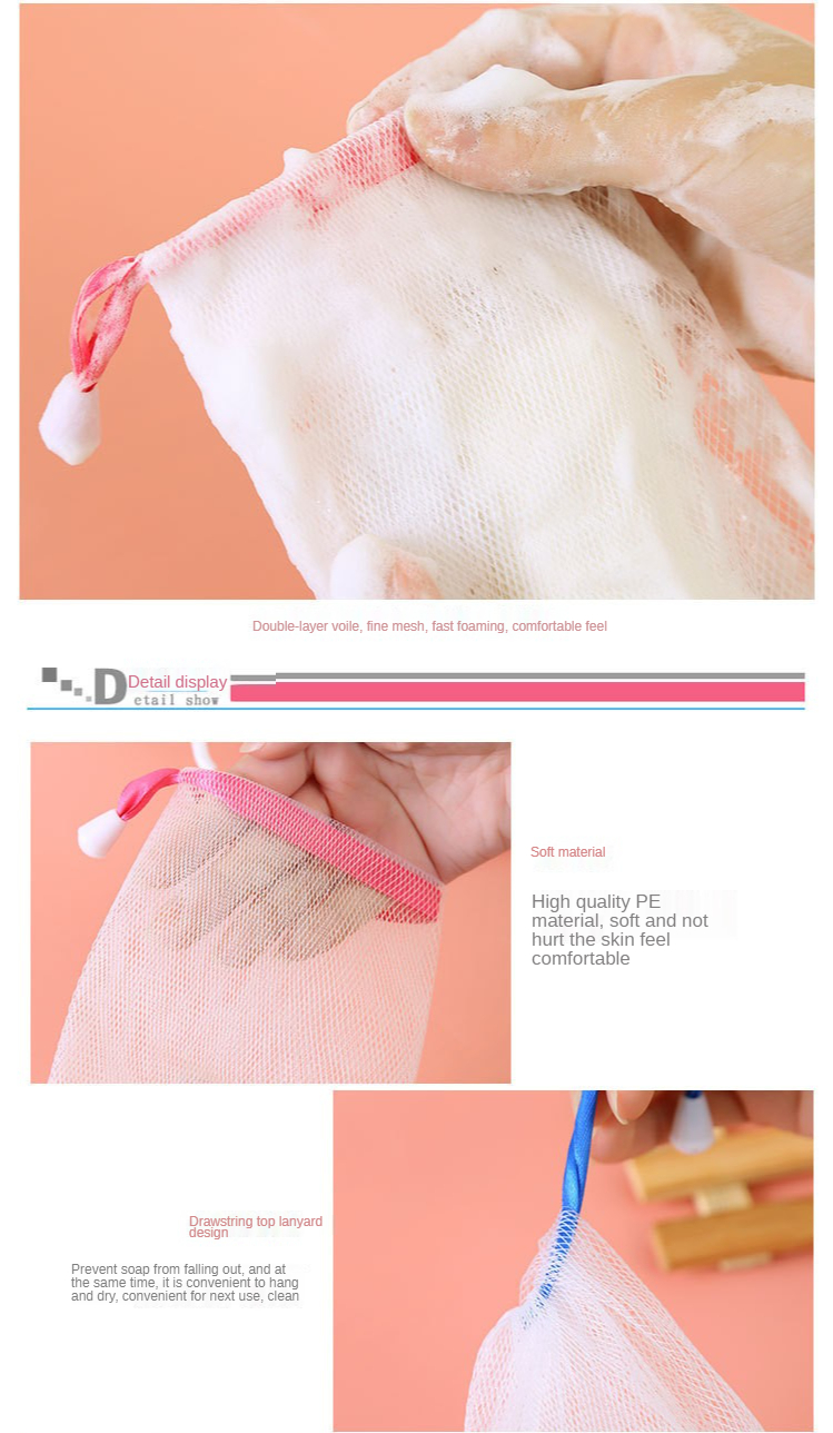 Сама пенящаяся сетка мягкая, не повреждает кожу и легко создает пену. Его можно использовать для очистки всего тела и улучшения кожи, начиная с лица, и использовать его с некоторыми чистящими средствами для достижения лучших результатов. Очистите пеной, легко удалите пятна, позаботьтесь о коже, нежной и мягкой, не грубой. Он занимает небольшое пространство, удобно носить с собой и может использоваться в любое время и в любом месте. Поставляется с ремешком для легкой сушки и удобной ручной работы.