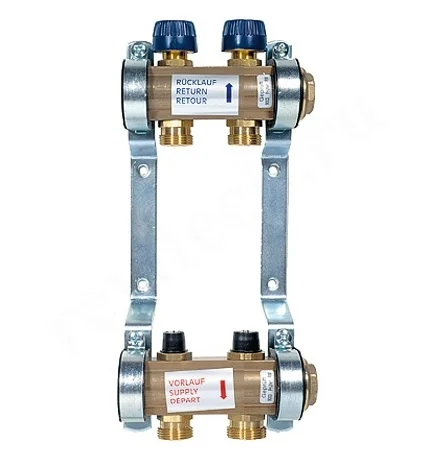 Manifold 1 "for floor heating, consisting of two profiled brass pipes mounted on soundproof brackets, with the possibility of" versatile ".