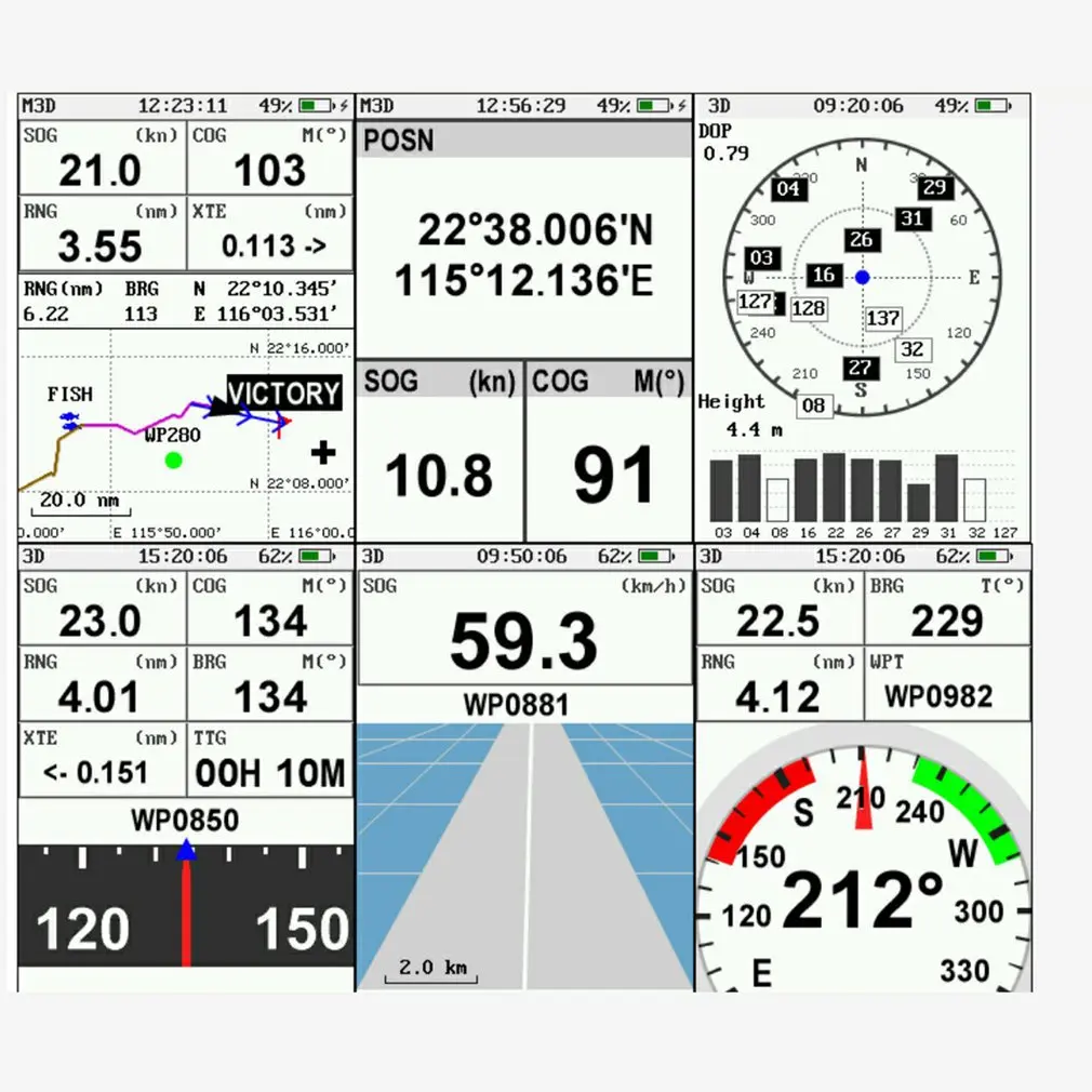 3. Экран с несколькими дисплеями: плоттер, шоссе, рулевое управление, спутник, счетчик SOG, счетчик COG и экран данных пользователя.