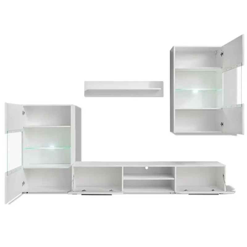 Набор, состоящий из настенного блока, напольного блока, двух ТВ-блоков и настенной полки, обеспечивает достаточно места для хранения ваших мультимедийных устройств, книг и всех видов мелких предметов. Также идеально подходит для размещения декоративных предметов, фоторамок или даже цветочных горшков. ТВ-шкафы с выпадающими дверями обеспечивают много места для размещения ваших книг, предметов первой необходимости, dvd-плееров, медиа и т. Д. Хорошо организованы. Настенный шкаф и напольный блок оснащены частично застекленной дверью и тремя полками, включая стеклянную полку с энергосберегающим светодиодный осветительным прибором.