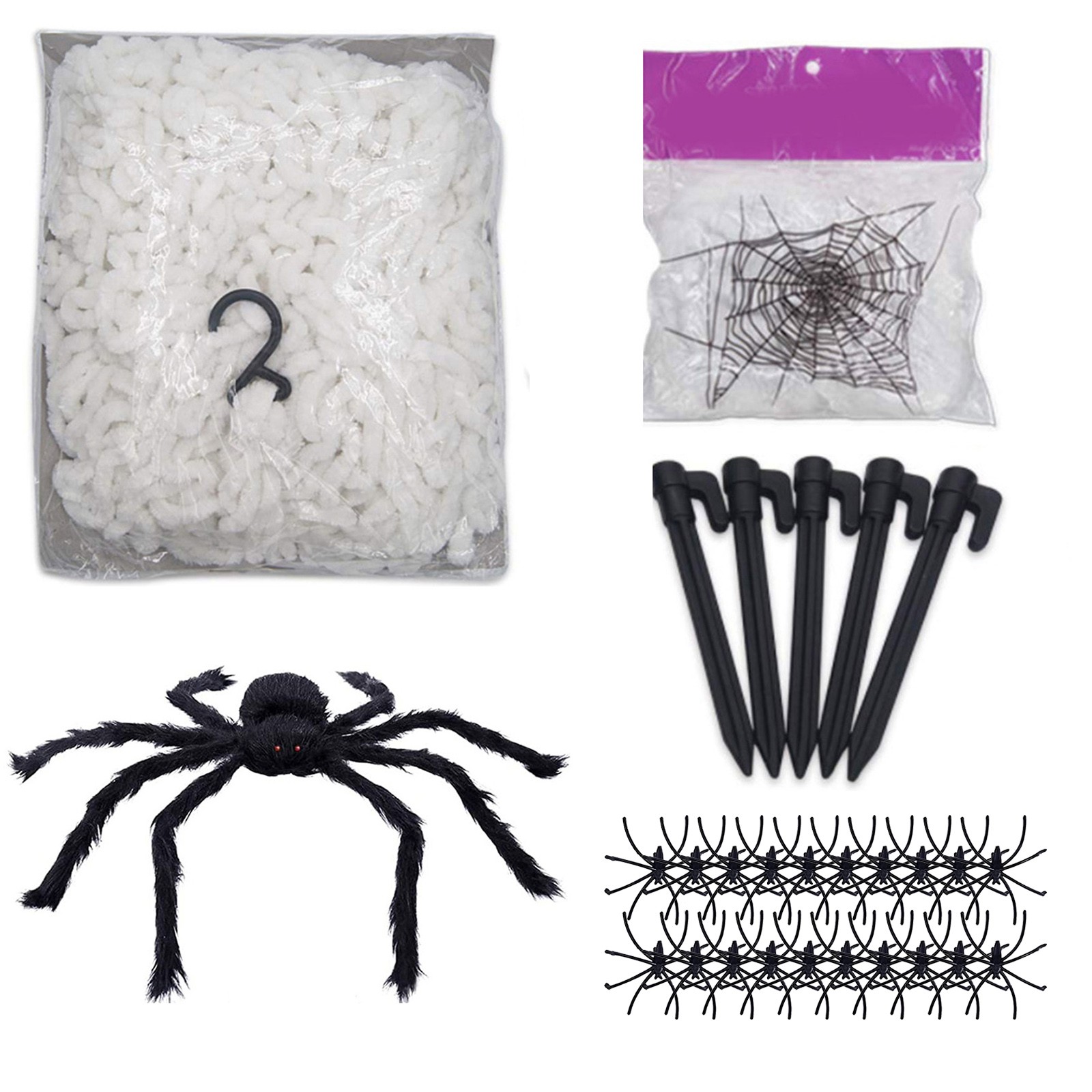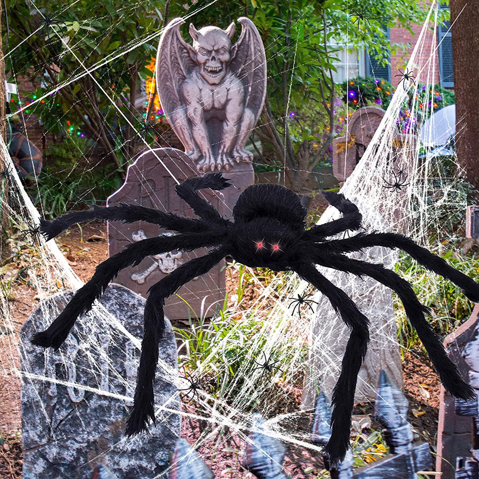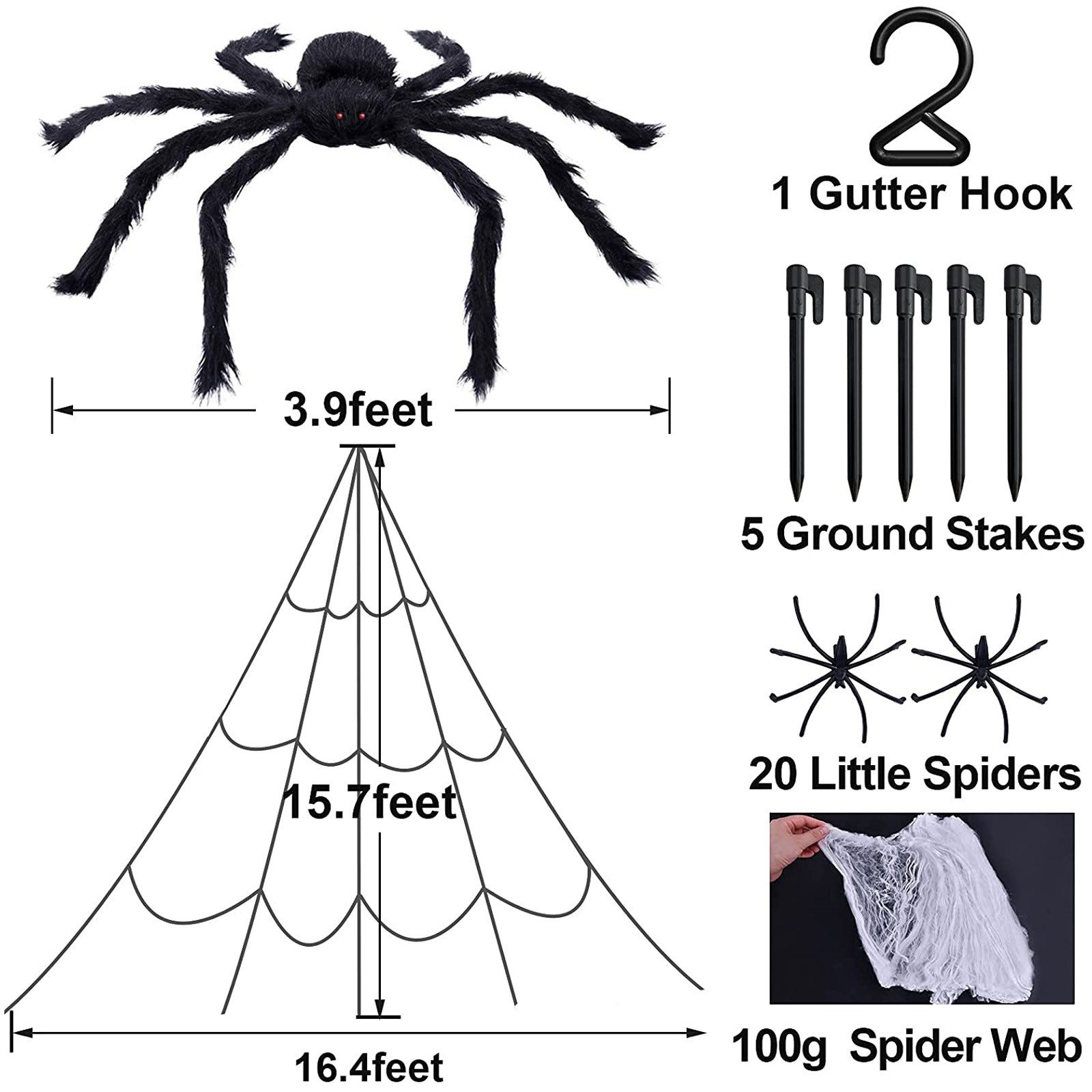 Features: 【Giant Value Pack】: This Halloween decorations come with 16.4*15.7Ft giant spider web, 47''Huge Halloween spider, 100g Stretchy Spider Webs & 20pcs Small Spiders for Halloween Party, 1 hook (for the gutter) and 5 ground spikes. Well match your Halloween costumes, Halloween string lights and so on, save your time and money. An ideal Halloween gift for your family children and friends! 【Halloween Exclusive Decoration】: The giant spider web set is suitable for creating a thrilling atmosphere, perfect for haunted house party, home party or Halloween party. You also can use it to decorate your courtyard, closets, lawn and other places you want to decorate, adding a mysterious atmosphere to Halloween. 【Selected Materials】: Spiders are made of plush and wire, which has a certain degree of elasticity. Spider's feet can bend and stretch freely and has obvious three-dimensional effect. Spider web made of sturdy, thick polyester rope that allows the net to withstand inclement weather. 【Easy Installation】: Triangular spider web installation is easy and simple. Halloween outdoor decorations spider web includes 1 gutter hook and 5 ground stakes. Just stake the hooked stakes into the ground and hooking the rope to the gutters/wall/tree in whichever direction. The cobwebs can be stretched and then cover anywhere you like. 【Scary Design】: Giant realistic scary spider with long black hairy and creepy red eyes, makes the spider look more realistic. The scary spider decorations can attracts children and adults, perfectly decorate your carnival. Everyone will share in lots of scare and laughter when they see the creepy realistic spider props!
