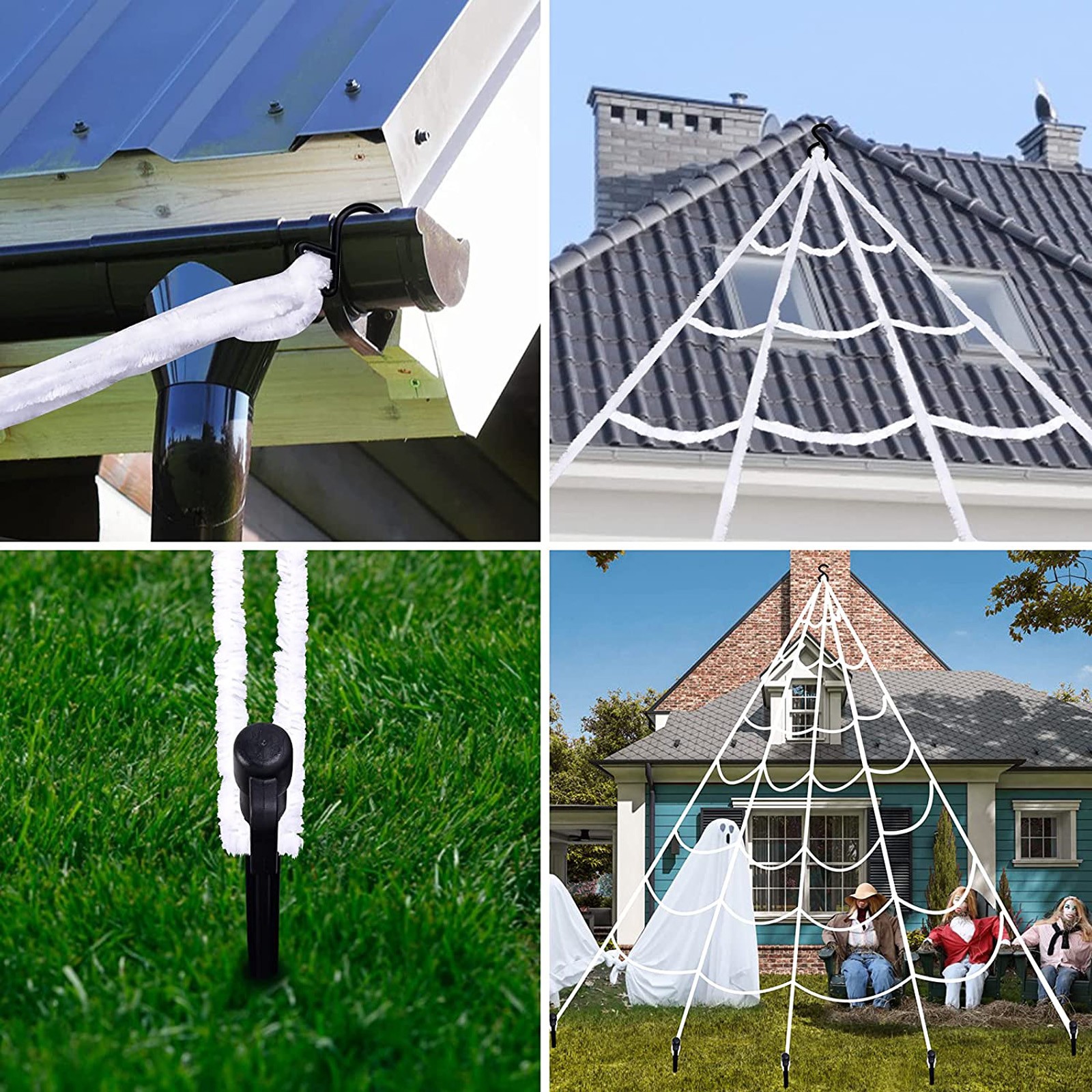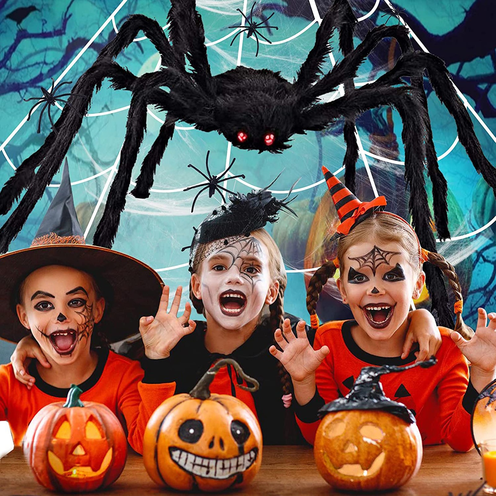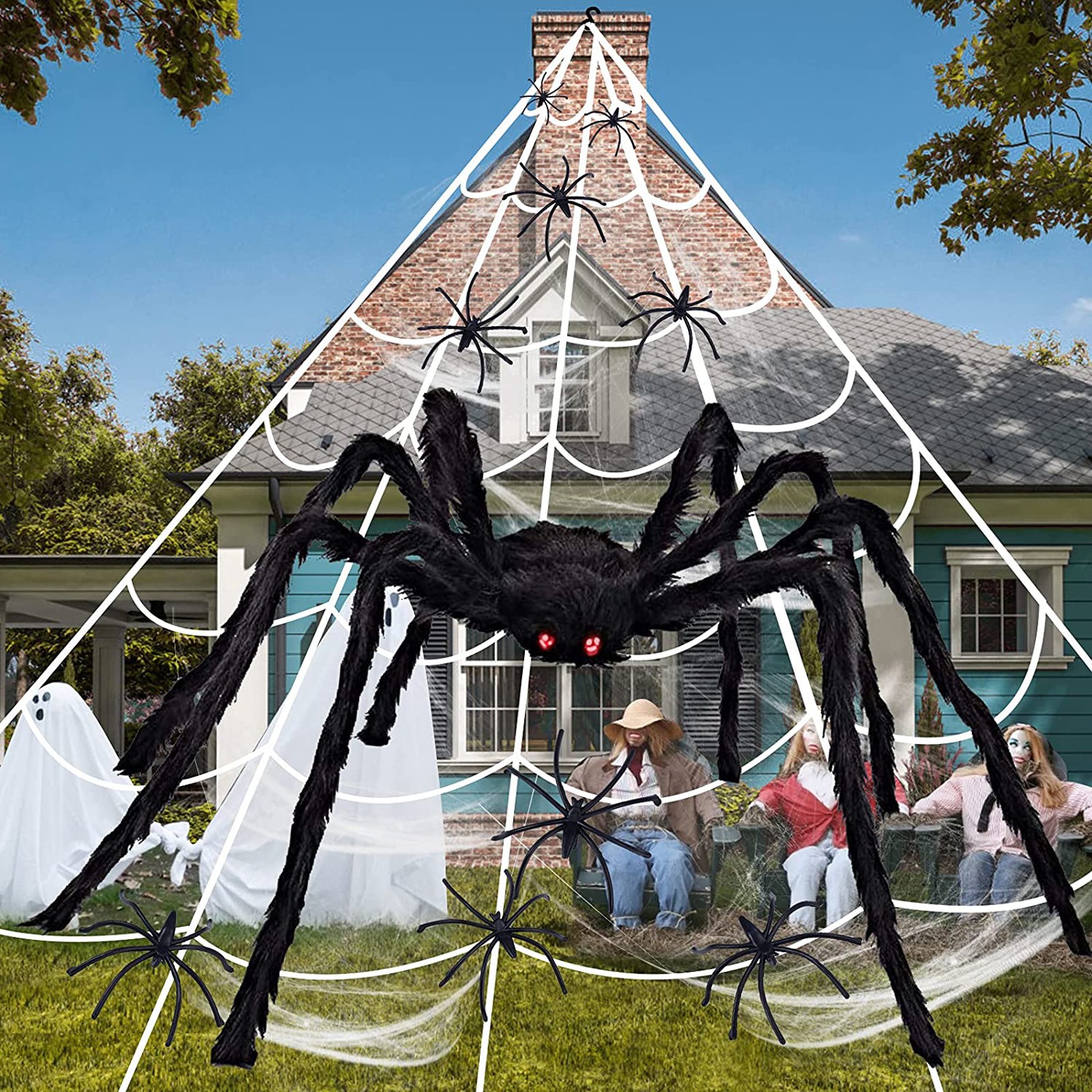 Features: 【Giant Value Pack】: This Halloween decorations come with 16.4*15.7Ft giant spider web, 47''Huge Halloween spider, 100g Stretchy Spider Webs & 20pcs Small Spiders for Halloween Party, 1 hook (for the gutter) and 5 ground spikes. Well match your Halloween costumes, Halloween string lights and so on, save your time and money. An ideal Halloween gift for your family children and friends! 【Halloween Exclusive Decoration】: The giant spider web set is suitable for creating a thrilling atmosphere, perfect for haunted house party, home party or Halloween party. You also can use it to decorate your courtyard, closets, lawn and other places you want to decorate, adding a mysterious atmosphere to Halloween. 【Selected Materials】: Spiders are made of plush and wire, which has a certain degree of elasticity. Spider's feet can bend and stretch freely and has obvious three-dimensional effect. Spider web made of sturdy, thick polyester rope that allows the net to withstand inclement weather. 【Easy Installation】: Triangular spider web installation is easy and simple. Halloween outdoor decorations spider web includes 1 gutter hook and 5 ground stakes. Just stake the hooked stakes into the ground and hooking the rope to the gutters/wall/tree in whichever direction. The cobwebs can be stretched and then cover anywhere you like. 【Scary Design】: Giant realistic scary spider with long black hairy and creepy red eyes, makes the spider look more realistic. The scary spider decorations can attracts children and adults, perfectly decorate your carnival. Everyone will share in lots of scare and laughter when they see the creepy realistic spider props!