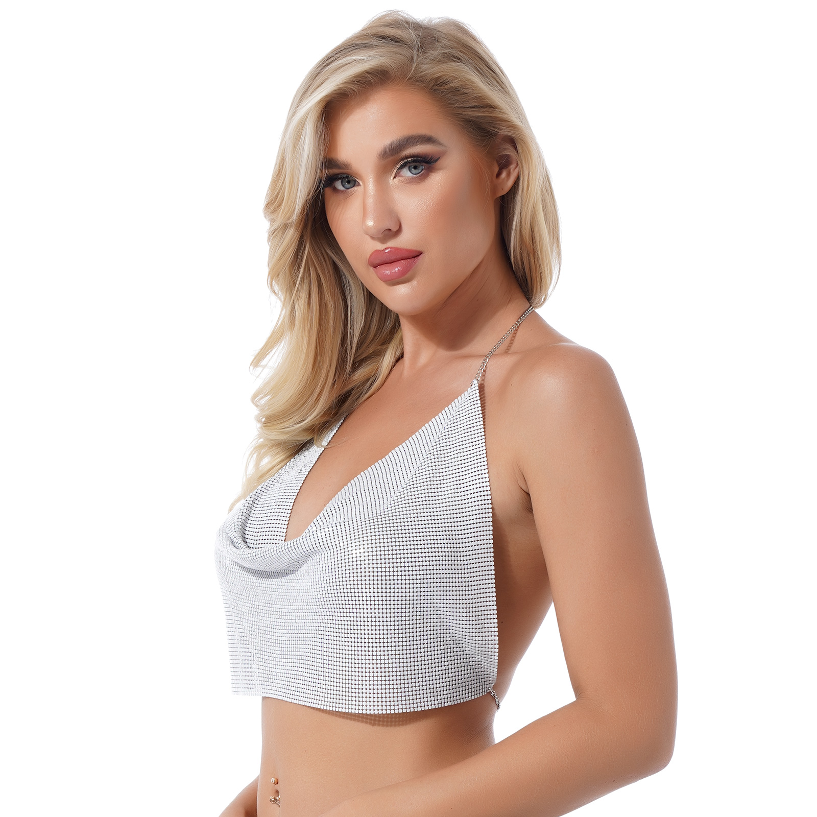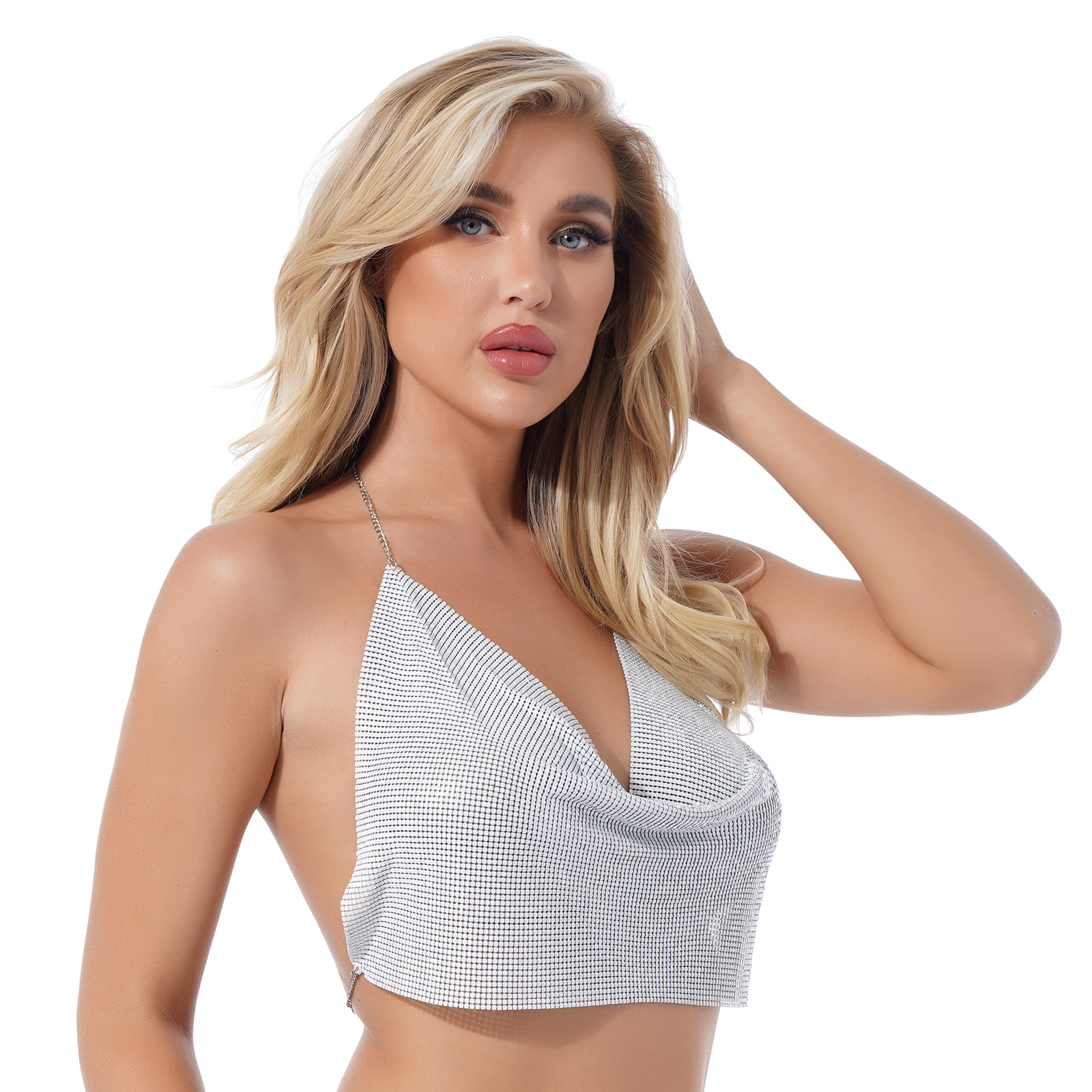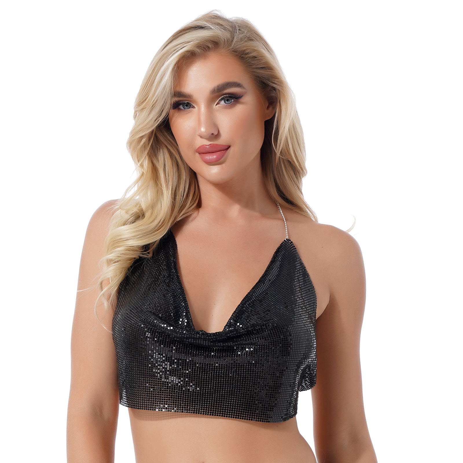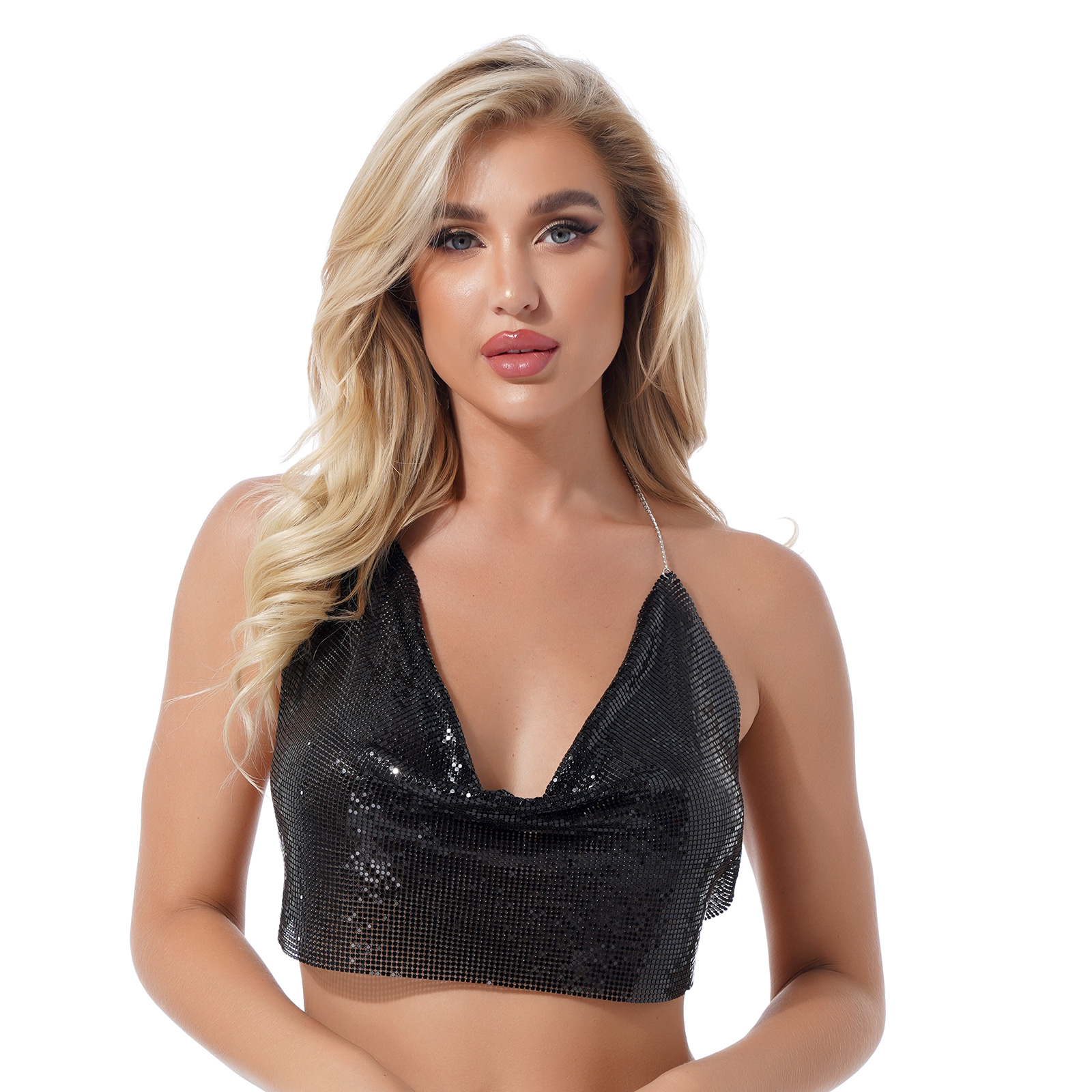 Для женщин Блестящий металлический майка на тонких бретелях с лямкой через шею цепочка с низким вырезом на спине вырез сексуальные топы, майки, топы для вечерние ночной клуб