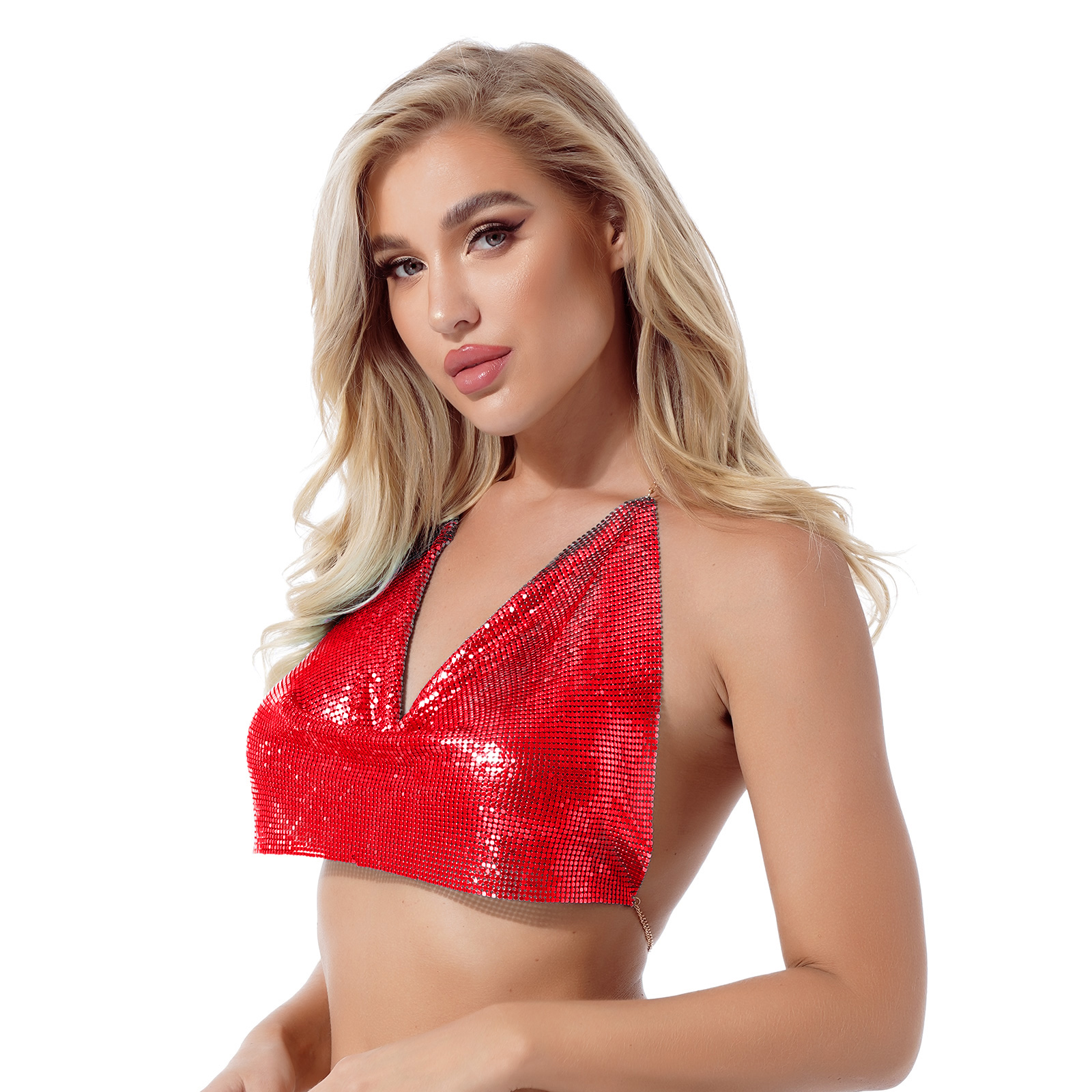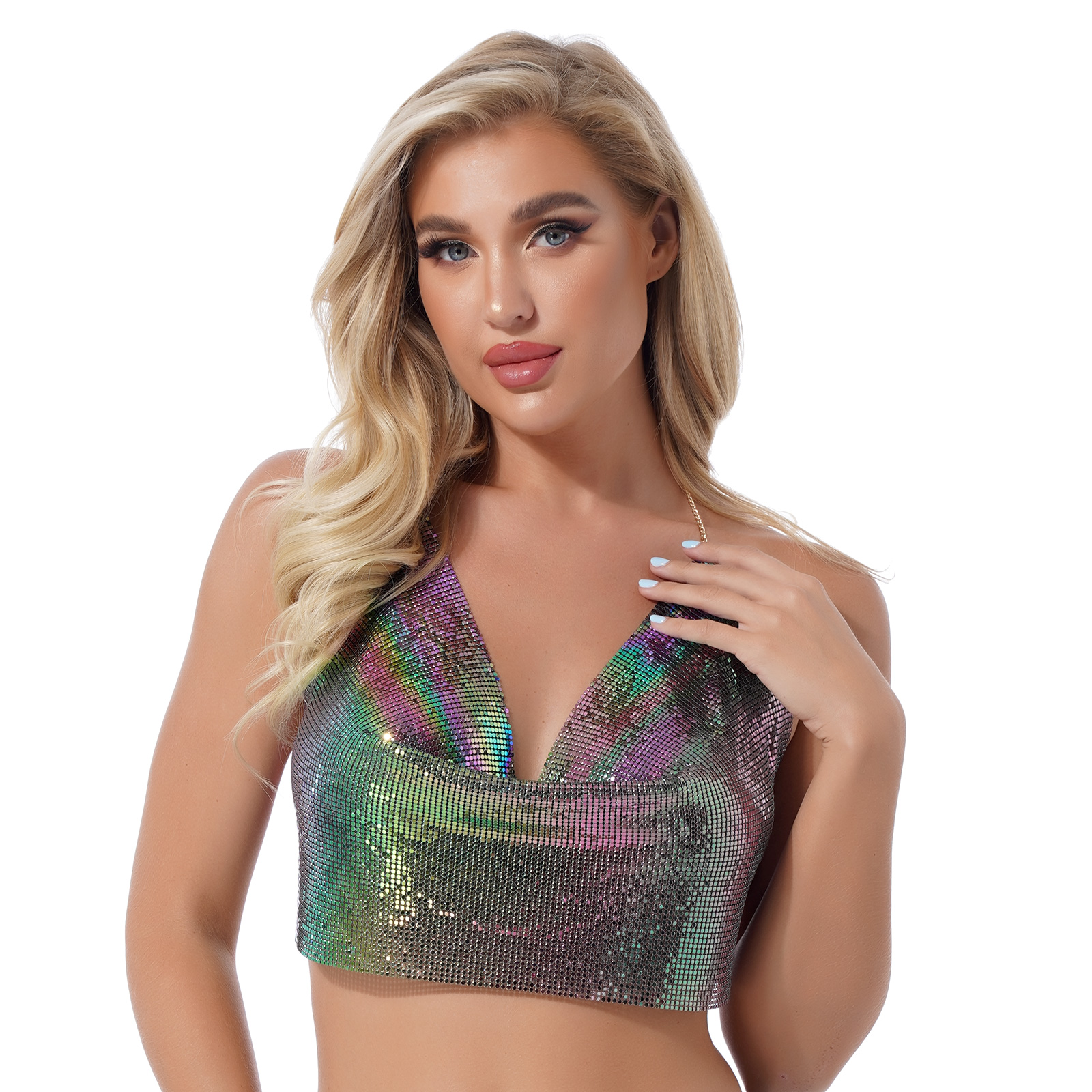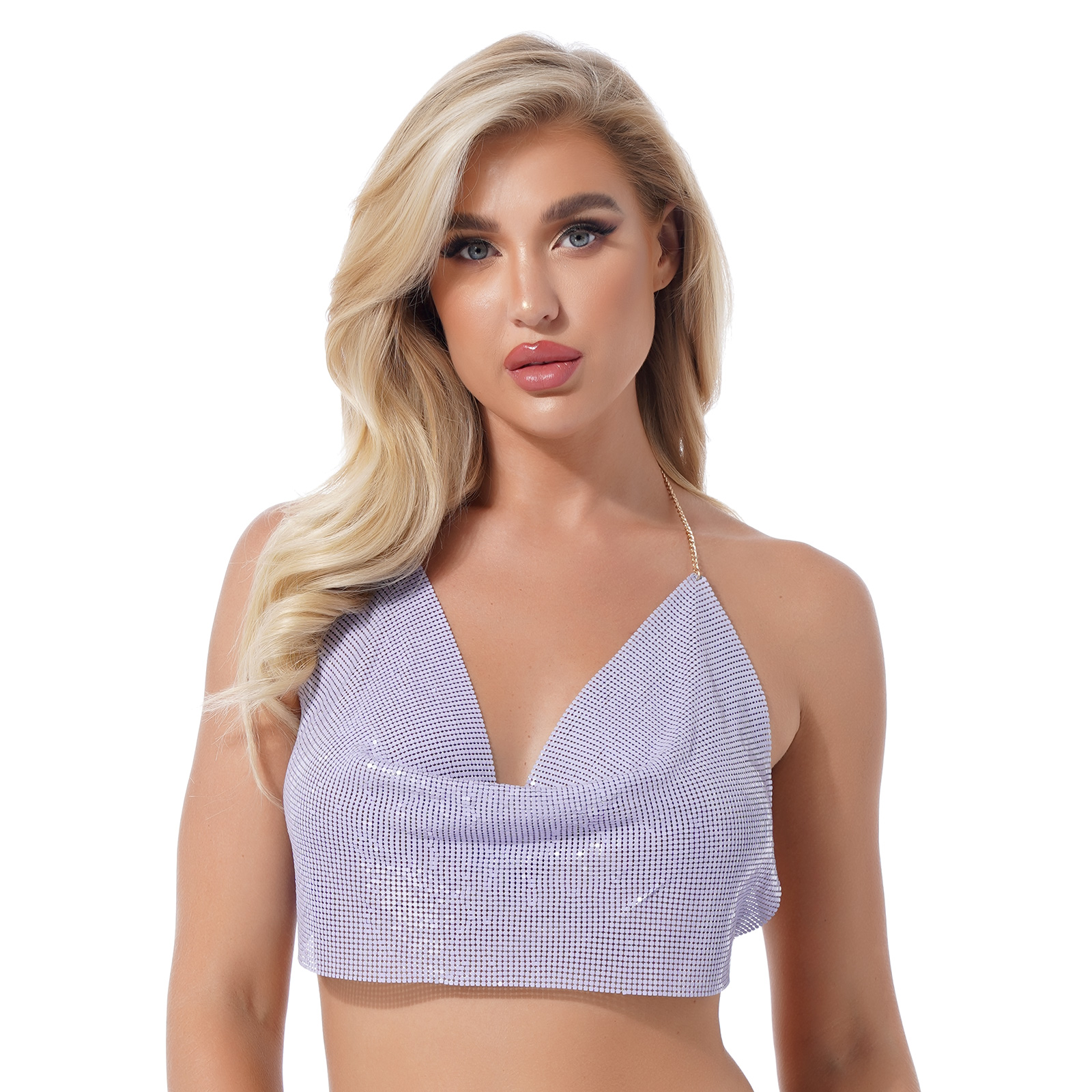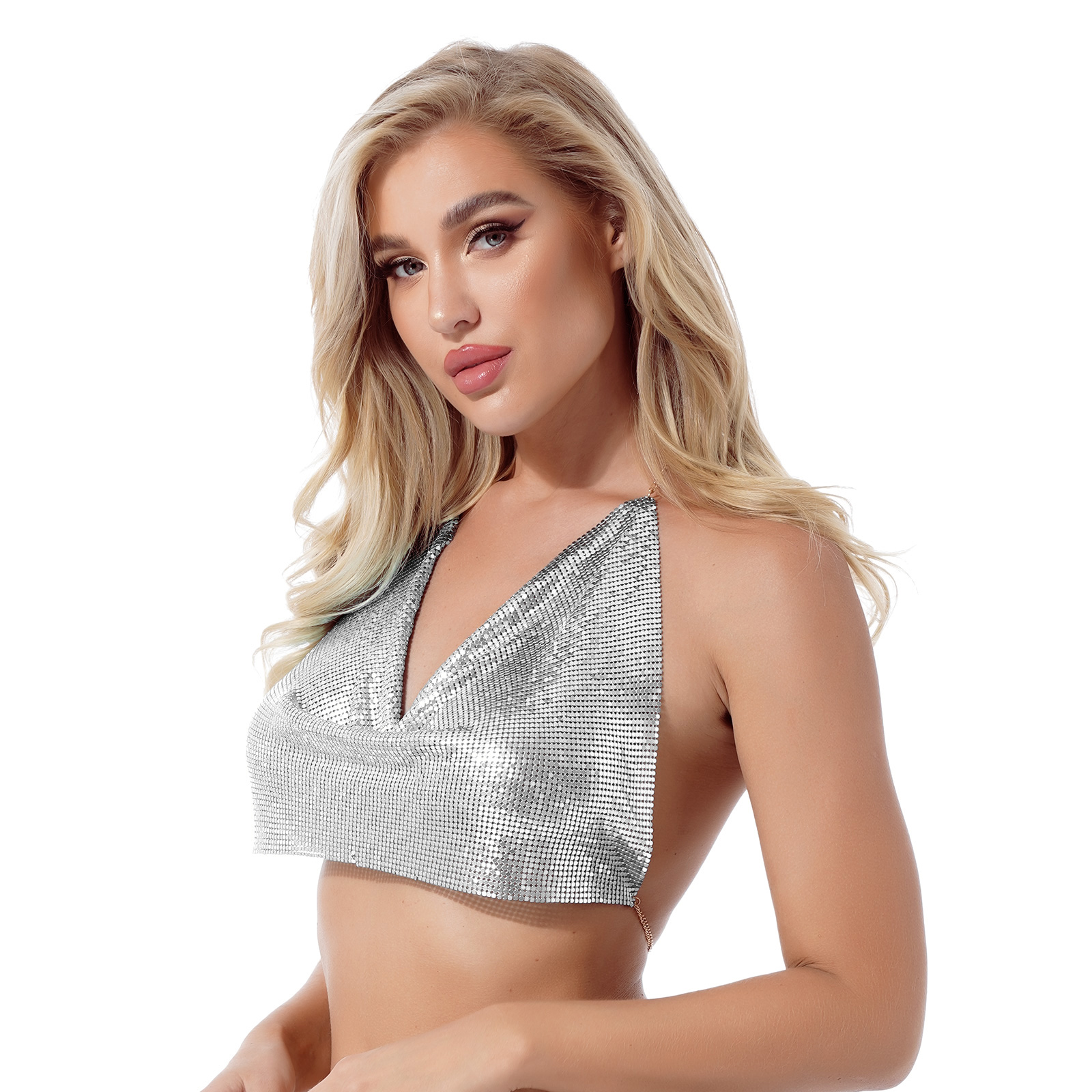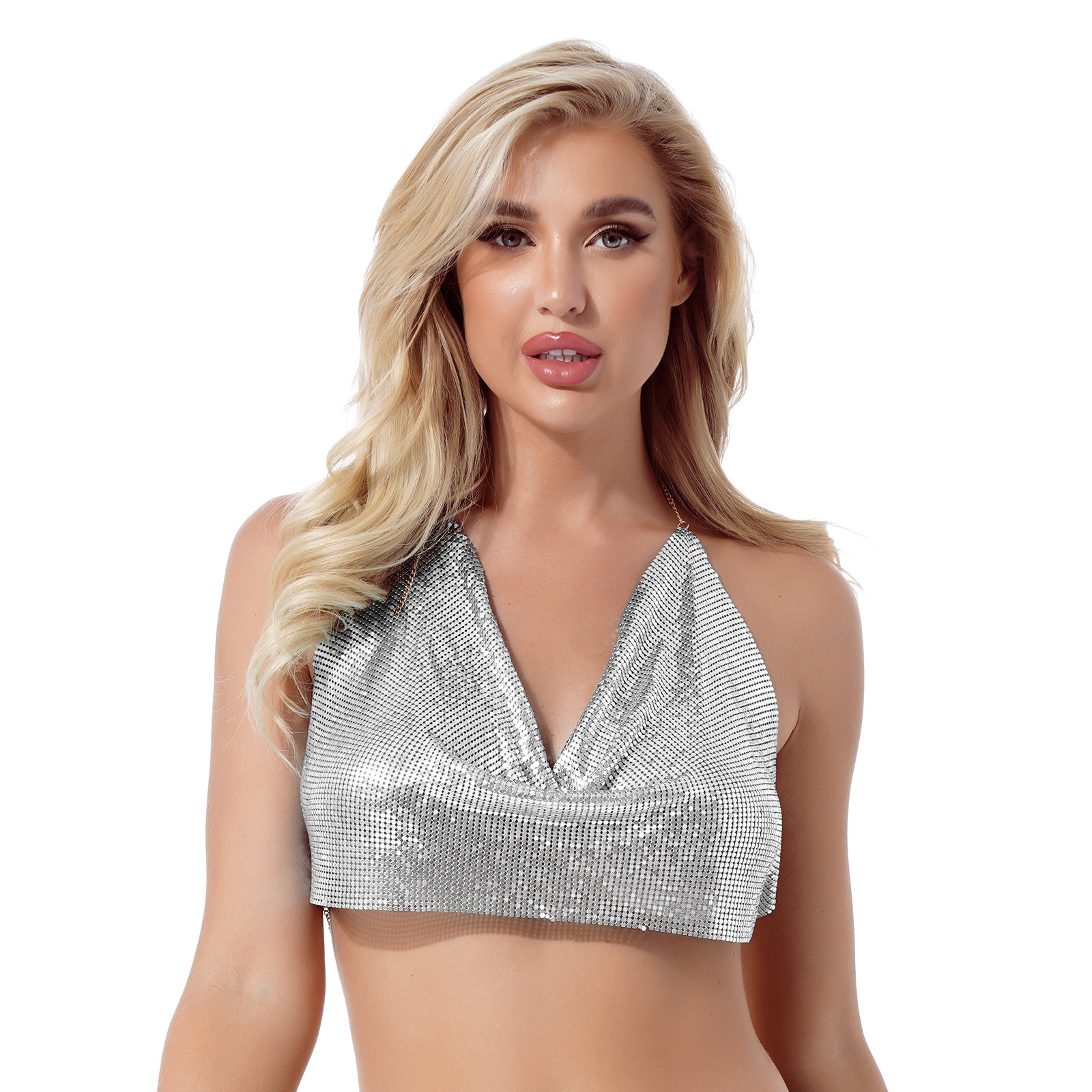 Для женщин Блестящий металлический майка на тонких бретелях с лямкой через шею цепочка с низким вырезом на спине вырез сексуальные топы, майки, топы для вечерние ночной клуб