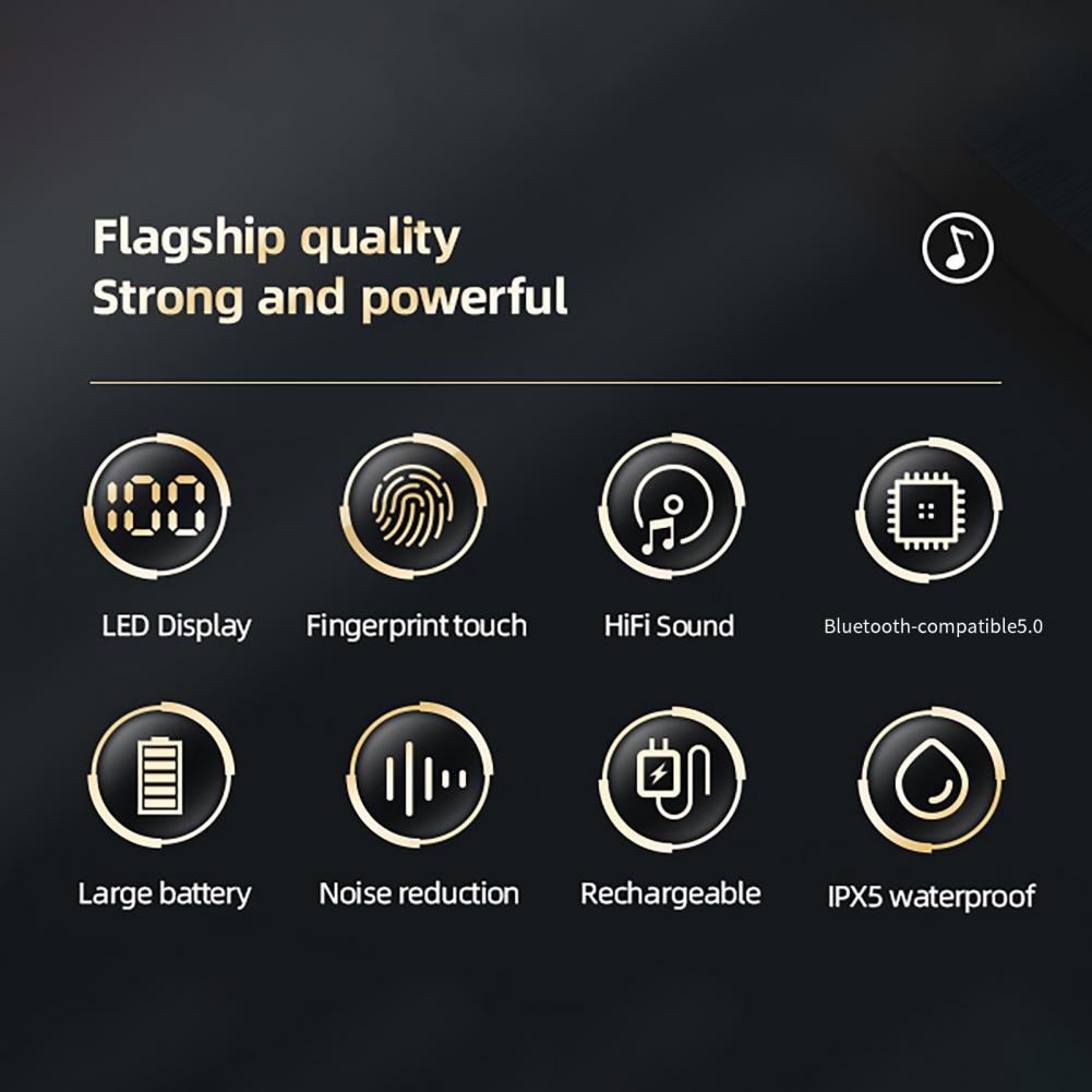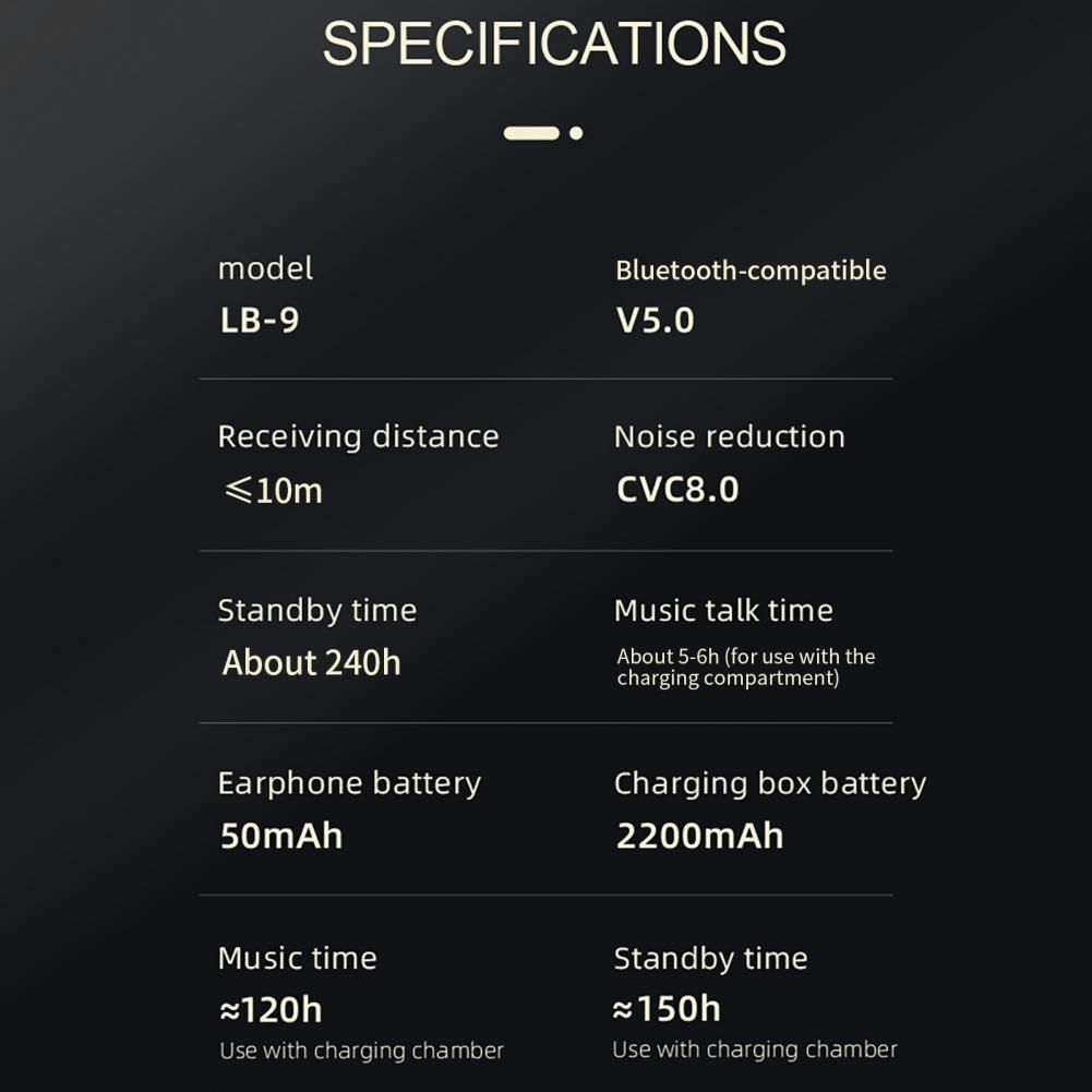 Изготовлен из высококачественного АБС-материала, он прочный, надежный и модный. Интеллектуальная технология шумоподавления работает в гармонии с микрофоном, чтобы идентифицировать человеческий голос и экологические шумы для четкого вызова. Каждый из двух наушников оснащен Bluetooth-совместимым чипом отдельно, поэтому левый и правый можно использовать отдельно.