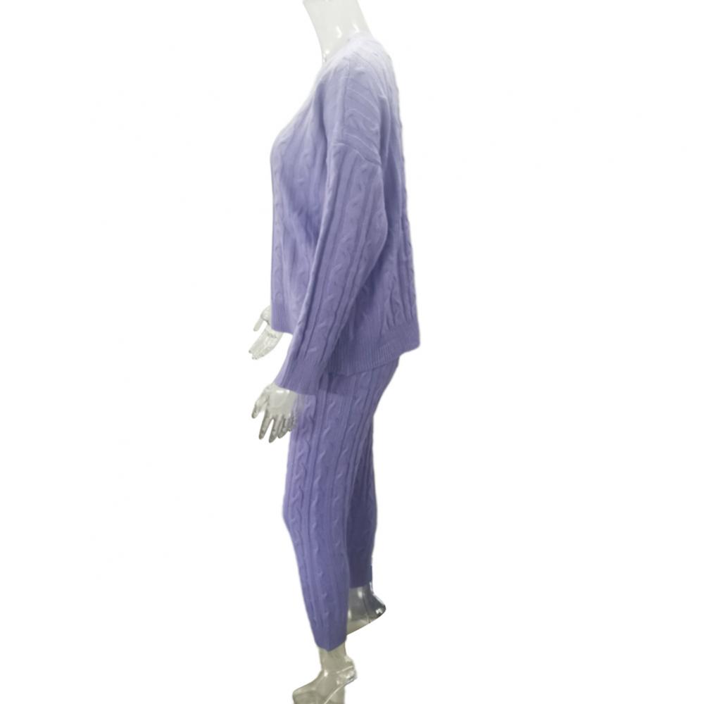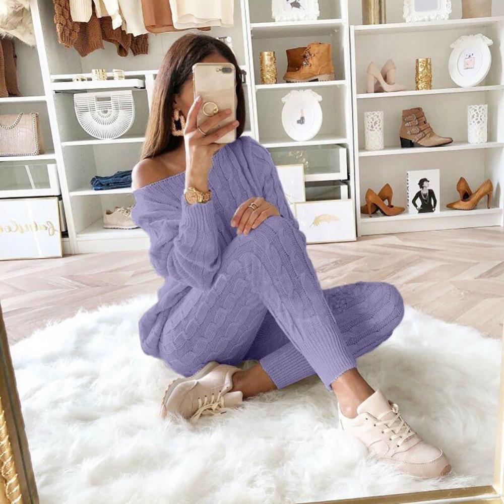 Брюки и свитер вязаные с тесьмой, что делает повседневный наряд более модным.
