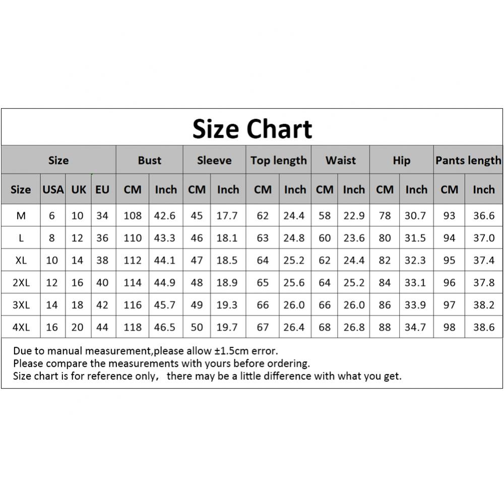 [Наш Размер 3XL] Обхват груди: 116 см/45,7 ", рукав: 49 см/19,3", Длина топа: 66 см/26 ", обхват талии: 66 см/26", обхват бедер: 86 см/33,9 дюйма, длина брюк: 97 см/38,2 дюйма (прибл.)