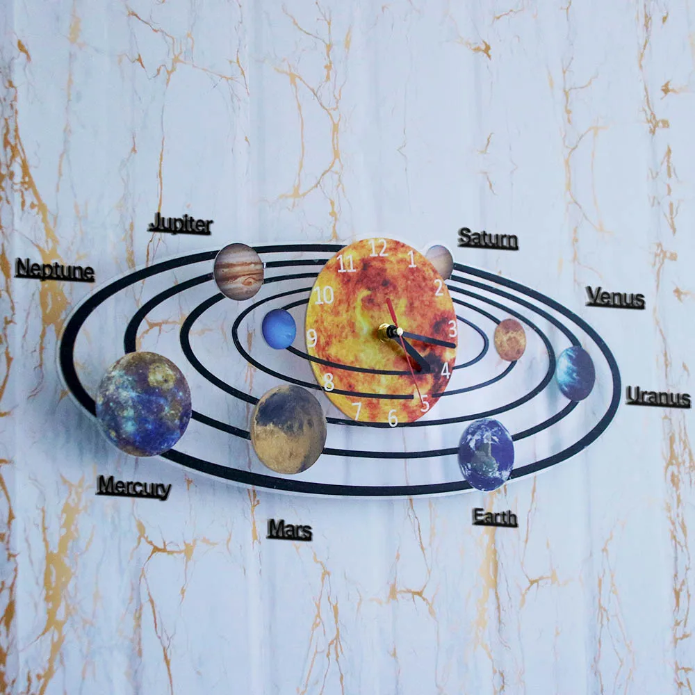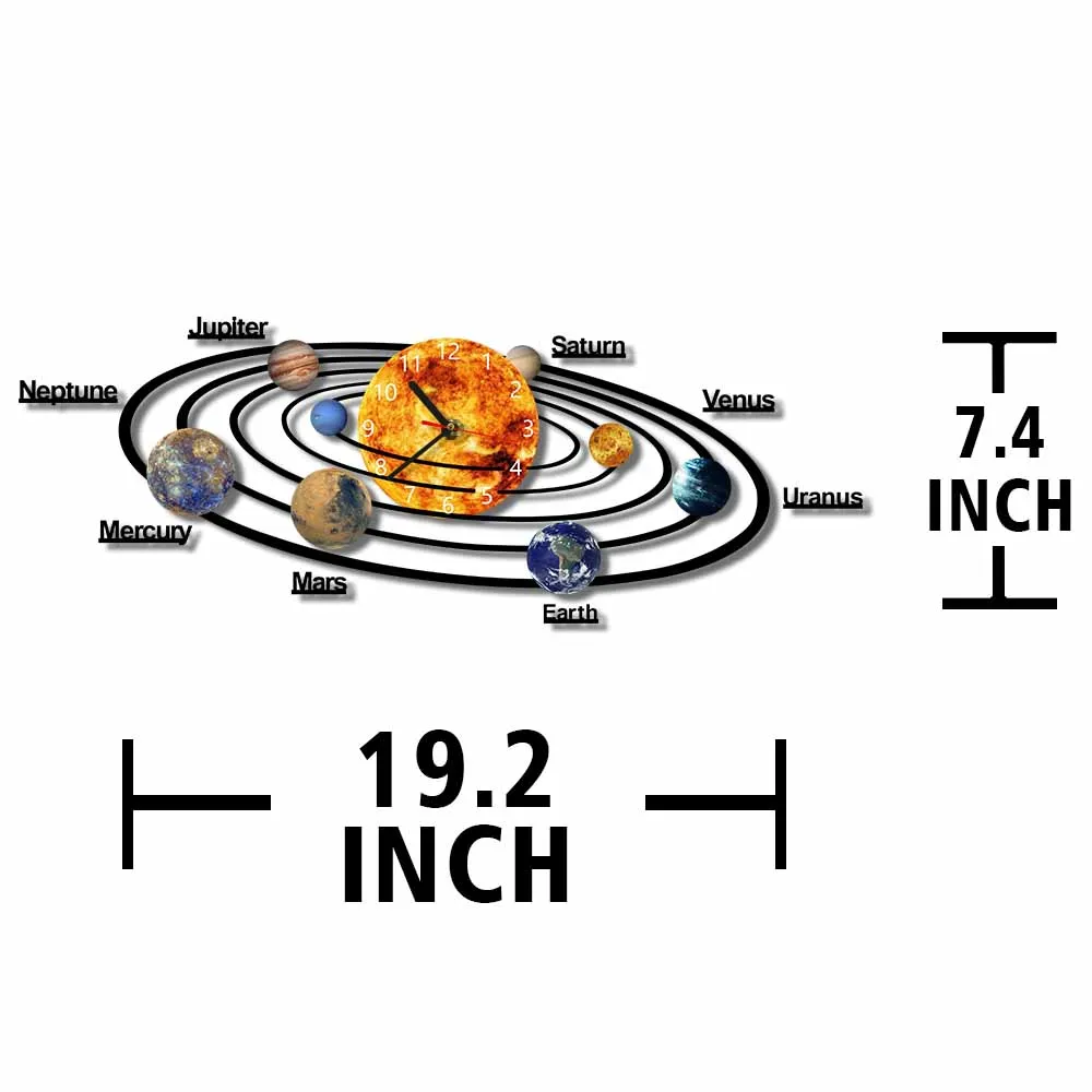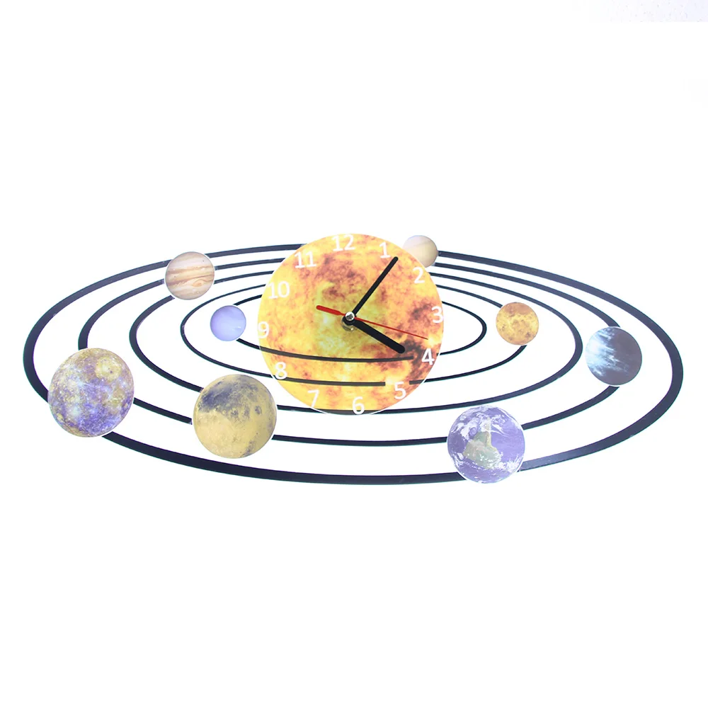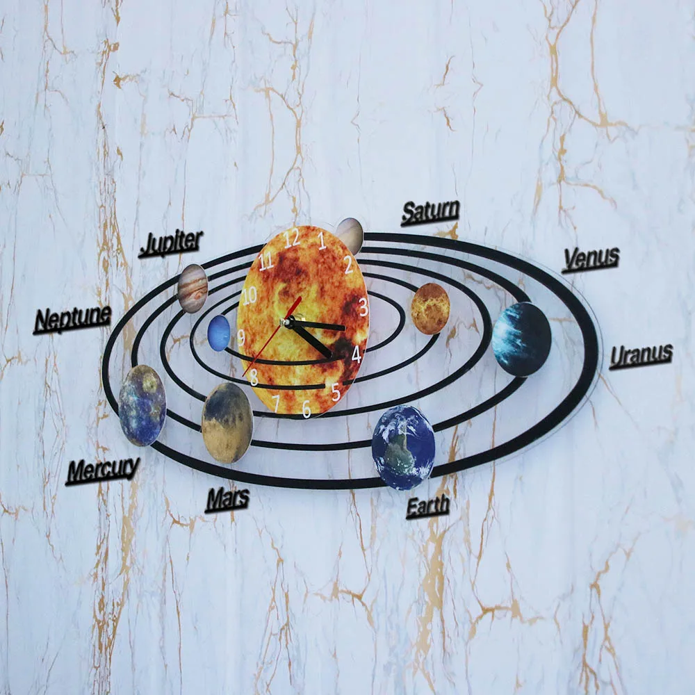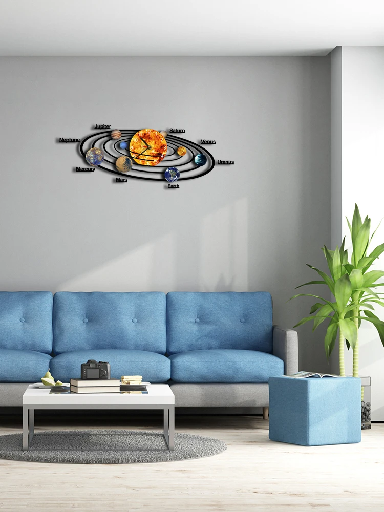 The whole blueprint of this timepieces shows the solar system, there are eight planets, which is a striking landscape. The main material is acrylic and comes with metal pointers. The wall clock has a silent movement, so it can work silently and stably. The printed Arabic numbers provide the beauty of time. Decorate your wall with this appealing and high-end wall clock and improve the taste of your life.