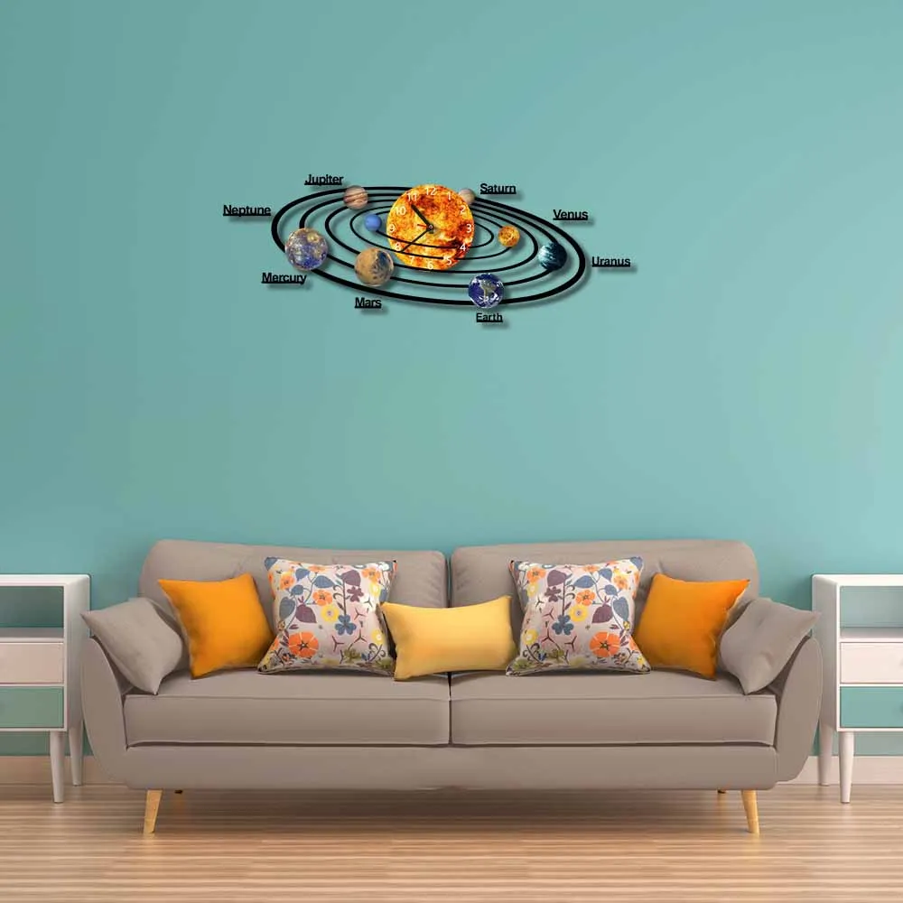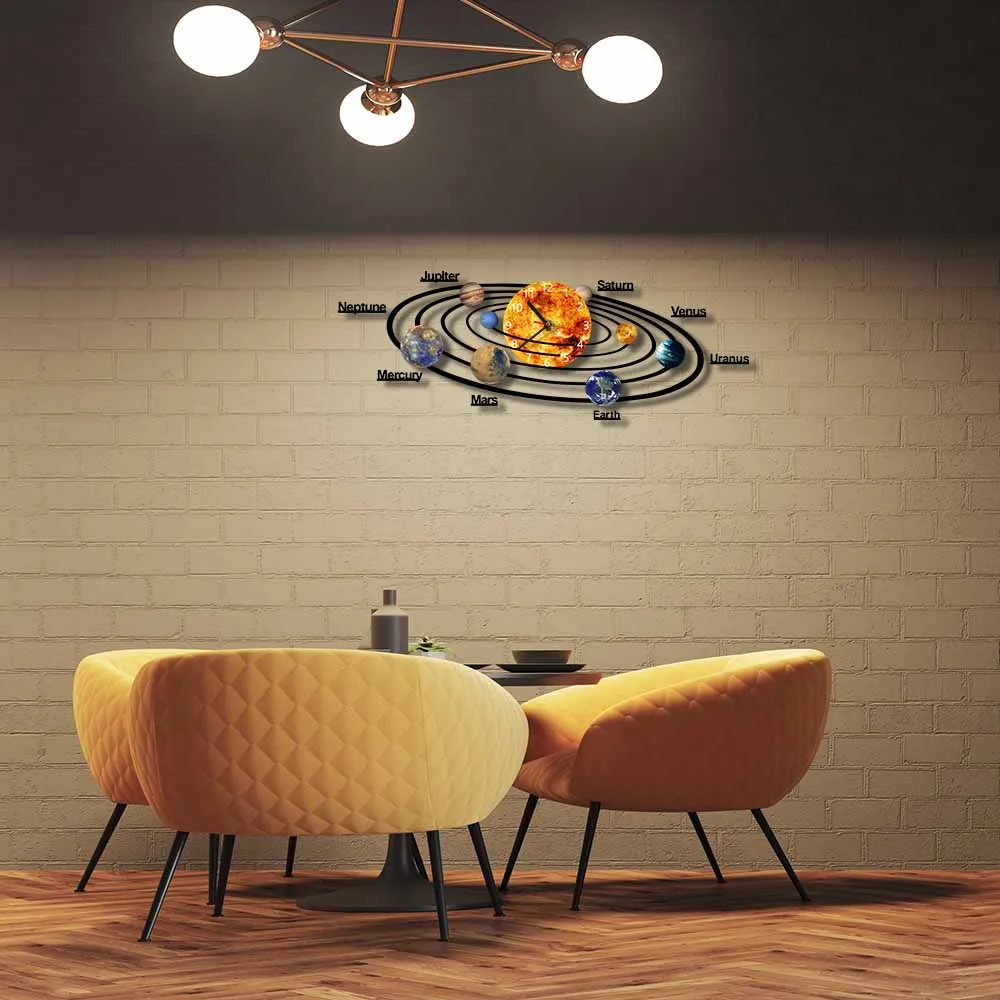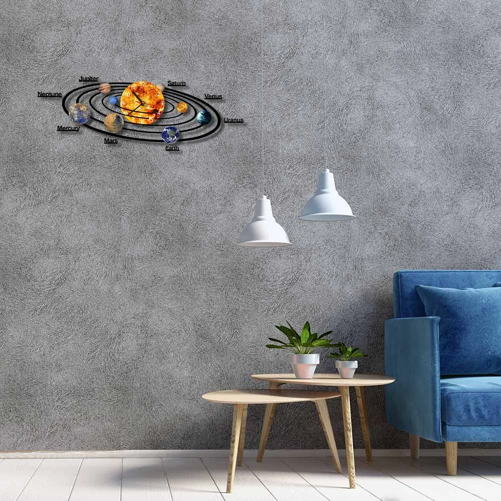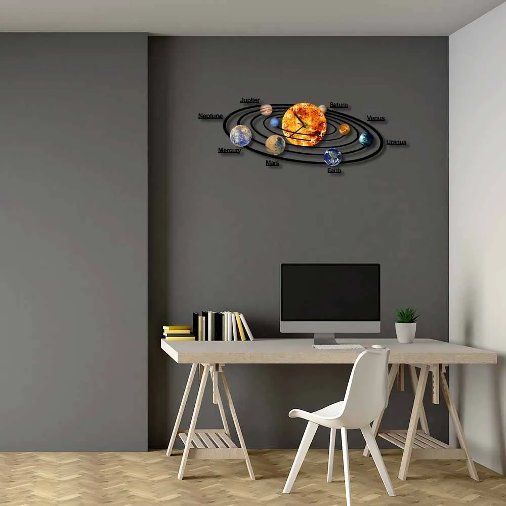The whole blueprint of this timepieces shows the solar system, there are eight planets, which is a striking landscape. The main material is acrylic and comes with metal pointers. The wall clock has a silent movement, so it can work silently and stably. The printed Arabic numbers provide the beauty of time. Decorate your wall with this appealing and high-end wall clock and improve the taste of your life.