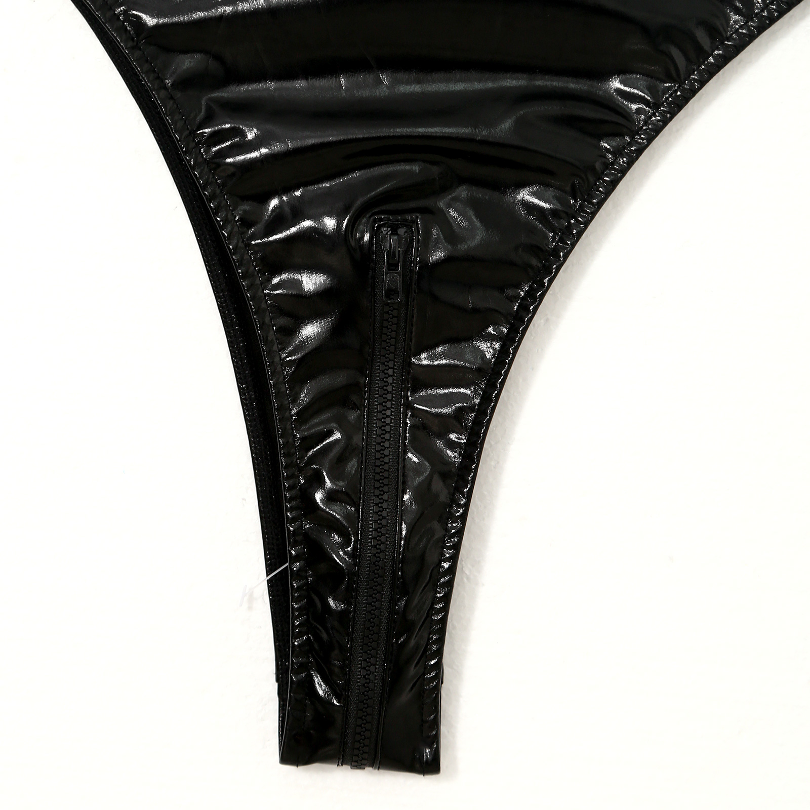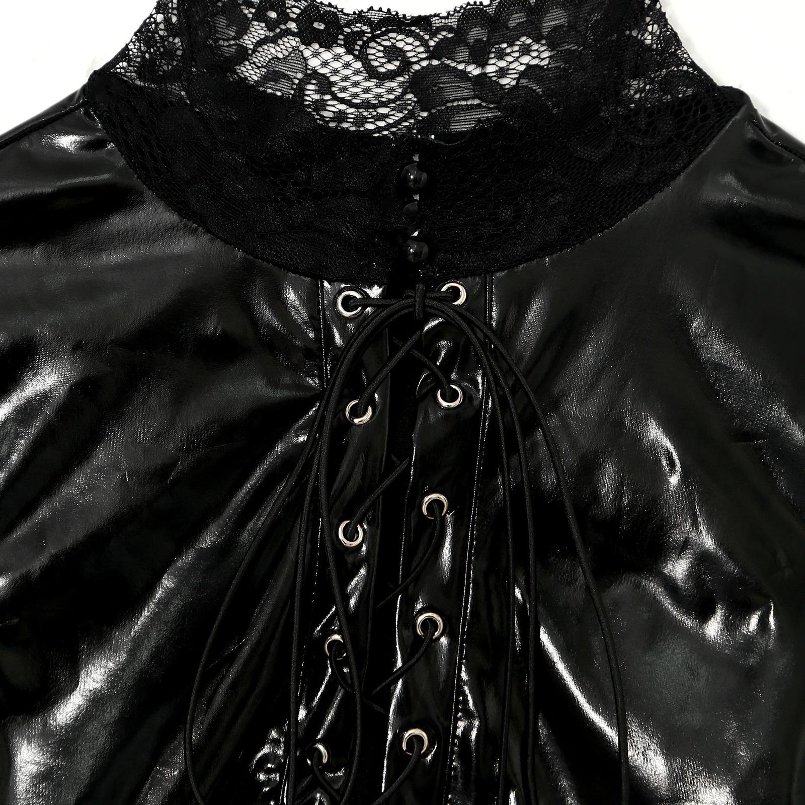 Женское боди из лакированной кожи с кружевным воротником и рукавами-крылышками, боди на шнуровке с высоким вырезом на молнии и промежностью.