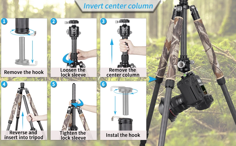 【Эксклюзивная средняя Колонка 】 вы можете снять или перевернуть среднюю колонку, чтобы получить низкое положение для камеры, чтобы она могла реализовать самую низкую угловую съемку, макросъемку или другую специальную фотографию.