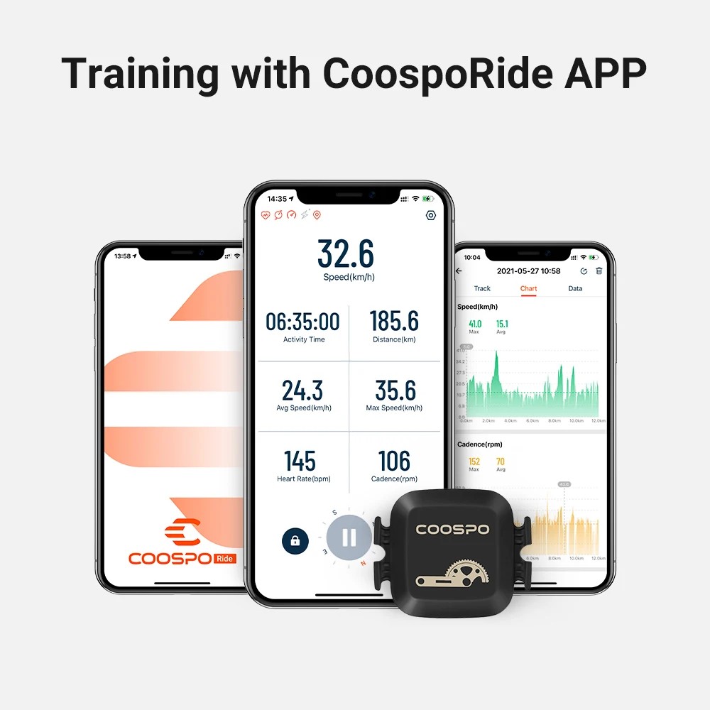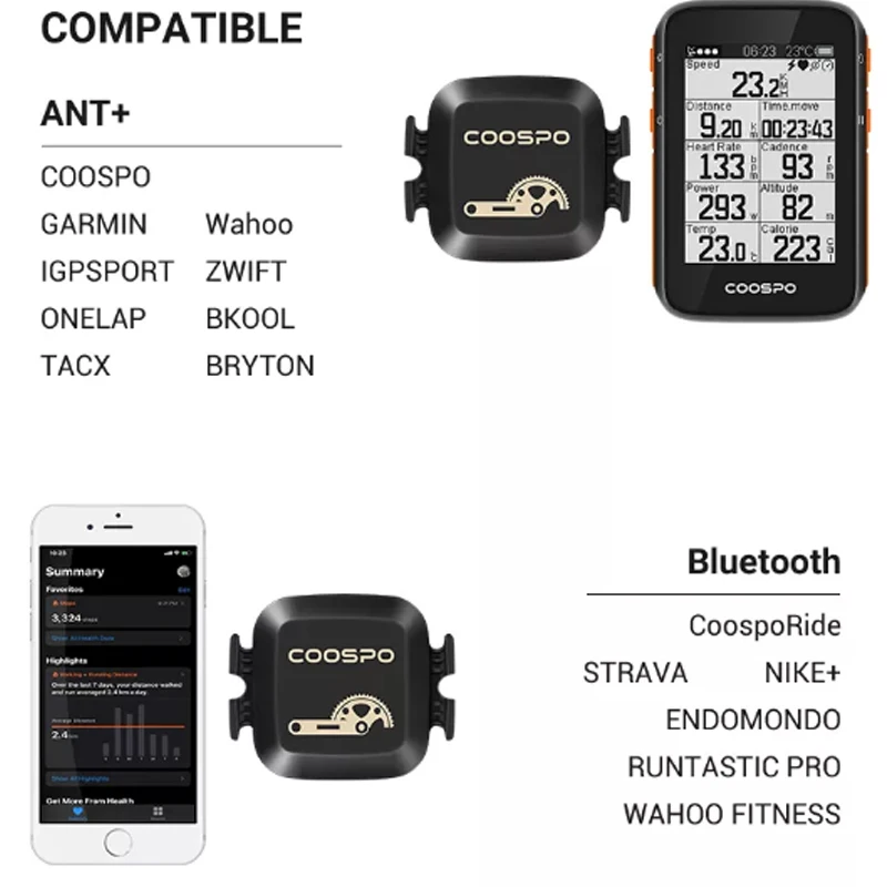 Технология Bluetooth и ANT + dual band позволяет подключать и отображать данные на велосипедных компьютерах GPS, а также работать с наиболее популярными велосипедными приложениями, включая CoospoRide, Zwift, Rouvy, Ridewith GPS, Peloton, Openrider, трейнерроуд и так далее.