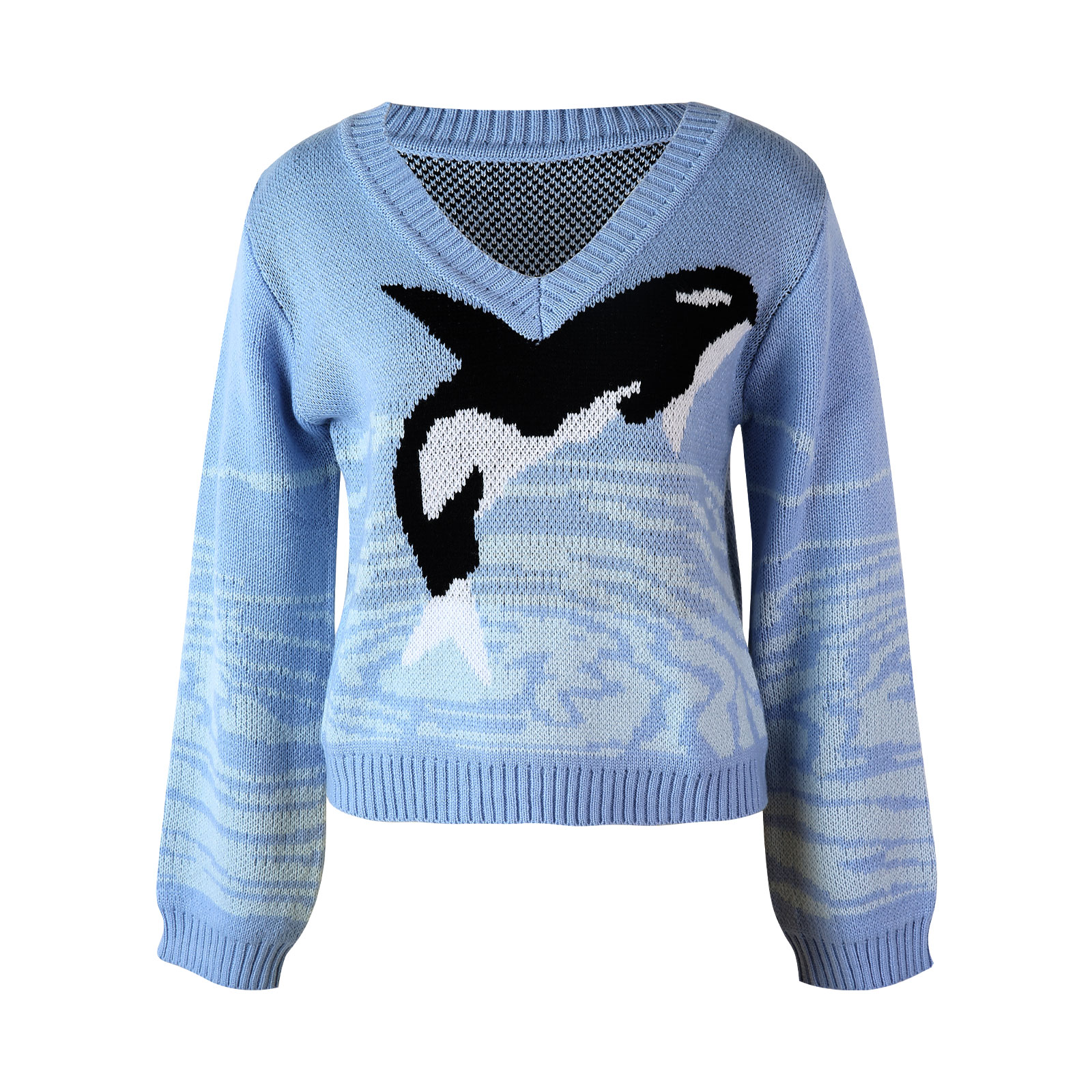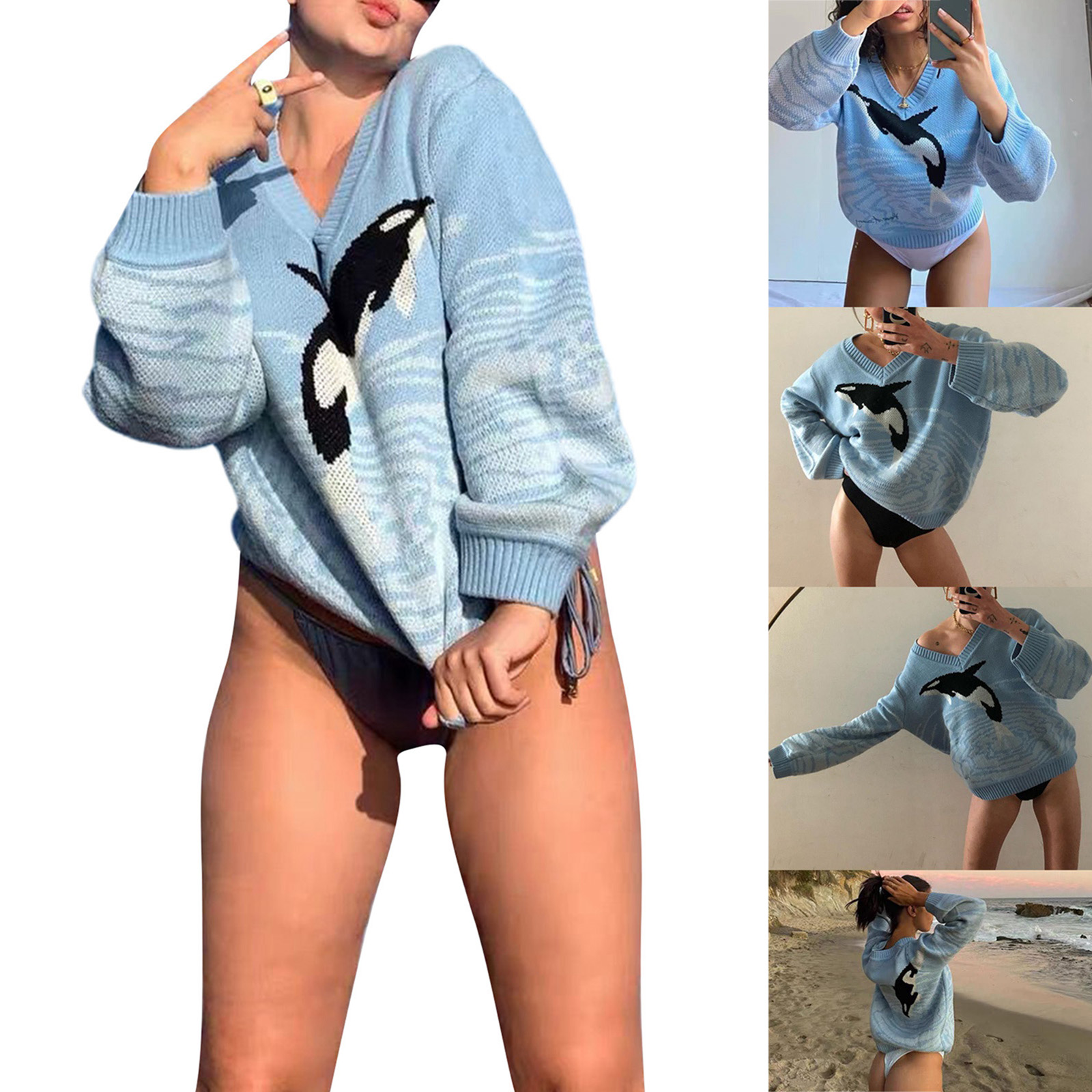 Женский модный свитер с длинными рукавами и принтом дельфина --- этот Повседневный Трикотажный свитер с v-образным вырезом придает любой фигуре свободный эффект и подчеркивает фигуру. Наслаждайтесь модным топом без ущерба для комфорта, различные цвета лучше всего подойдут вашему вкусу и стилю.