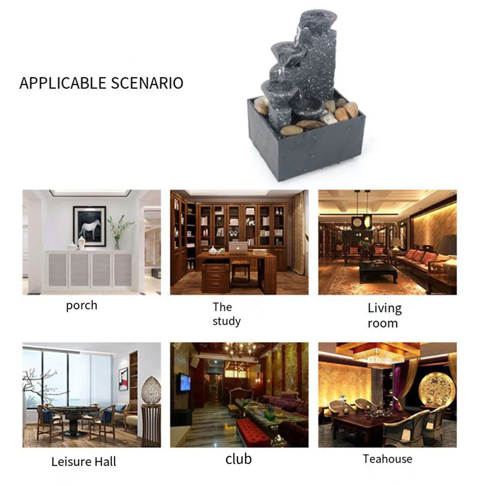 Простота установки: легко установить и использовать. Положите гальку на основание фонтана, добавьте воду, подключите питание или батарею, вода образует фонтан и течет вниз, чтобы образовать водопад.