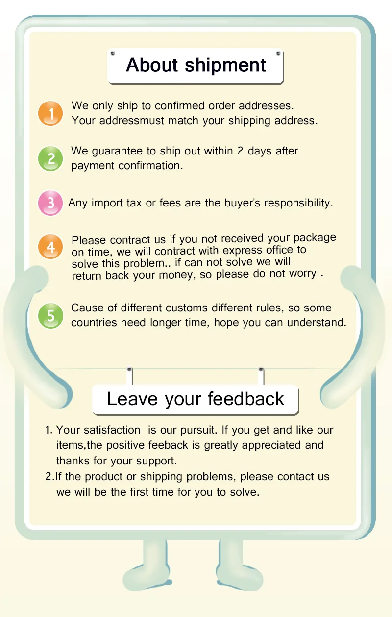 Если вы обнаружите, что товар отсутствует или поврежден при получении посылки, пожалуйста, не стесняйтесь обращаться к нам. Мы всегда дадим вам удовлетворенный результат!