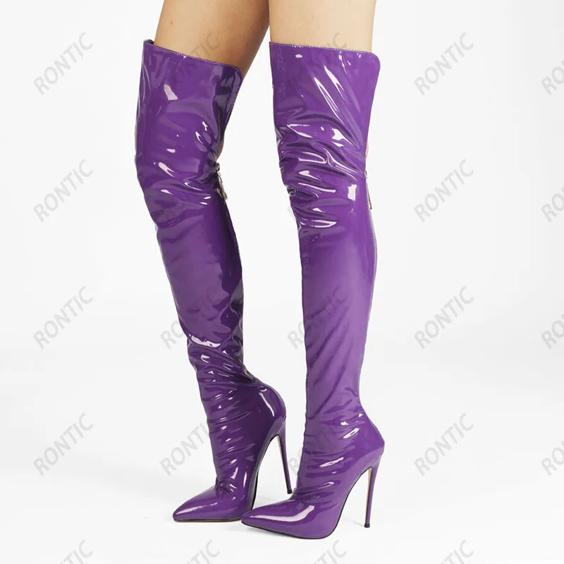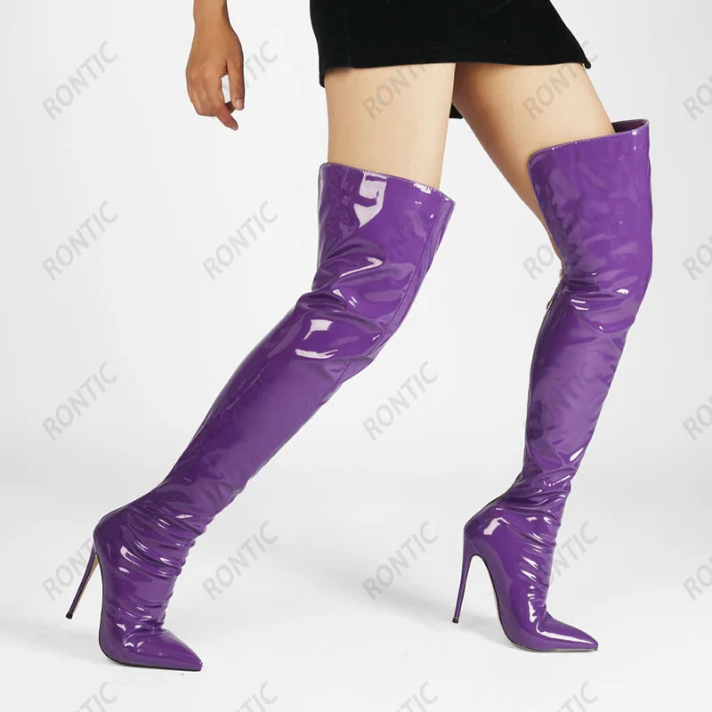Rontic/женские Зимние ботфорты из лакированной кожи на молнии; Туфли на шпильке с острым носком; Цвет фиолетовый, фуксия, зеленый; Обувь для ночного клуба; Американские размеры 5-15