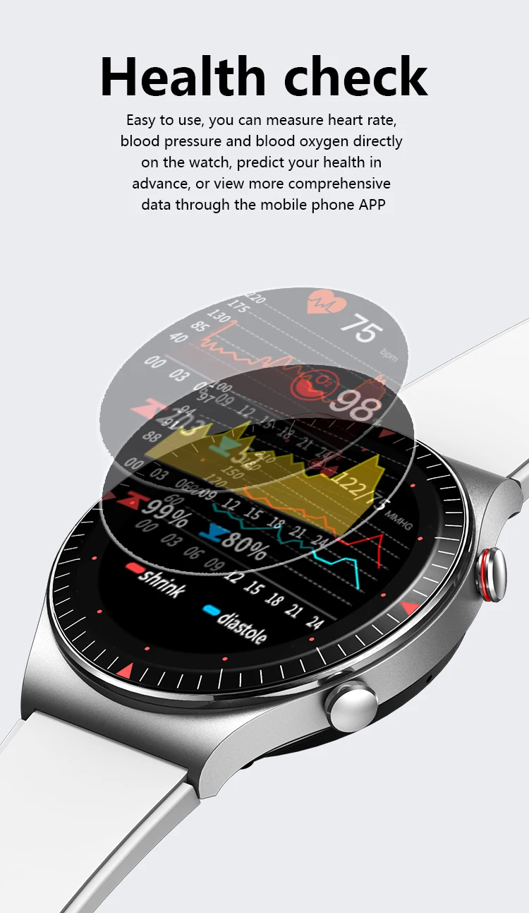 Простота в использовании, вы можете измерить частоту сердечных сокращений, кровяное давление и уровень кислорода в крови непосредственно на часах, предсказать свое здоровье заранее или просмотреть более полные данные через мобильный телефон APP