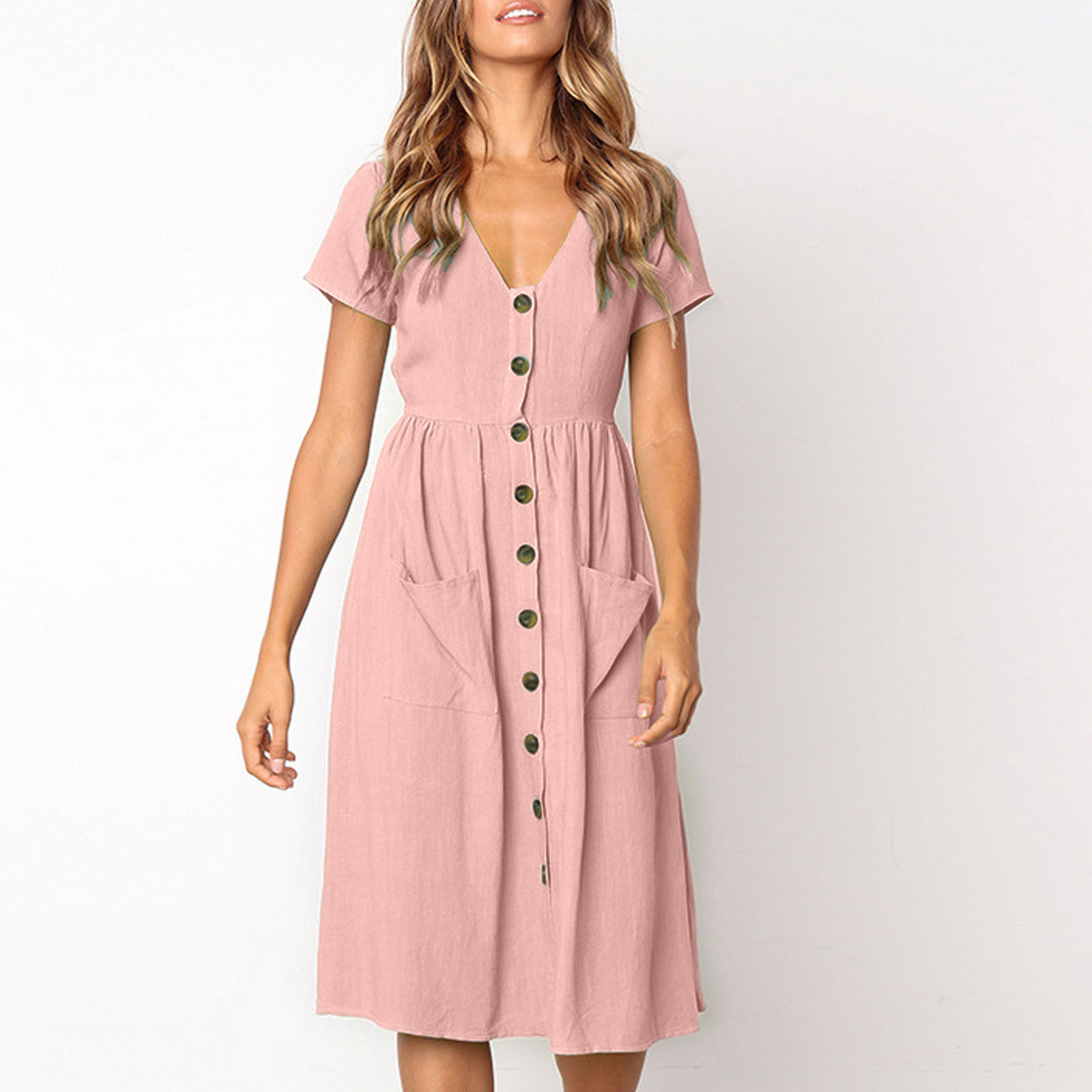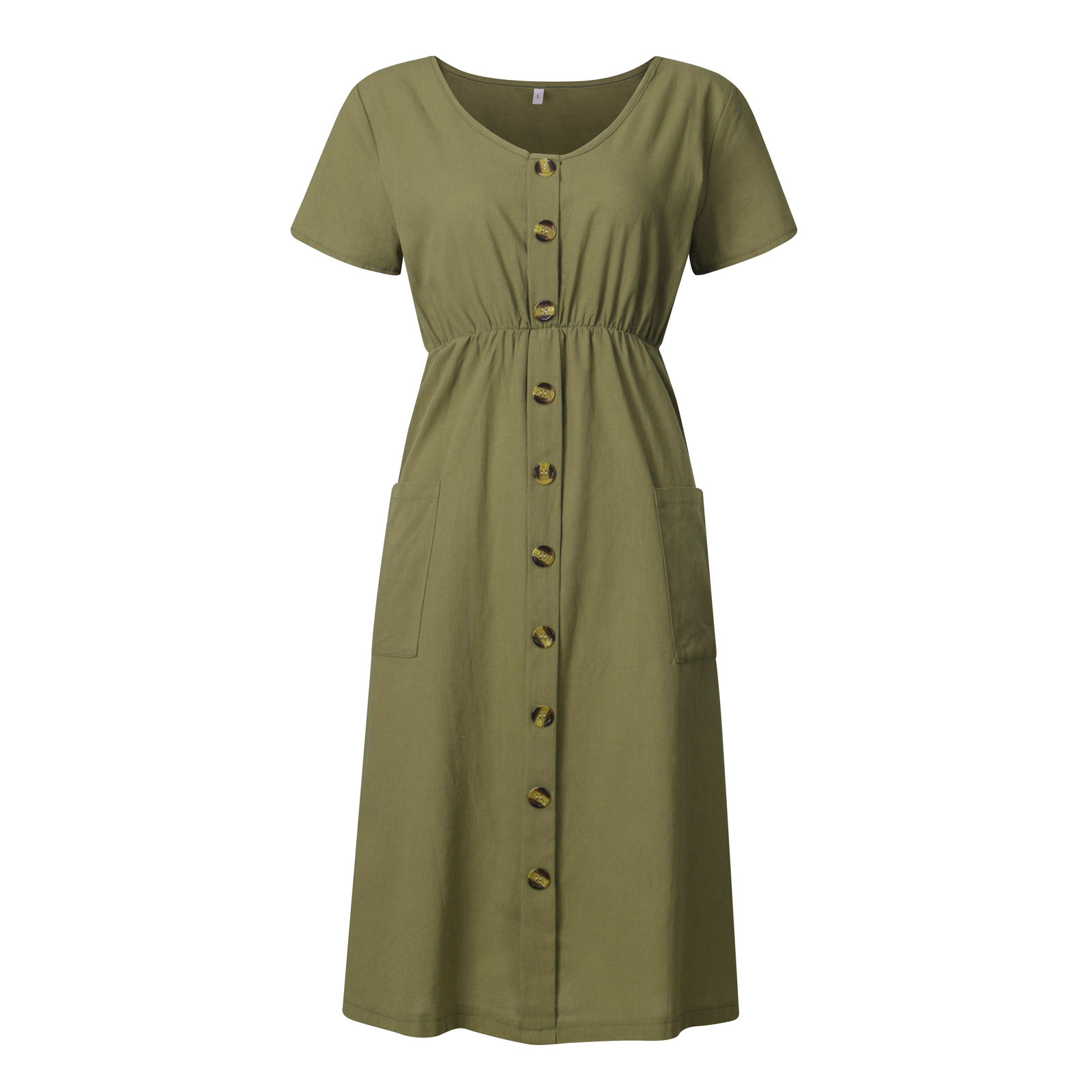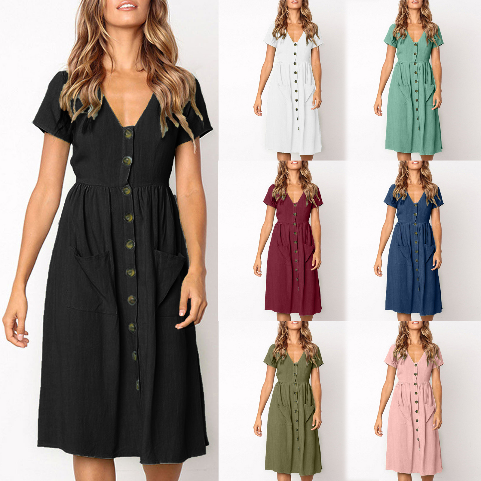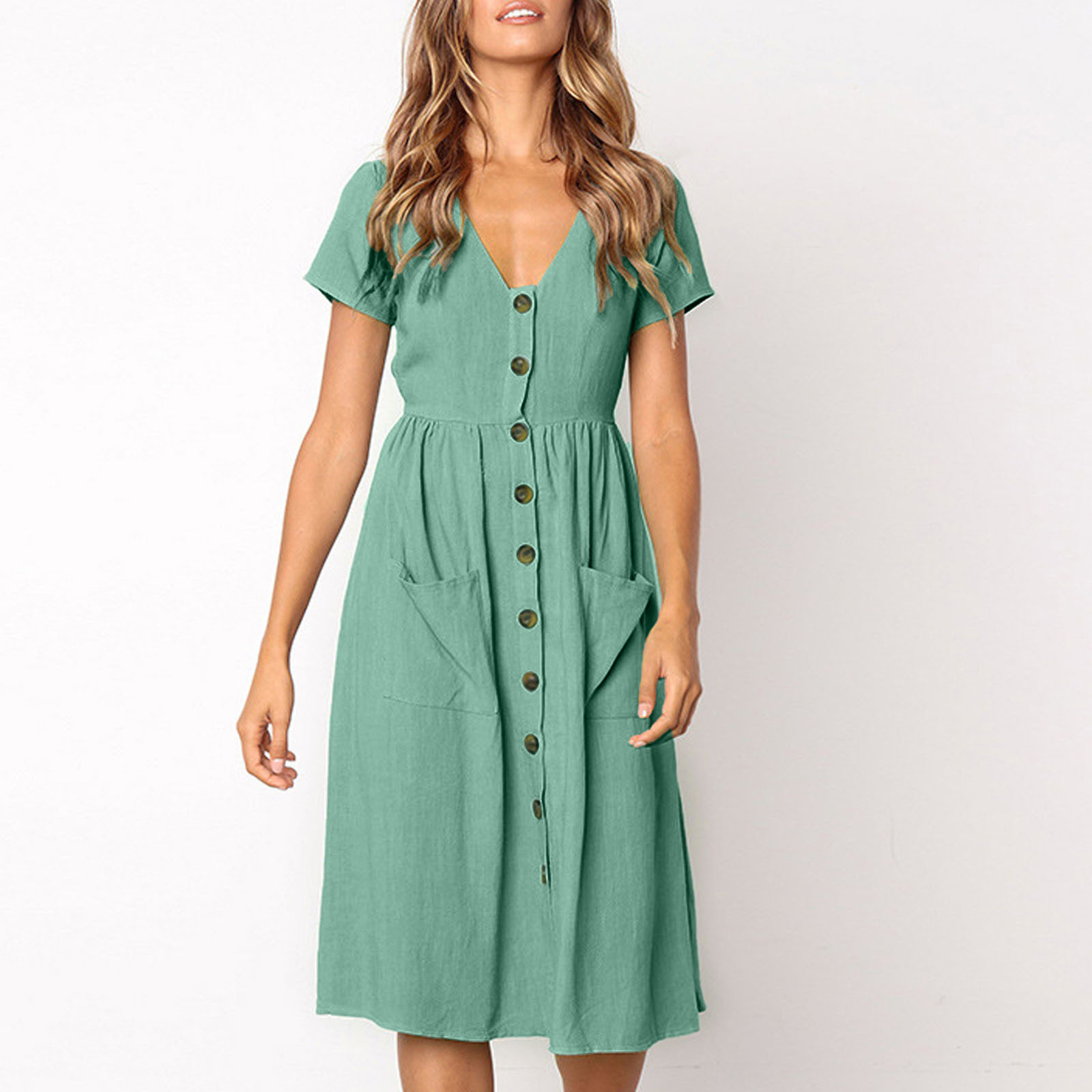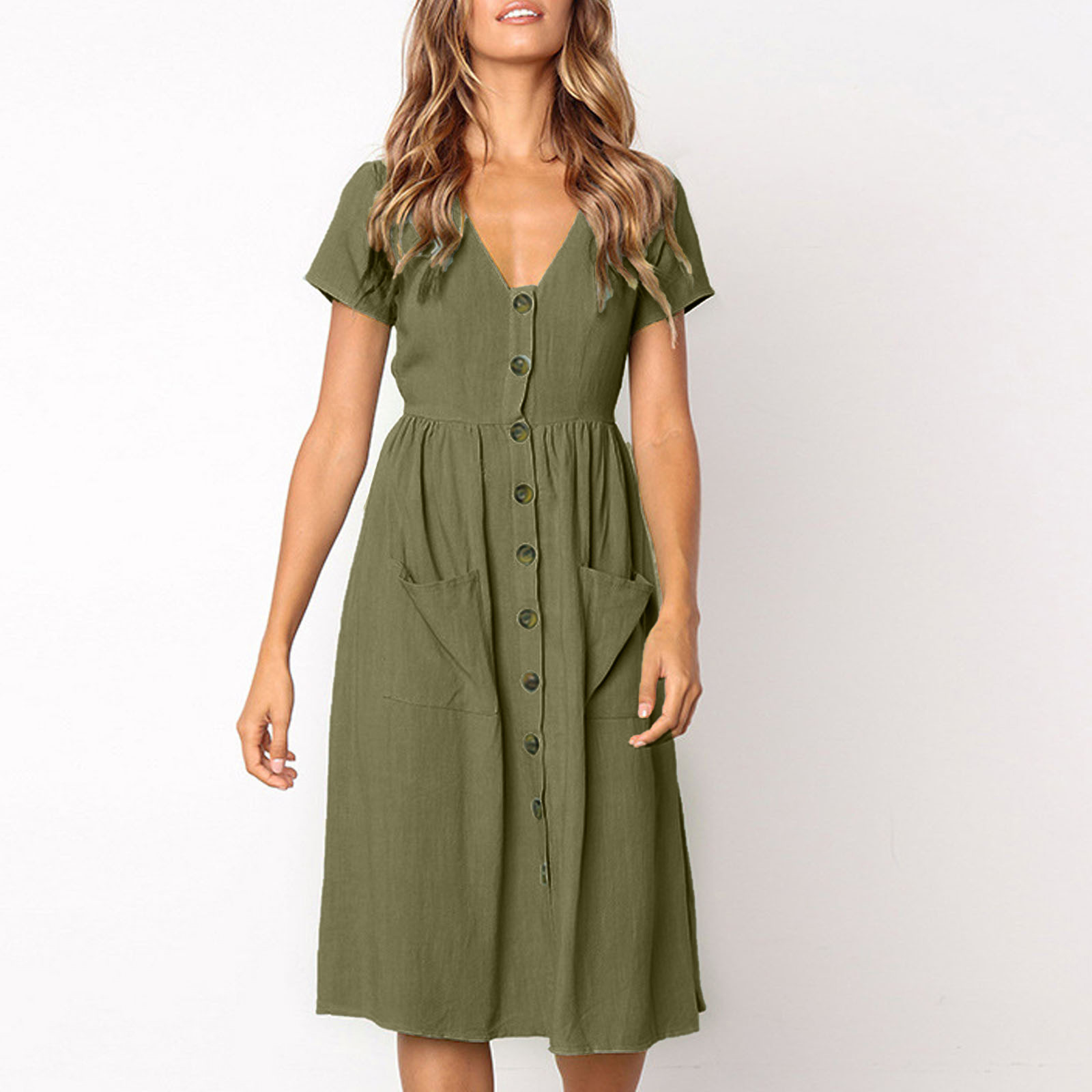 Женское повседневное однотонное платье трапециевидной формы с коротким рукавом и v-образным вырезом и карманами на пуговицах