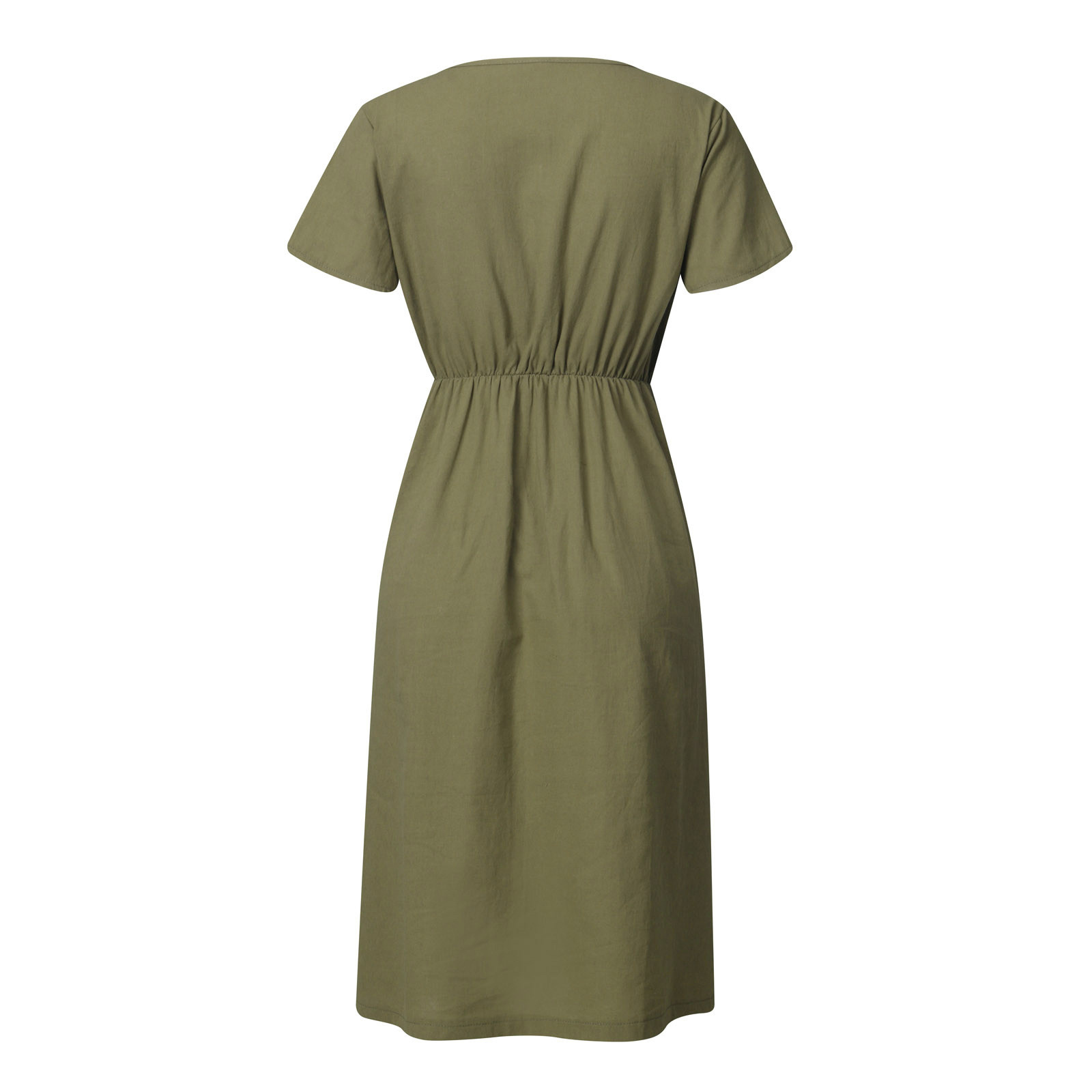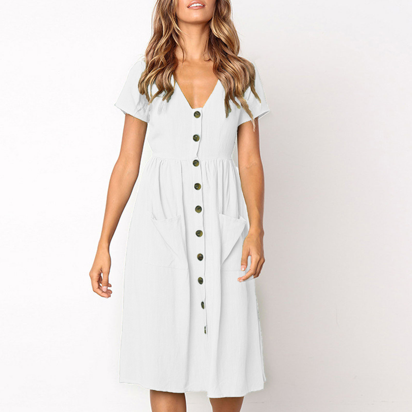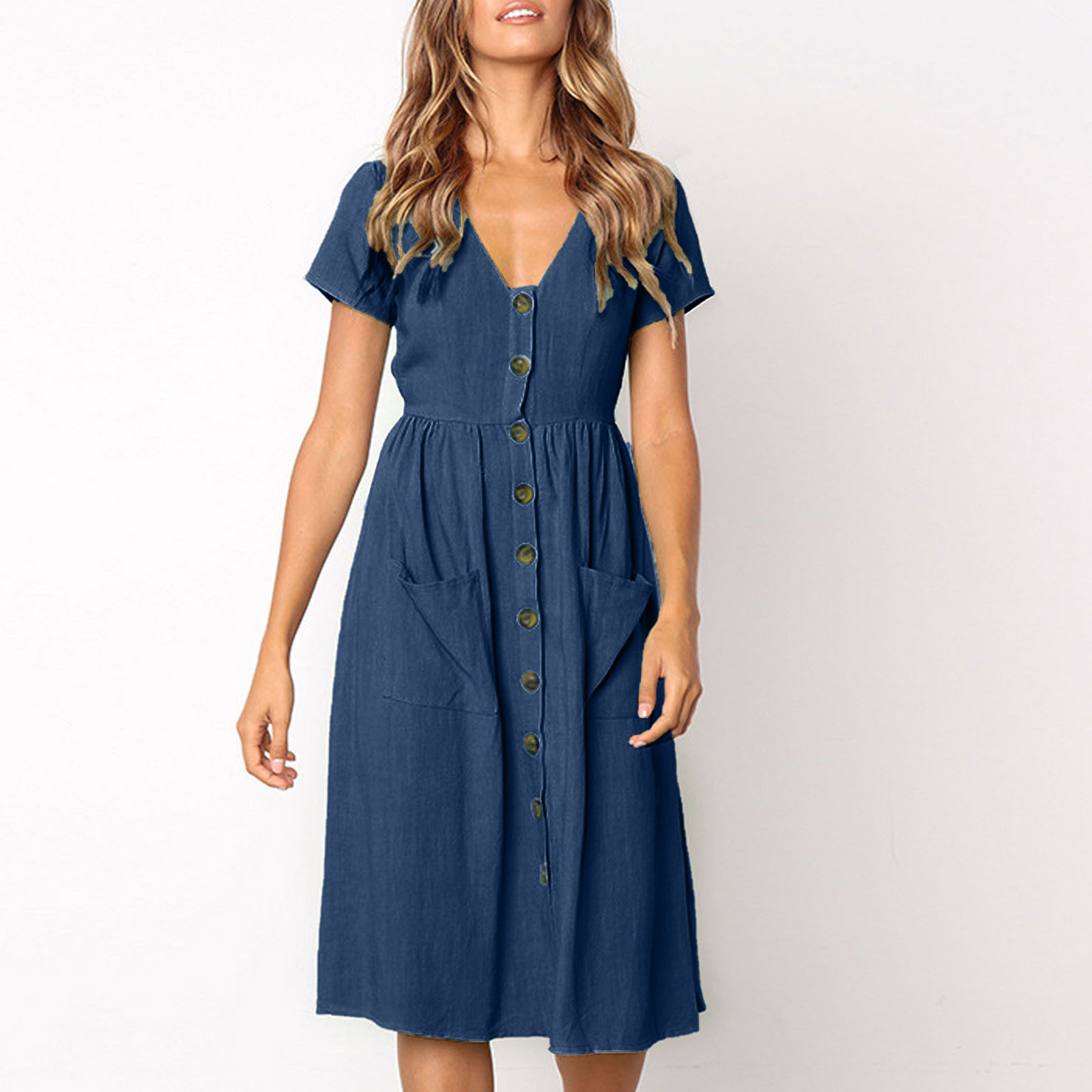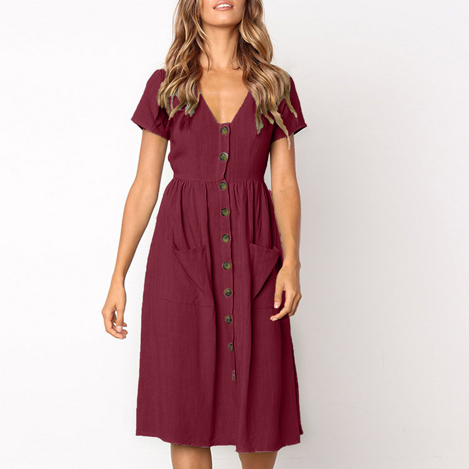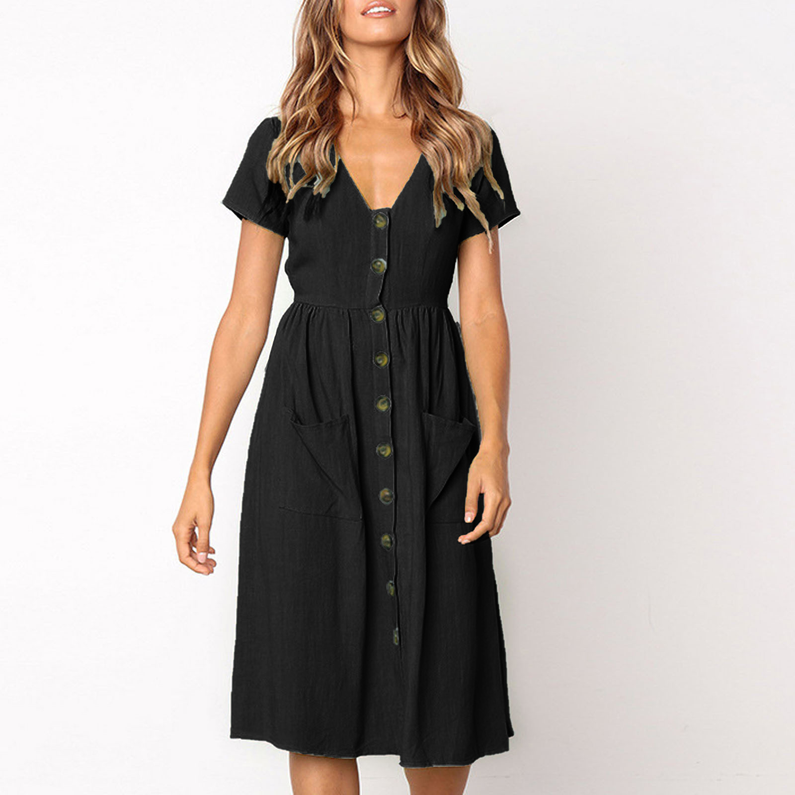 Женское повседневное однотонное платье трапециевидной формы с коротким рукавом и v-образным вырезом и карманами на пуговицах