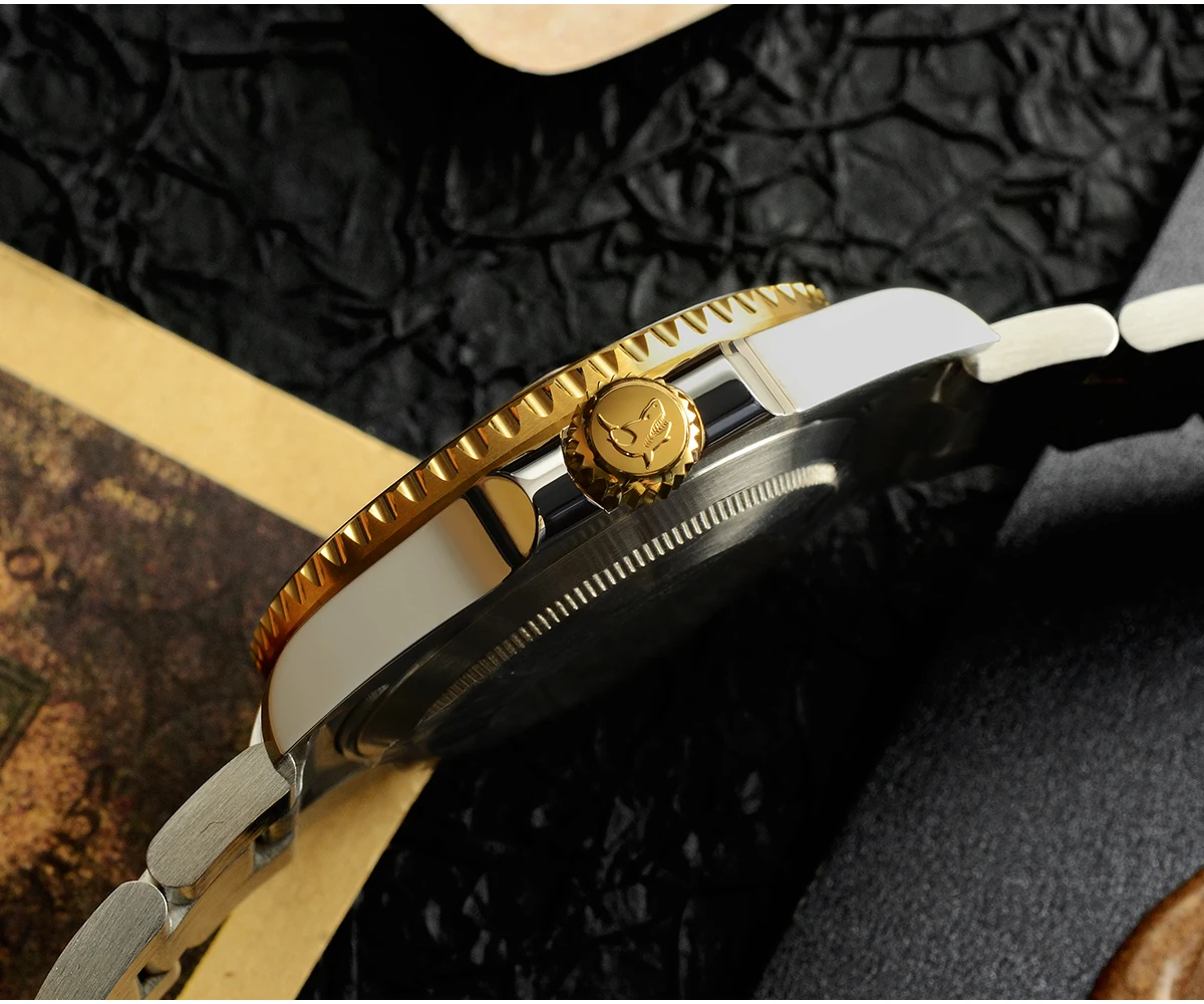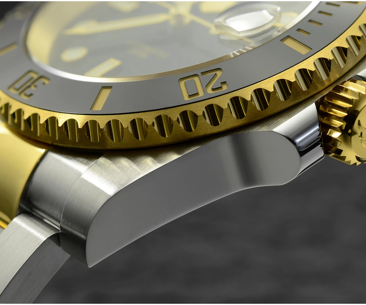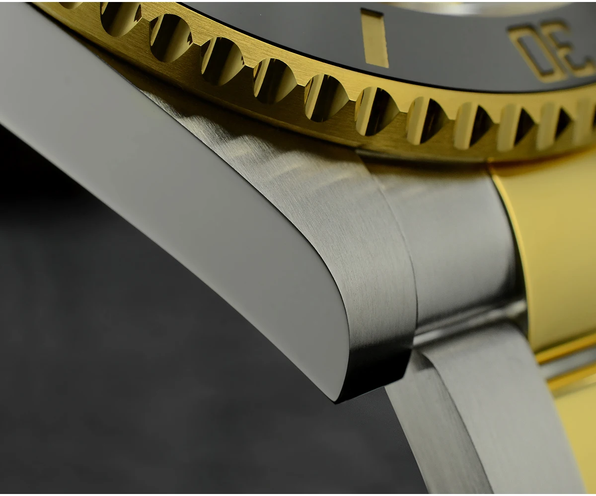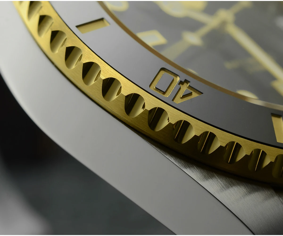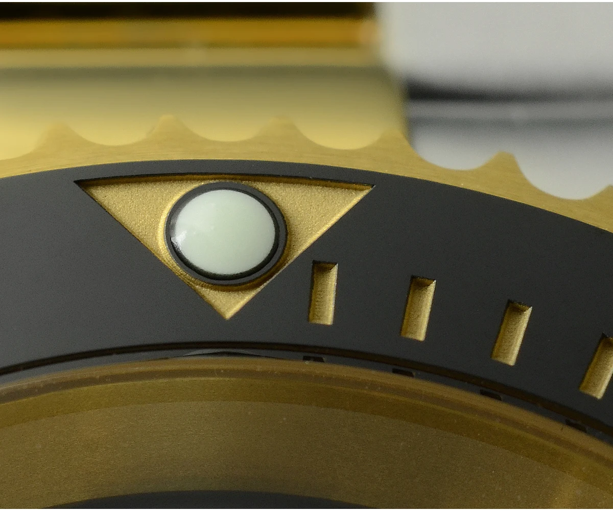 Безель: 120 кликов Золотой PVD однонаправленный Безель хронографа, керамическое верхнее кольцо, светящиеся маркеры 12 часов