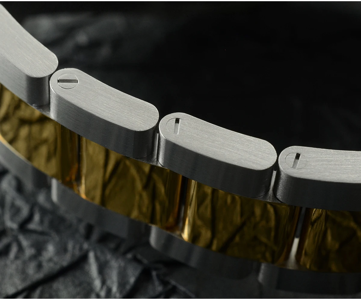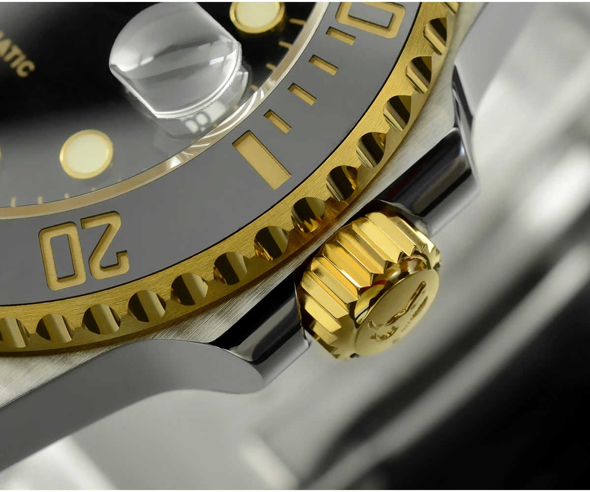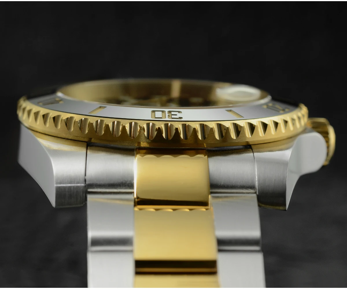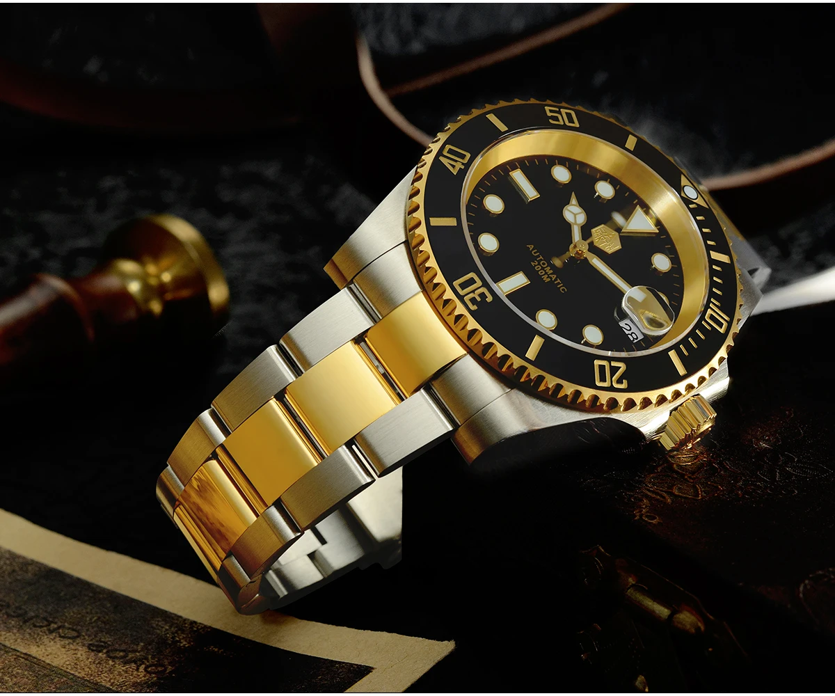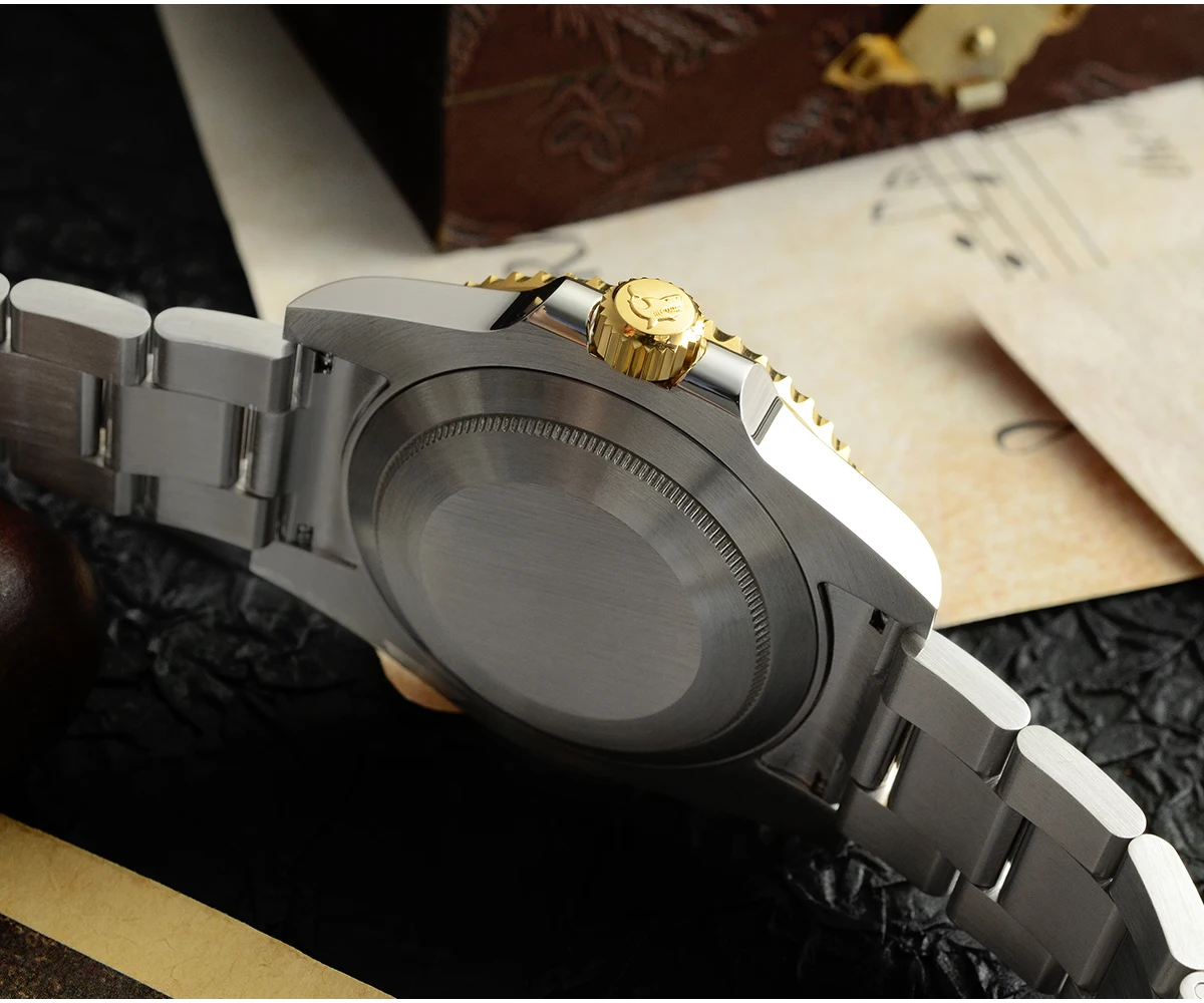 Безель: 120 кликов Золотой PVD однонаправленный Безель хронографа, керамическое верхнее кольцо, светящиеся маркеры 12 часов