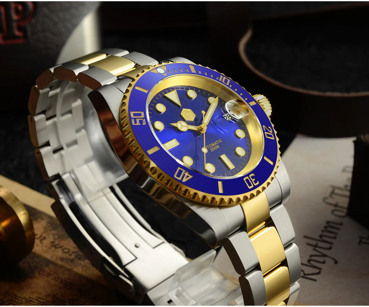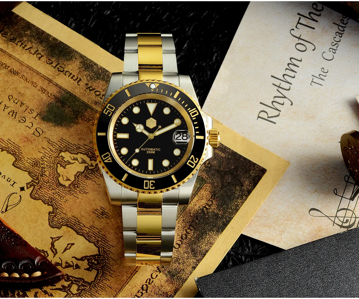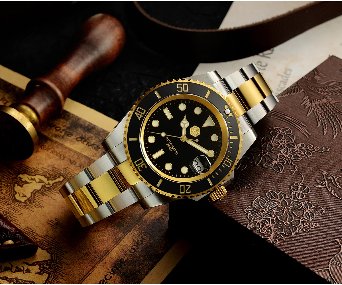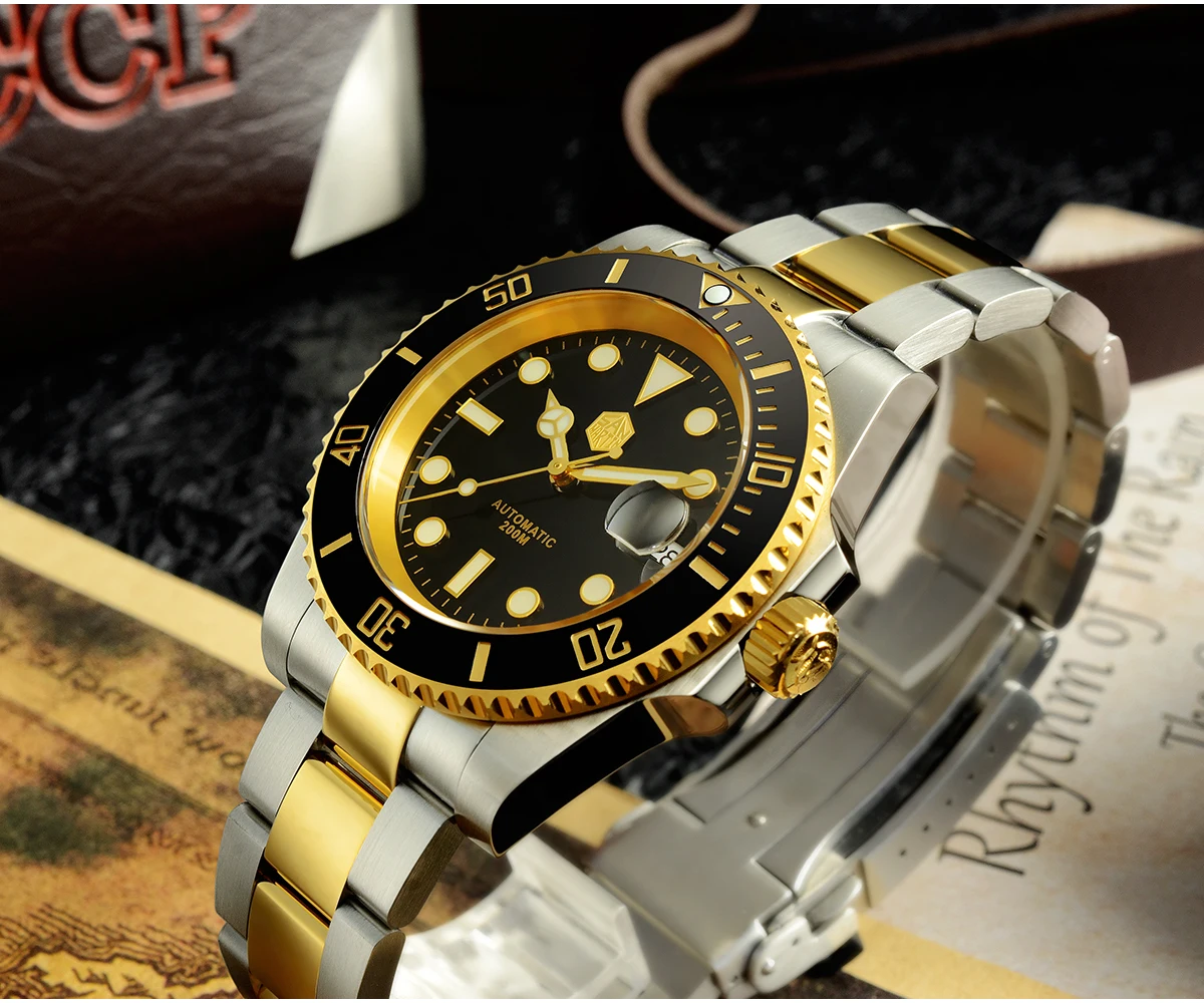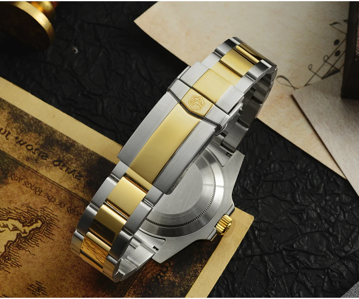 Безель: 120 кликов Золотой PVD однонаправленный Безель хронографа, керамическое верхнее кольцо, светящиеся маркеры 12 часов
