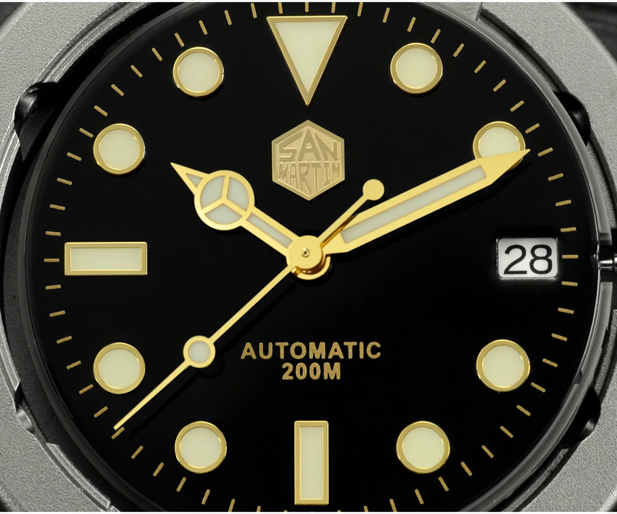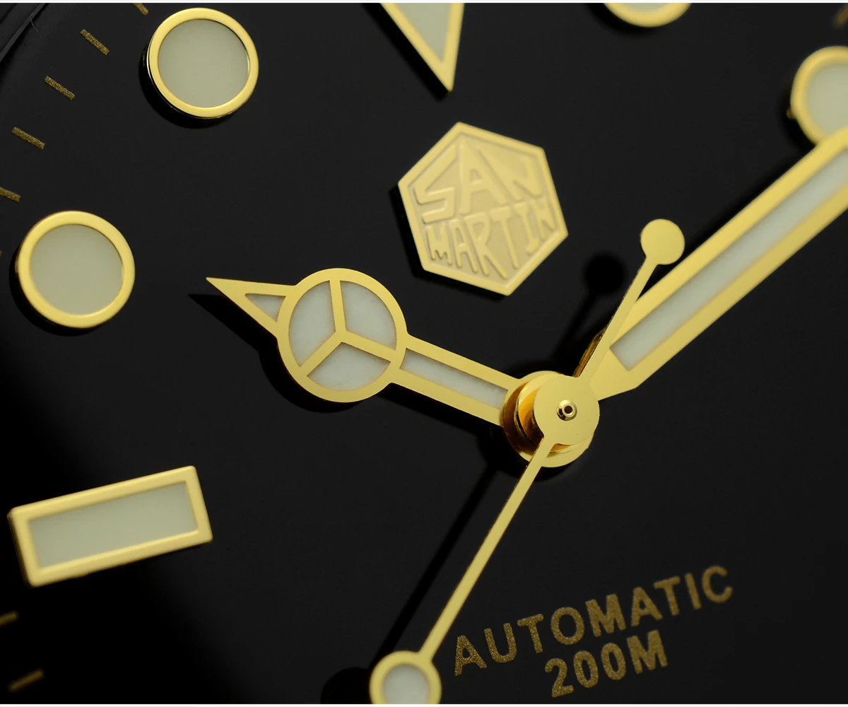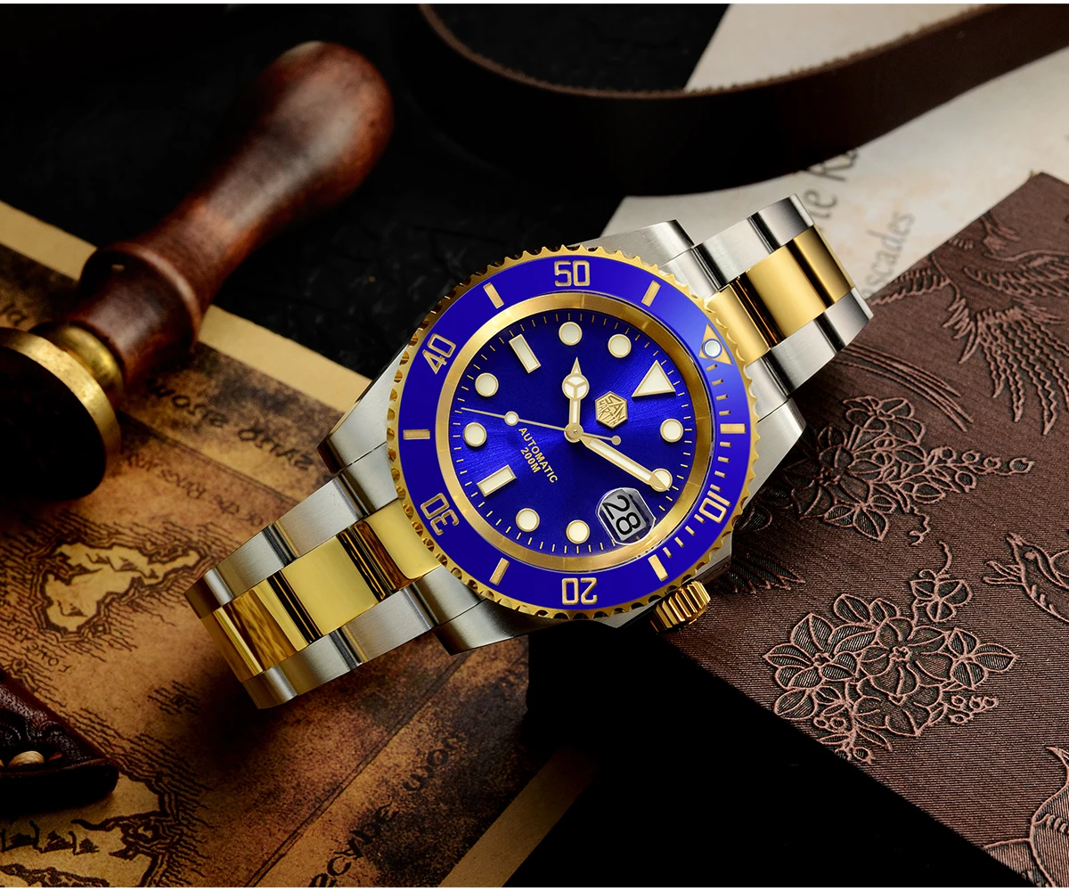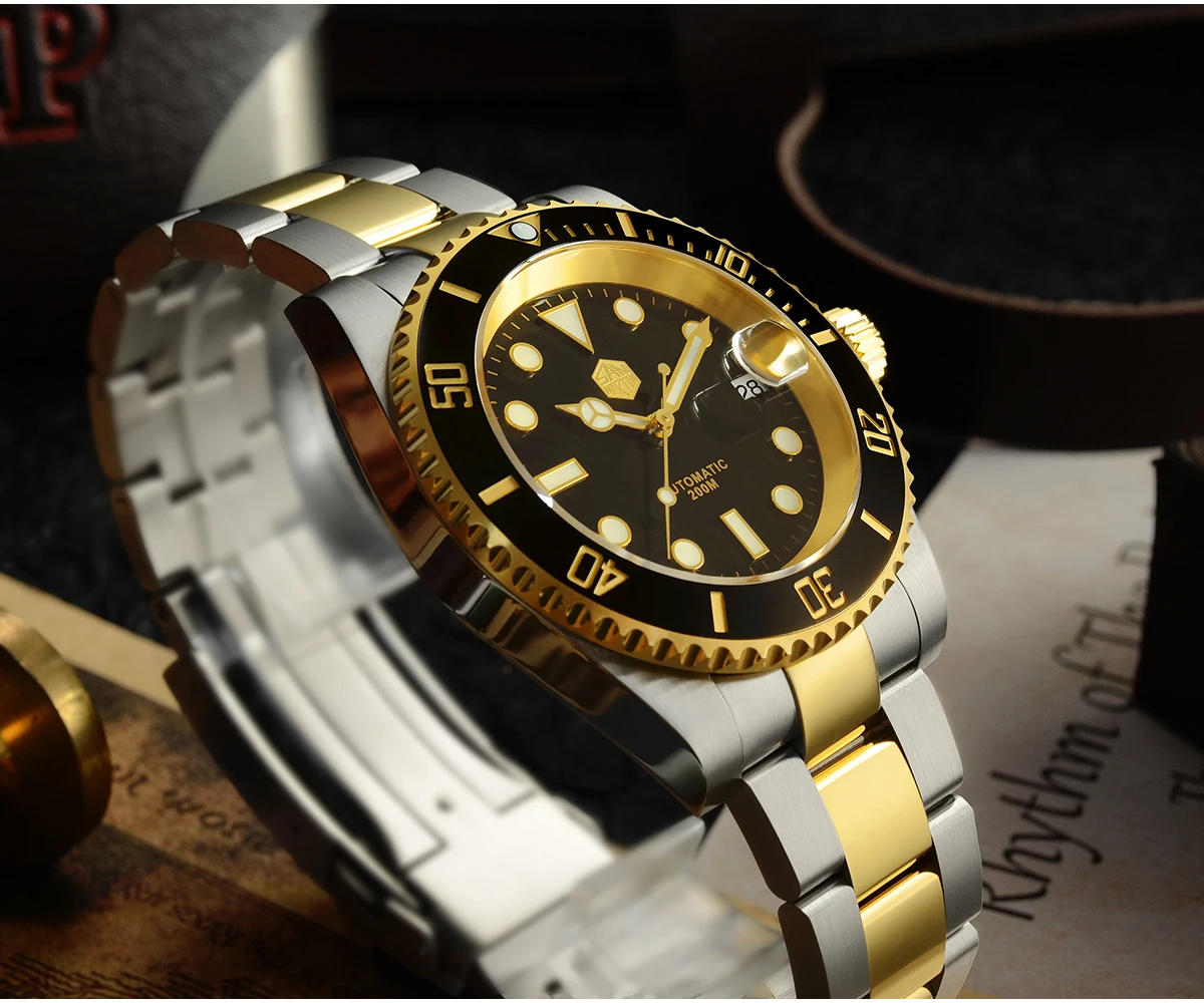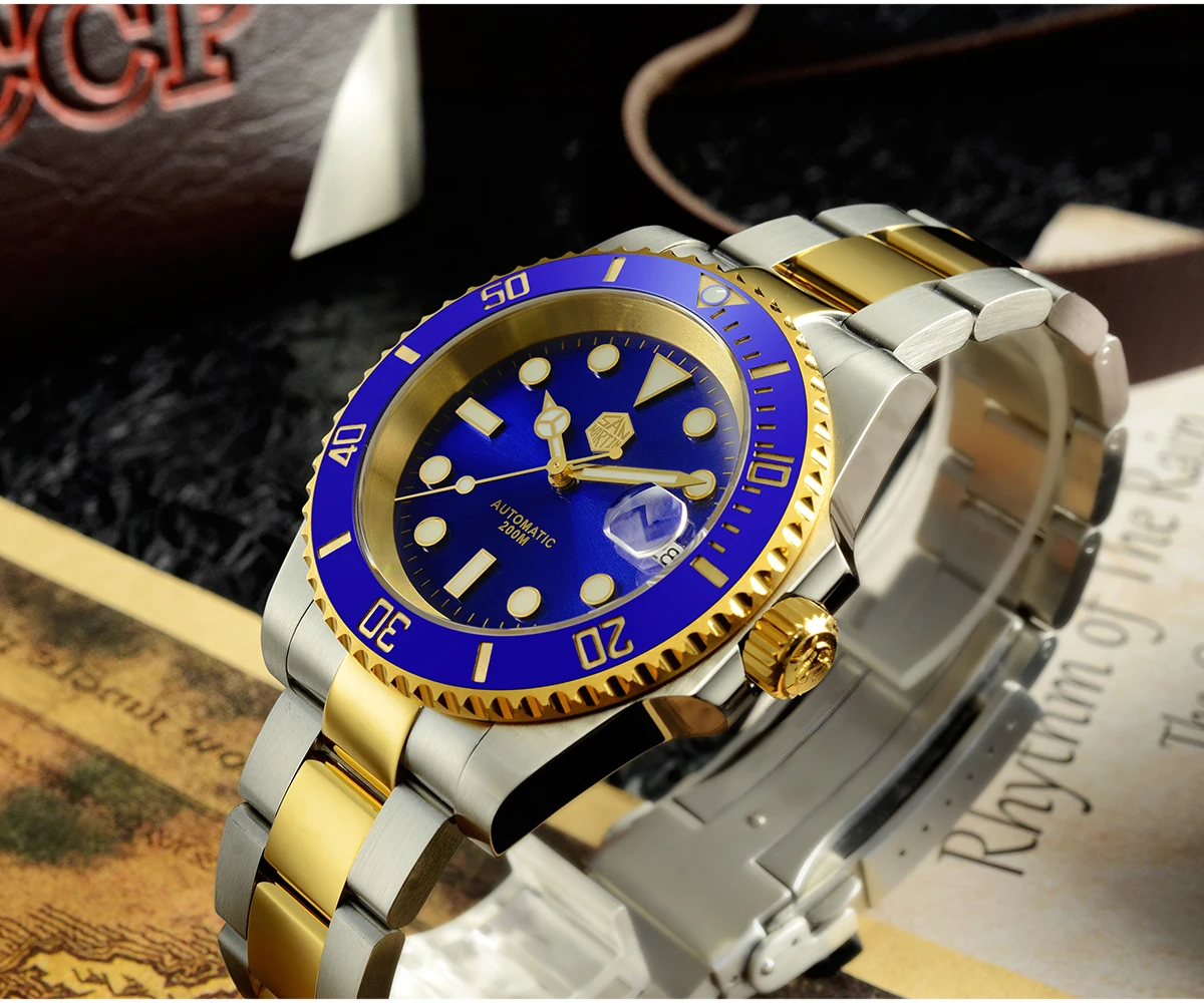 Безель: 120 кликов Золотой PVD однонаправленный Безель хронографа, керамическое верхнее кольцо, светящиеся маркеры 12 часов