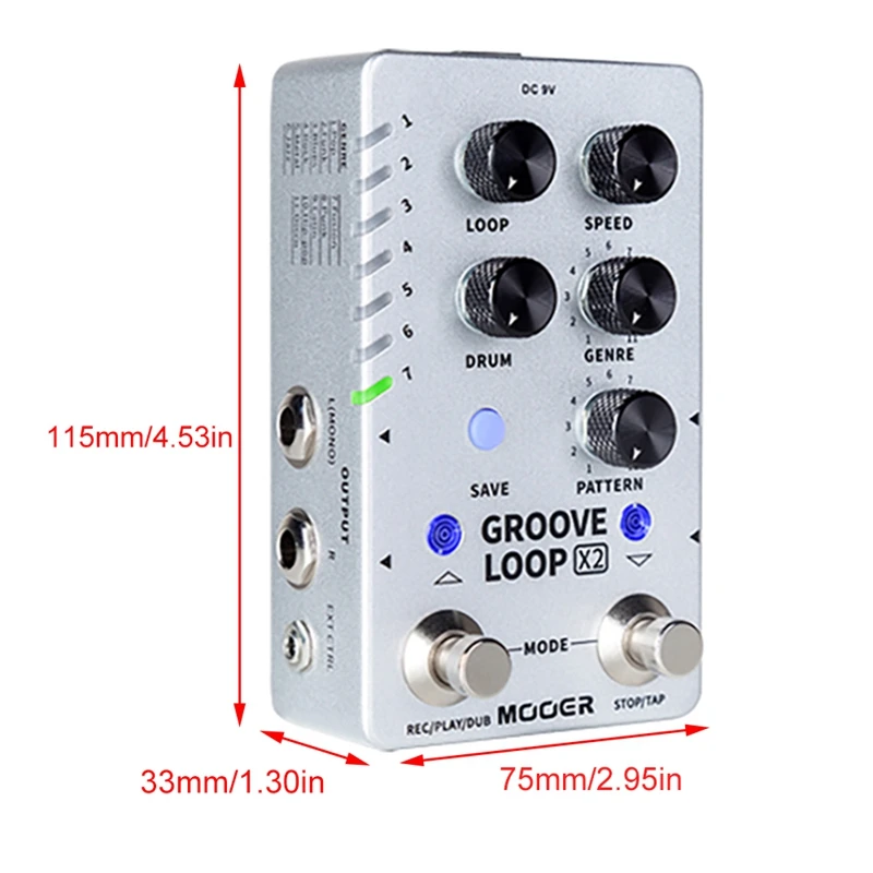 Стерео барабанная машина Groove loop X2 фраза loop single block имеет 14 мест хранения стерео аудио, которые поддерживают время записи до 10 минут и барабанную машину с 121 ритмом в 11 стилях. Он также имеет функцию «растягивания времени», которая автоматически выравнивает барабанную машину с помощью фразы и изменяет оригинальную мелодию звука.