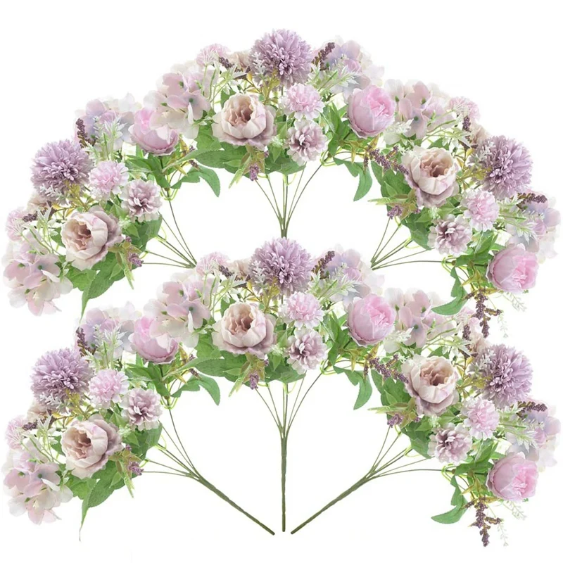 6 пучков фиолетовых искусственных цветов, с шелковой гортензией, пионами, гвоздиками и несколькими пузырьками цветов, многослойные элегантные фиолетовые лепестки с плотной текстурой, которые закончили настоящий вид. Ваза предназначена только для демонстрации и не входит в комплект.