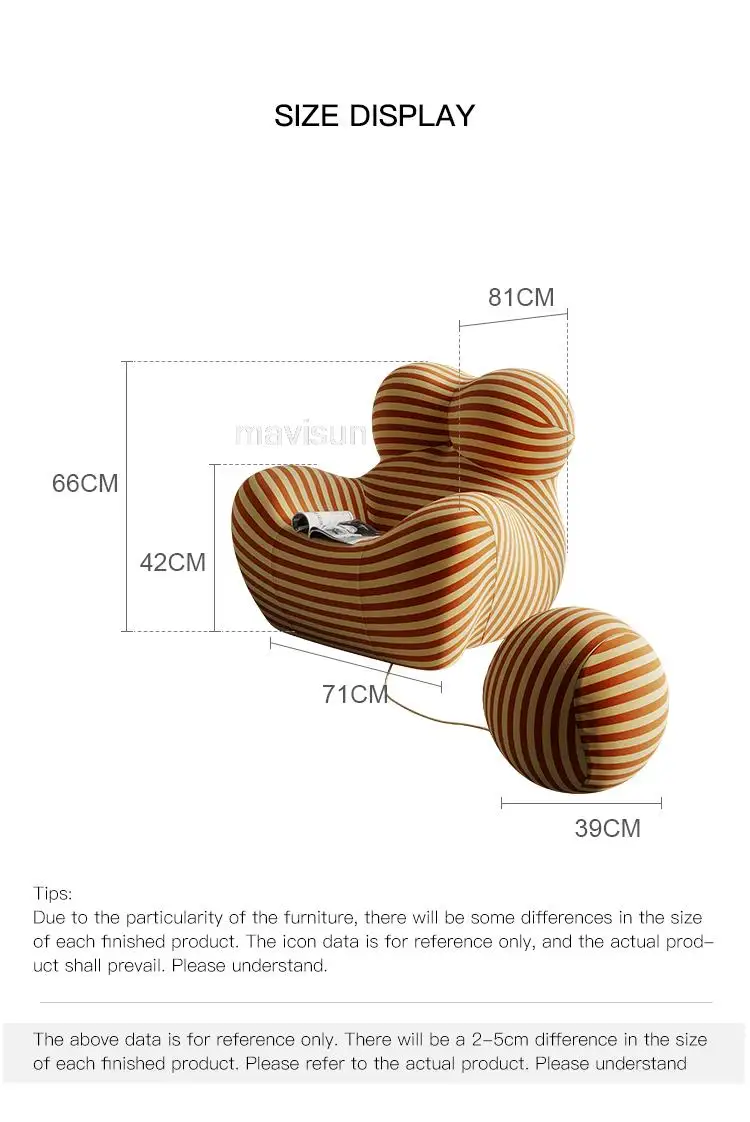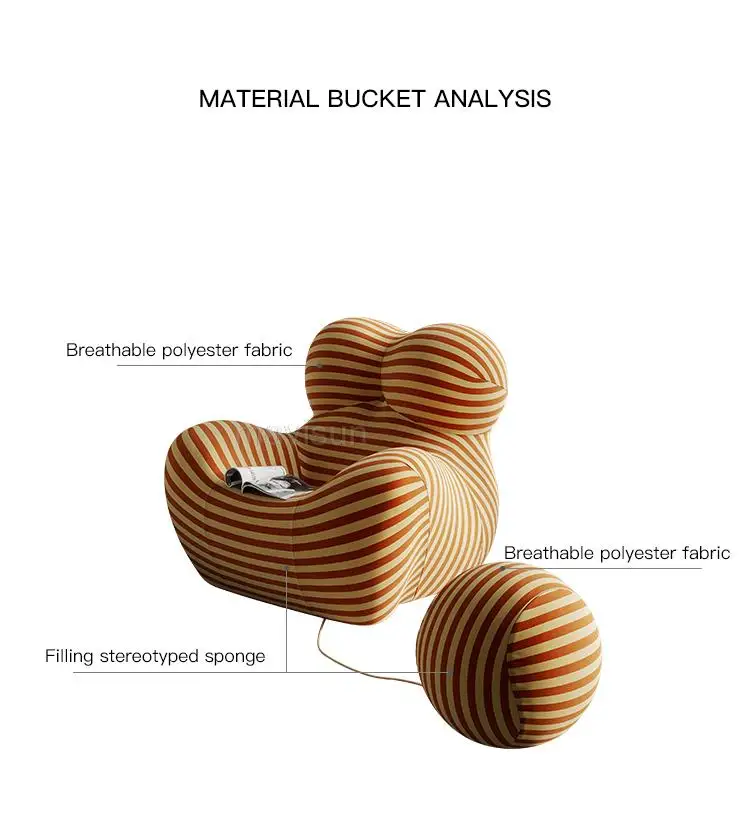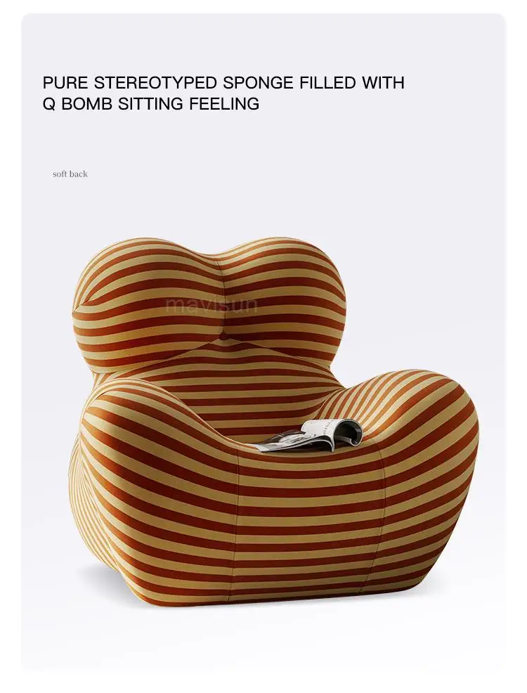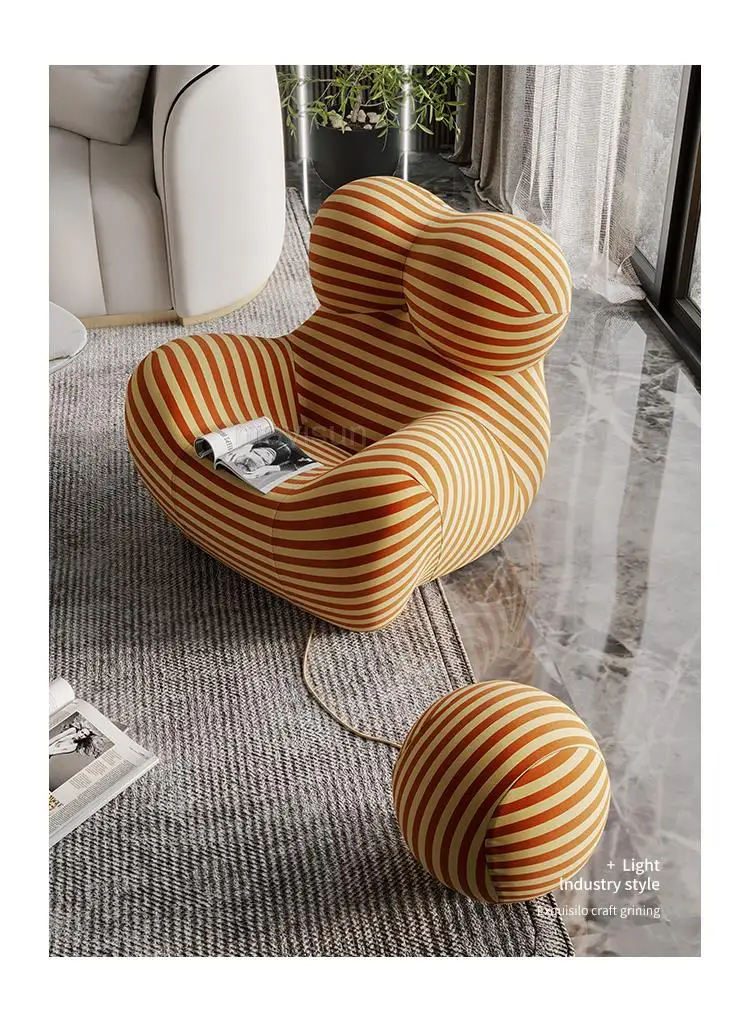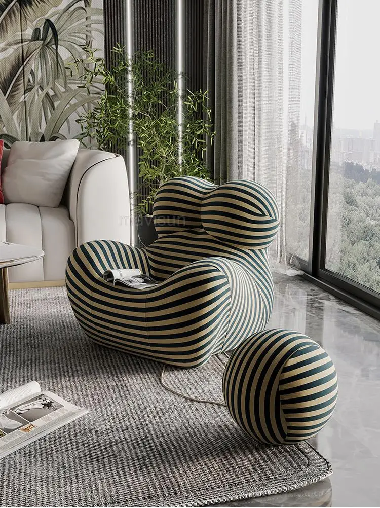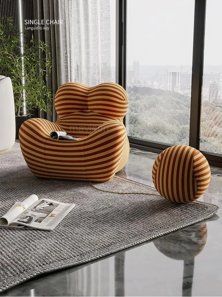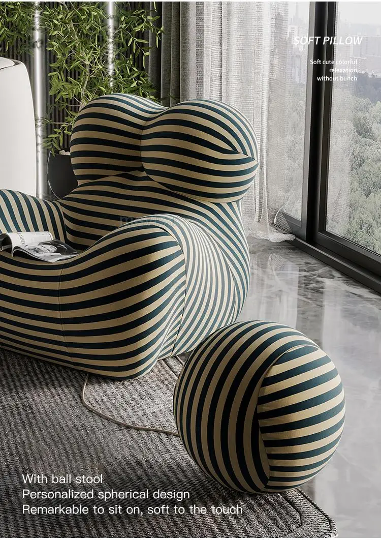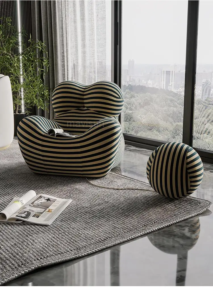A. Одиночный стул сочетается с сферическим табуретом, который уникален по форме и мягкий на ощупь.