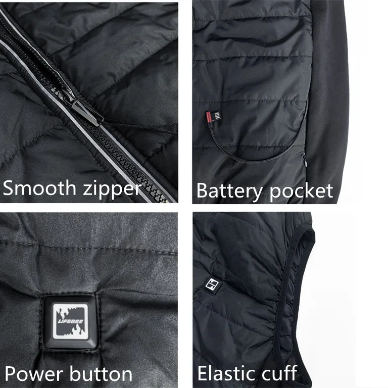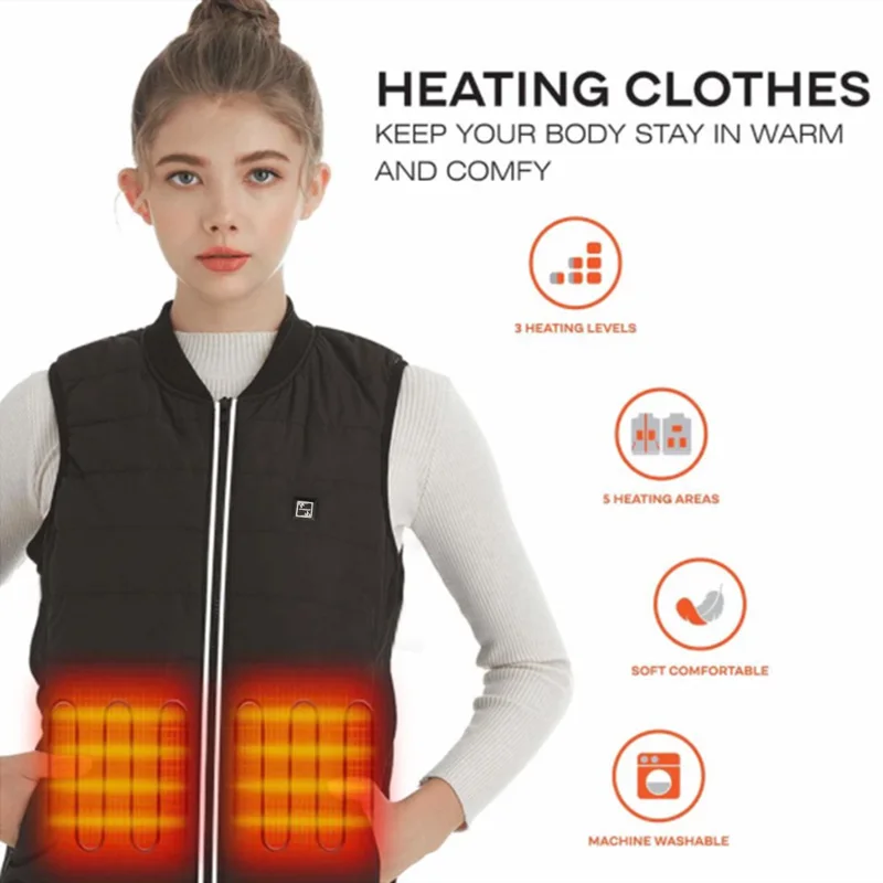 4. Нагревательный элемент пришит в соответствии с важными частями человеческого тела. Он соединен с кнопкой с трехступенчатой умной системой контроля температуры и источником питания для регулировки температуры и нагрева для достижения эффекта сопротивления сильному холоду. Температура может регулироваться самостоятельно.