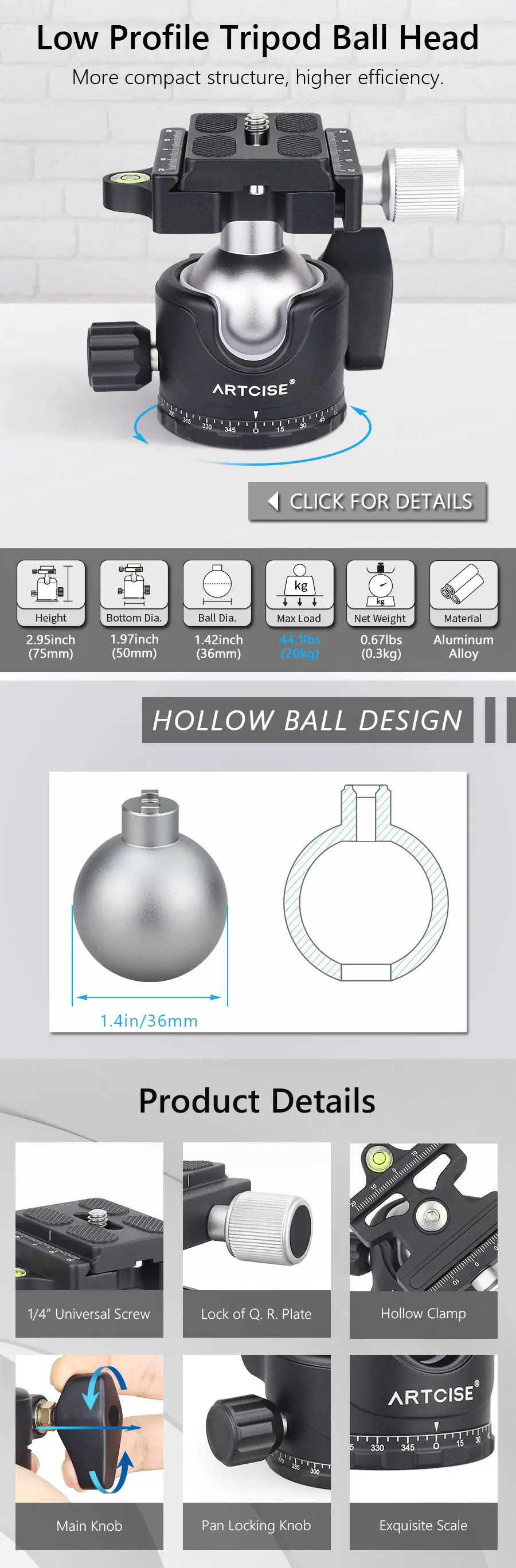 Специально разработанная металлическая шаровая Головка 36 мм может вращаться на 360 градусов, что позволит вам получить идеальный угол съемки для создания панорамной фотографии.