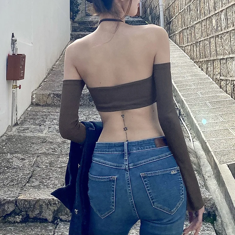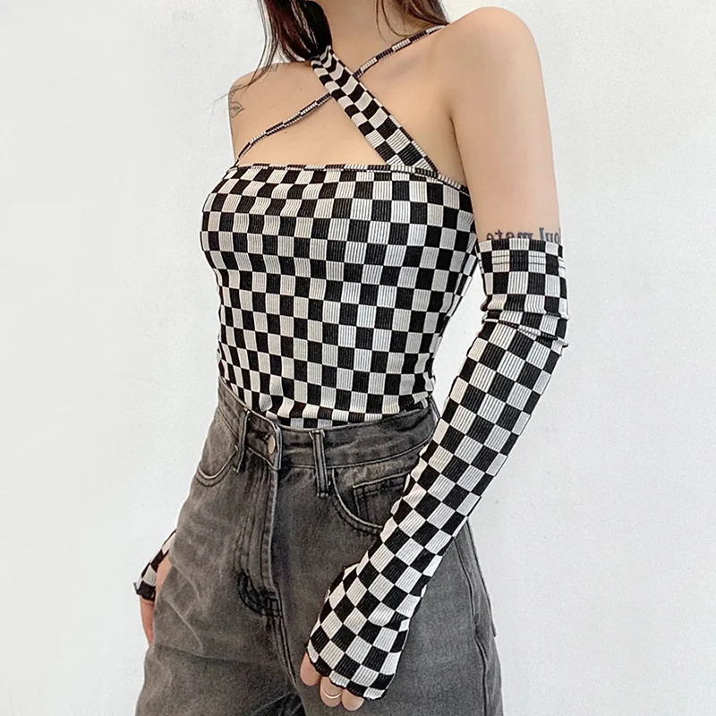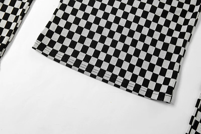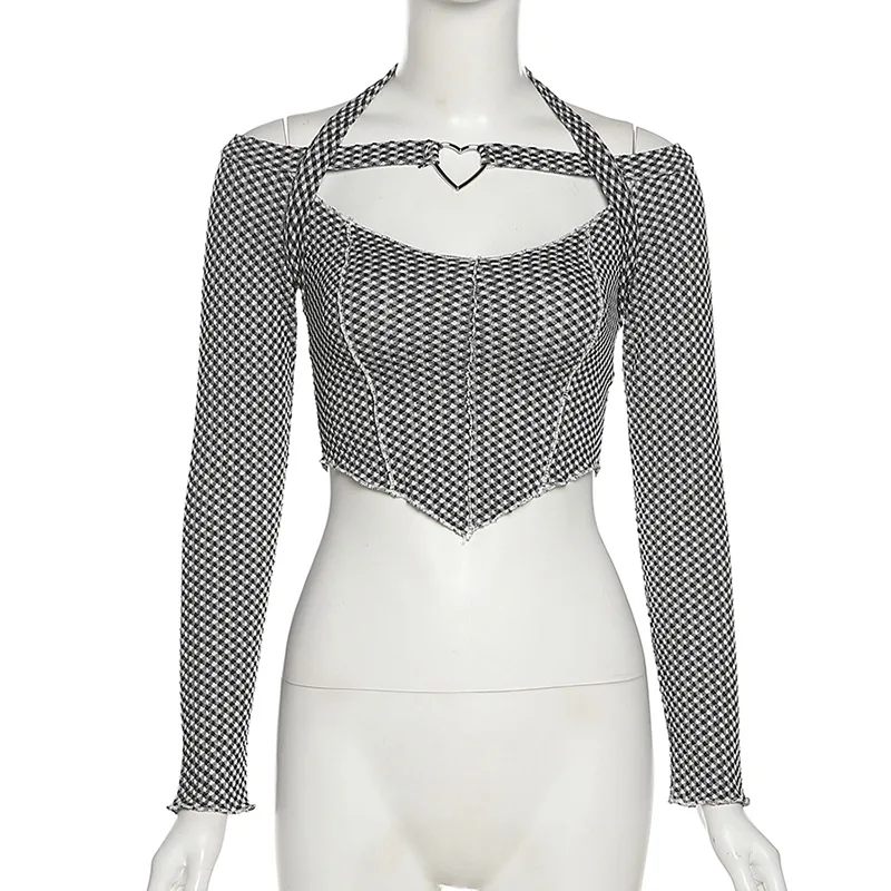 Сексуальные открытые футболки для женщин в стиле панк, топ с длинными рукавами, осенняя уличная одежда, футболки с вырезом лодочкой, готический клетчатый топ с принтом для женщин